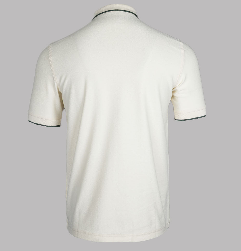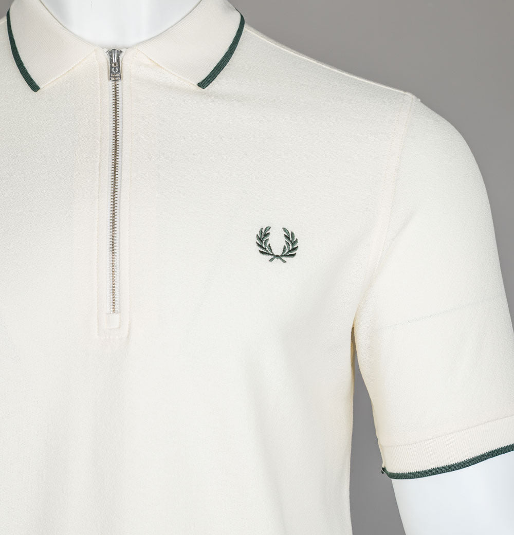 Fred Perry short sleeve crepe pique polo shirt in Ecru/Grassroots. Crepe cotton pique fabric. Ribbed collar and sleeve cuffs with single tipping detail. Silver quarter zip. Embroidered Laurel Wreath. Regular fit. 100% cotton.
