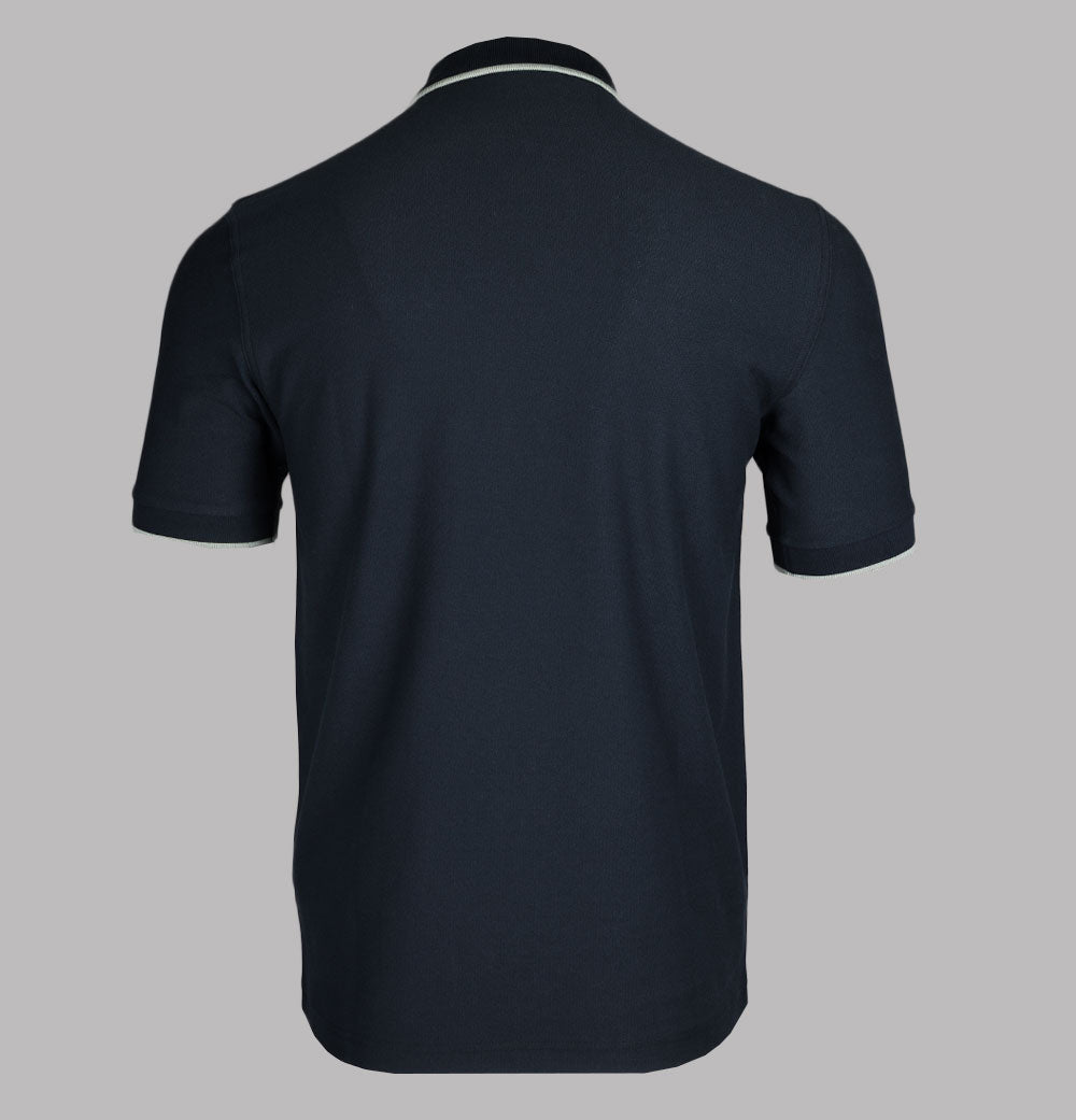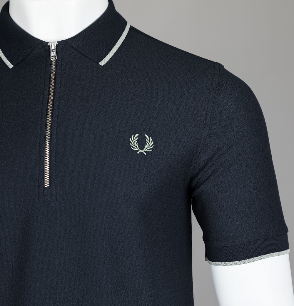 Fred Perry short sleeve crepe pique polo shirt in Navy/Bay Leaf. Crepe cotton pique fabric. Ribbed collar and sleeve cuffs with single tipping detail. Silver quarter zip. Embroidered Laurel Wreath. Regular fit. 100% cotton.