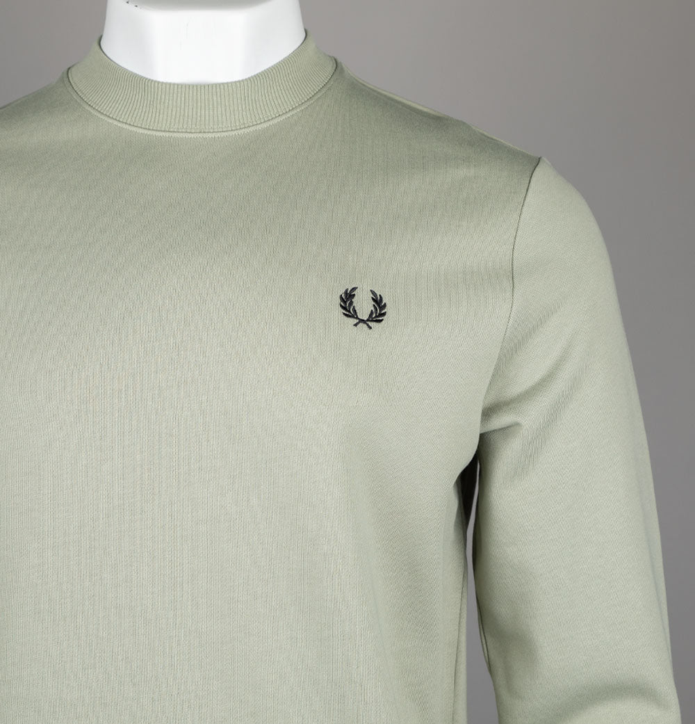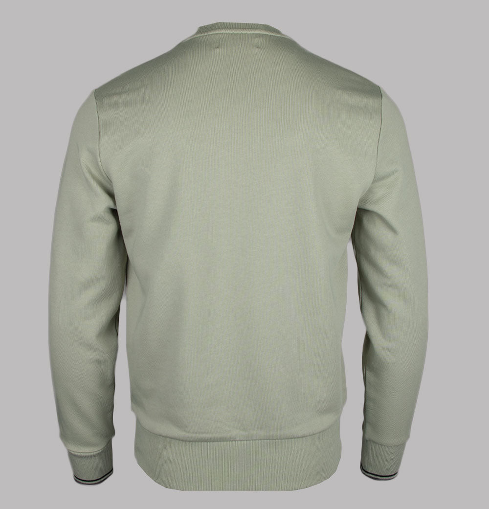 Fred Perry crew neck sweatshirt in Seagrass/Black. Loopback cotton jersey fabric. Ribbed crew neck. Ribbed sleeve cuffs with twin stripe detail. Embroidered Laurel Wreath on the chest. Ribbed waistband. Regular fit. 100% cotton.