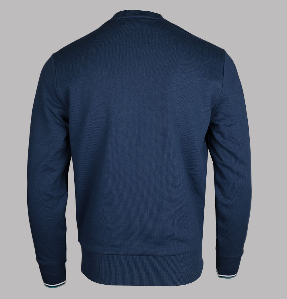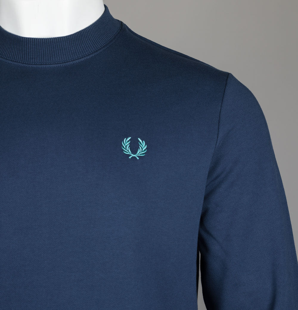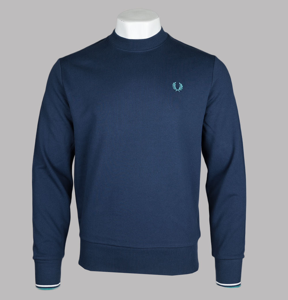 Fred Perry crew neck sweatshirt in Tennis Blue/Snow White/Deep Mint. Loopback cotton jersey fabric. Ribbed crew neck. Ribbed sleeve cuffs with twin stripe detail. Embroidered Laurel Wreath on the chest. Ribbed waistband. Regular fit. 100% cotton.