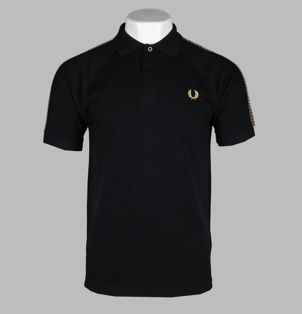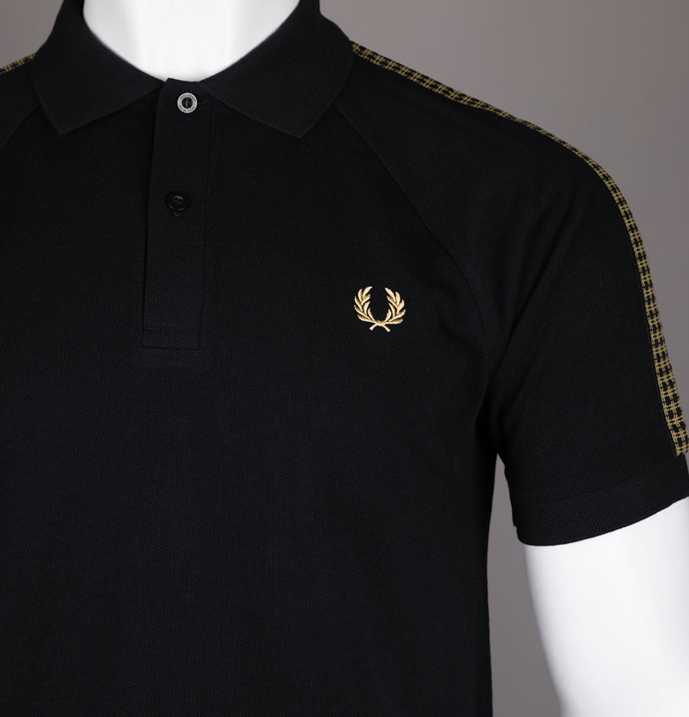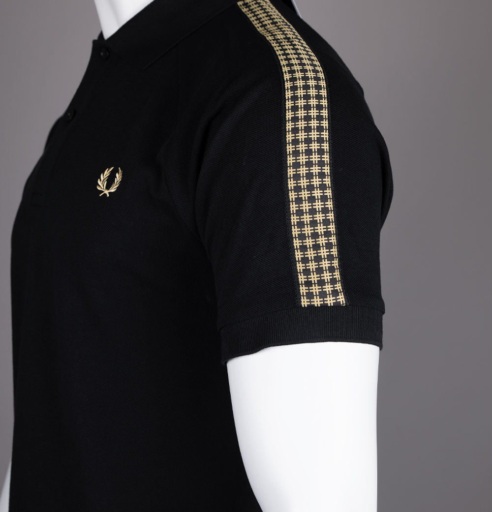 Fred Perry short sleeve cross tape polo shirt in Black. Premium cotton pique fabric. Two button placket. Ribbed collar and sleeve cuffs. Cross tape detail on the shoulders and sleeves. Embroidered Laurel Wreath. Regular fit. 100% cotton.