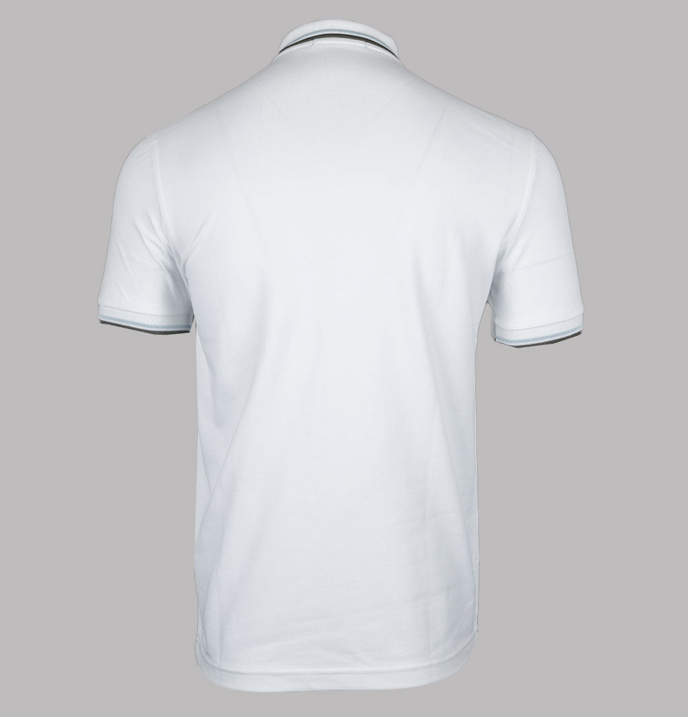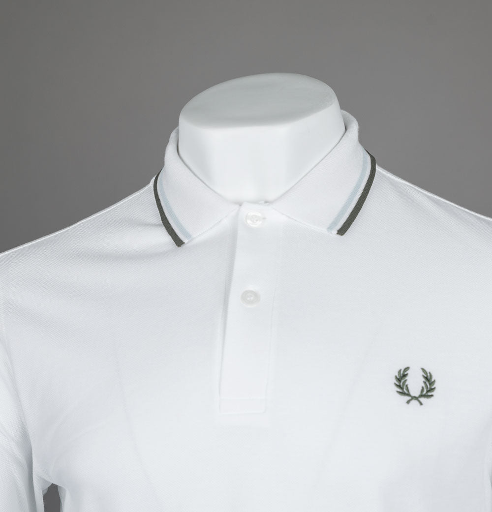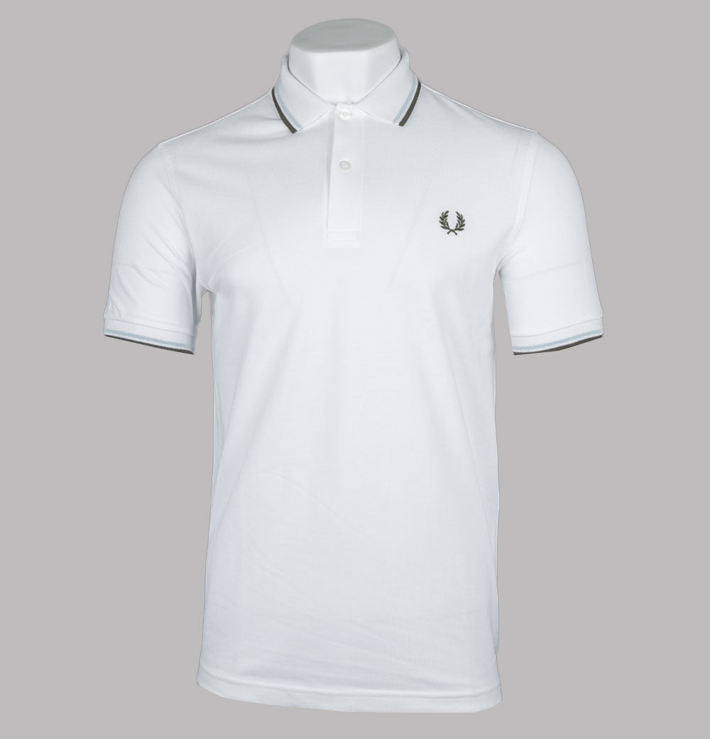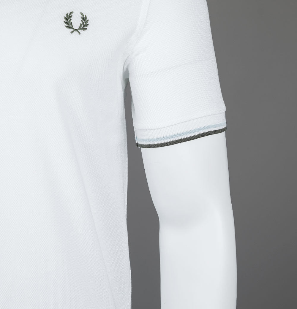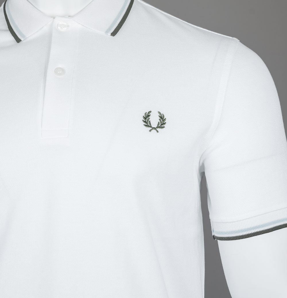 Fred Perry M3600 twin tipped short sleeve polo shirt. White premium cotton pique fabric. Two button placket with signature Fred Perry branded buttons. Twin tipped collar and arm cuffs in Light Ice and Green. Embroidered Laurel Wreath on the chest in Green. Regular fit. 100% cotton pique.