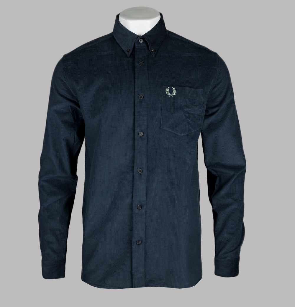 Fred Perry long sleeve Needle Cord shirt in Dark Airforce. Fine wale cotton corduroy fabric. Classic button down collar. Patch chest pocket with embroidered Laurel Wreath. Regular fit. 100% cotton.