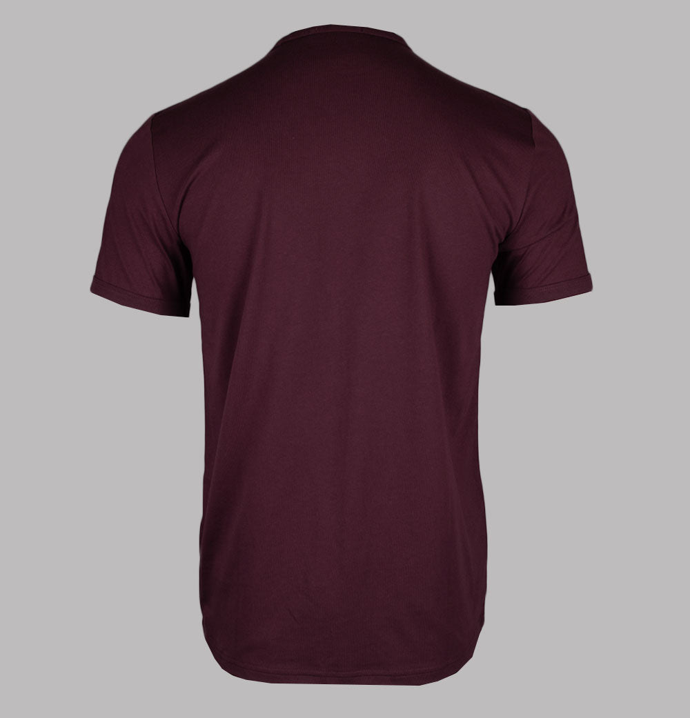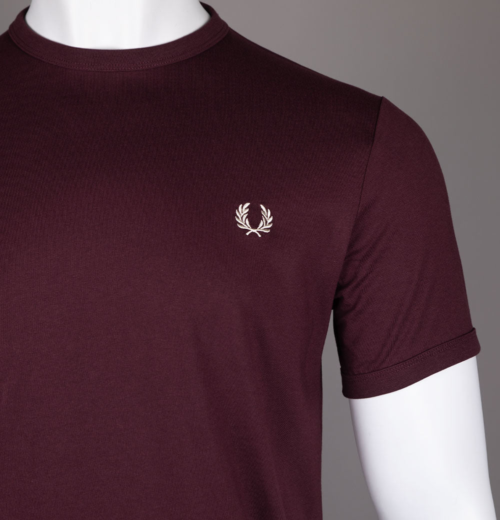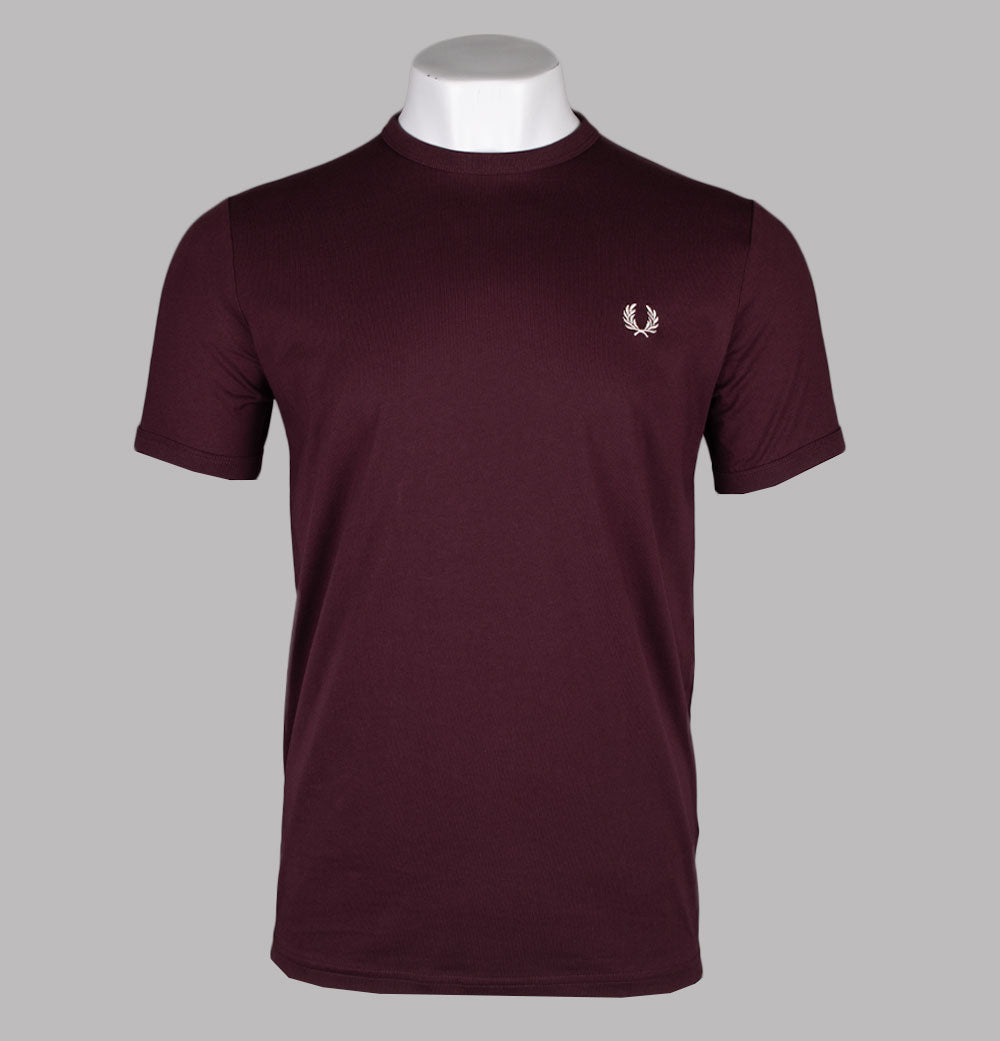 Fred Perry short sleeve ringer t-shirt in Oxblood. Premium cotton jersey fabric. Ribbed crew neck and sleeve cuffs. Embroidered Laurel Wreath. Regular fit. 100% cotton.
