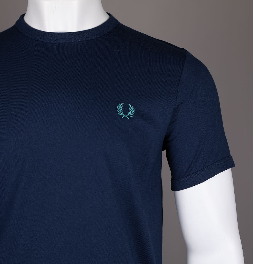 Fred Perry short sleeve ringer t-shirt in Tennis Blue. Premium cotton jersey fabric. Ribbed crew neck and sleeve cuffs. Embroidered Laurel Wreath. Regular fit. 100% cotton.