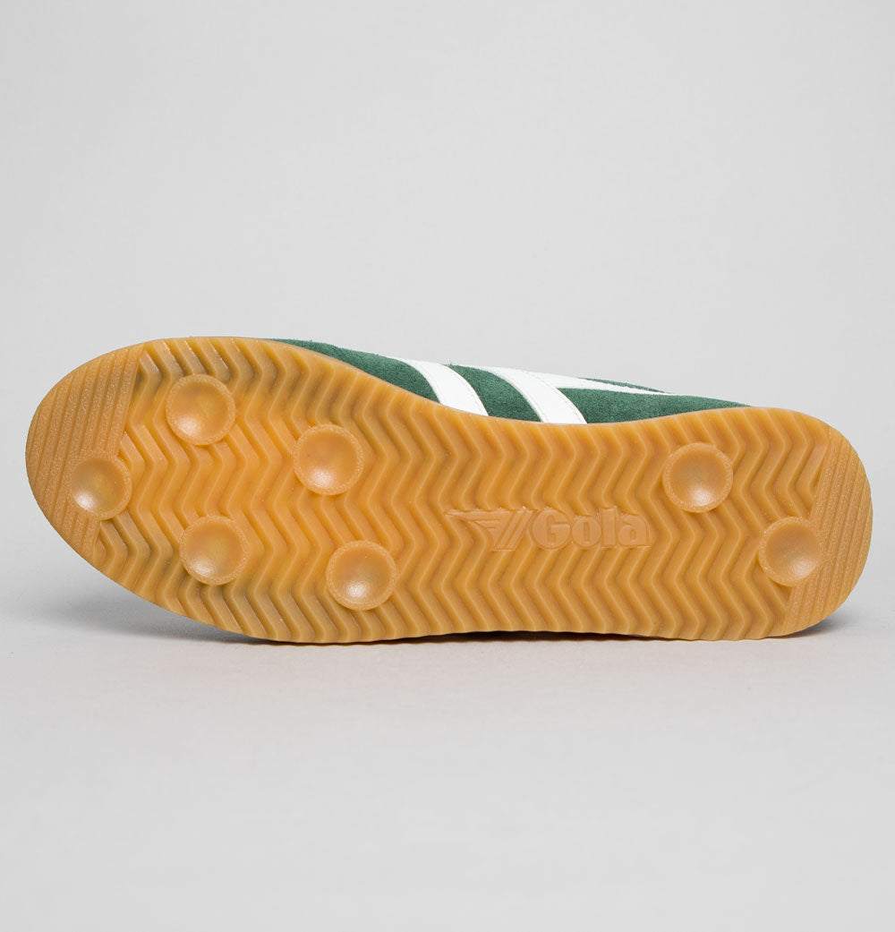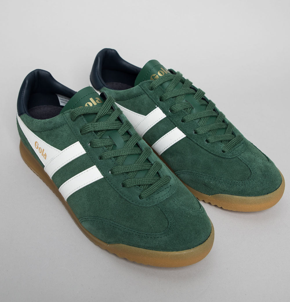 Gola Torpedo suede trainers. Evergreen premium suede uppers with suede overlays. Off White leather Gola branding on the sides with signature Gold Gola logo. Leather tongue with Gold Gola branding. Navy leather heel tab. Gum rubber soles. All UK standard sizes.