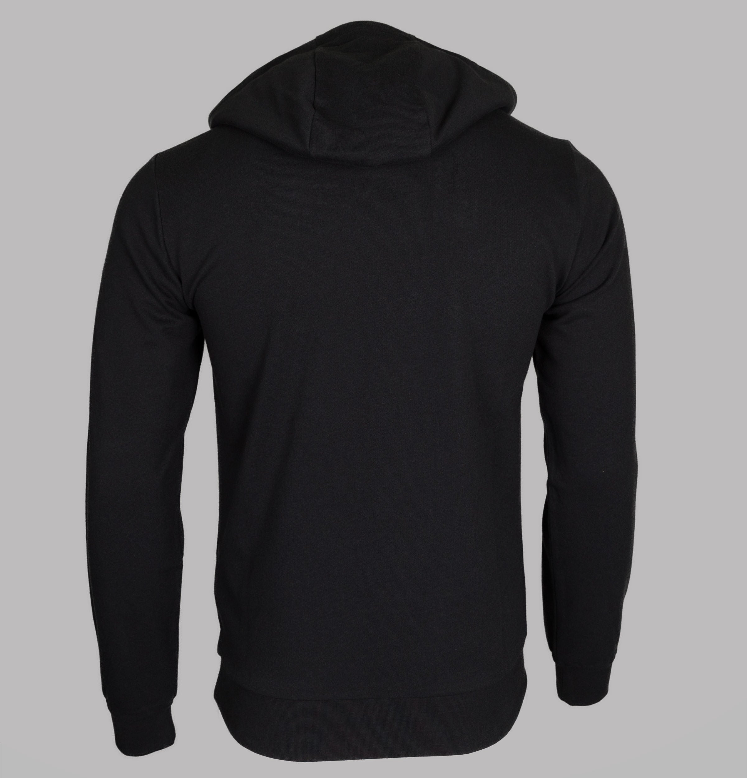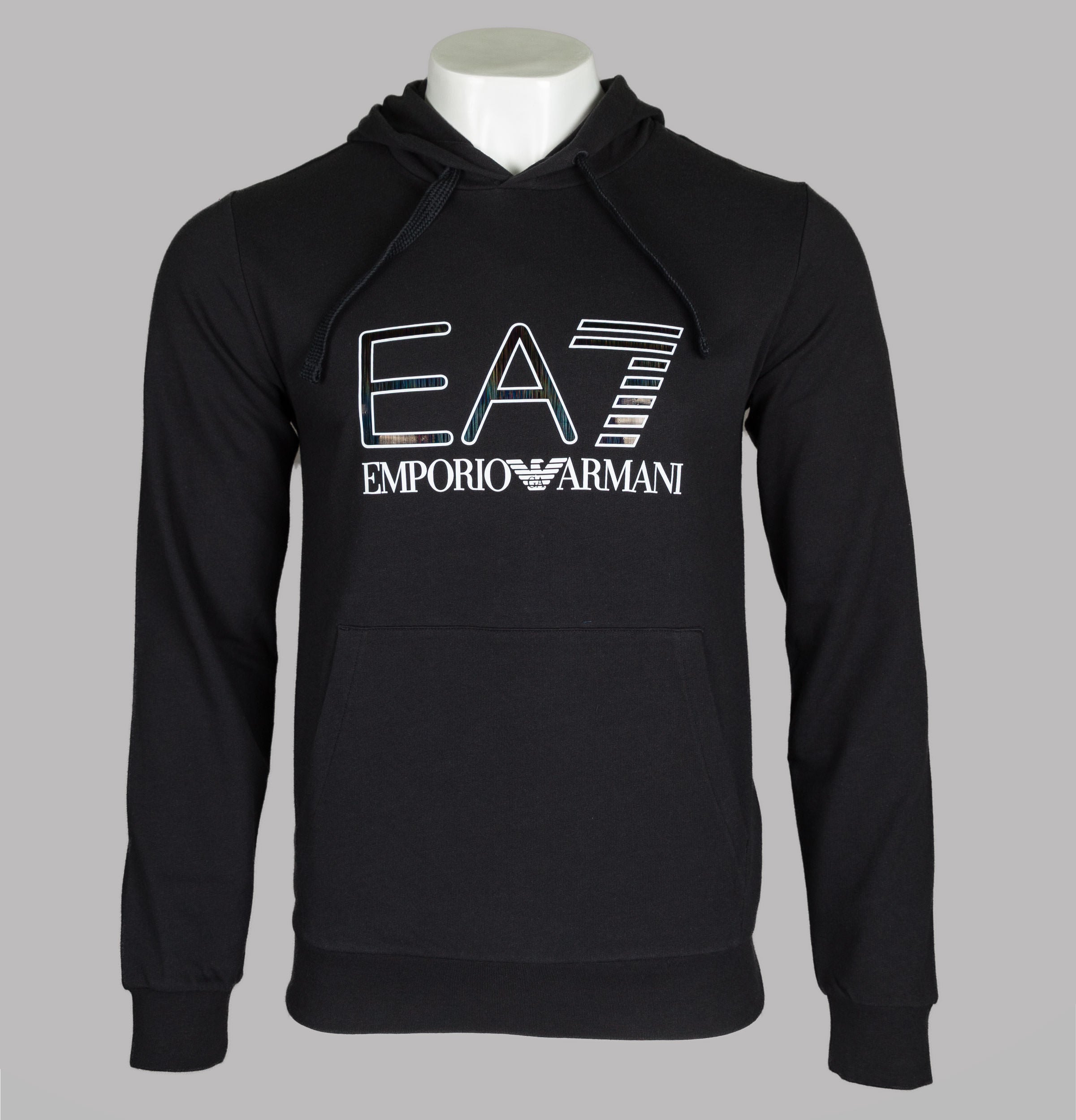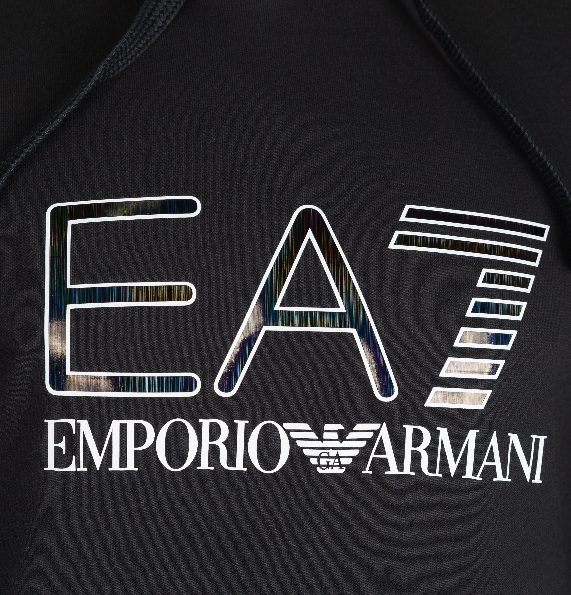 EA7 Emporio Armani iridescent logo hooded sweatshirt. Black lightweight cotton fabric. Draw cord hood with embroidered eyelets. Front kangaroo pouch pocket. Signature EA7 Emporio Armani iridescent logo print on the chest. Ribbed sleeve cuffs and hem. Regular fit. 100% cotton.