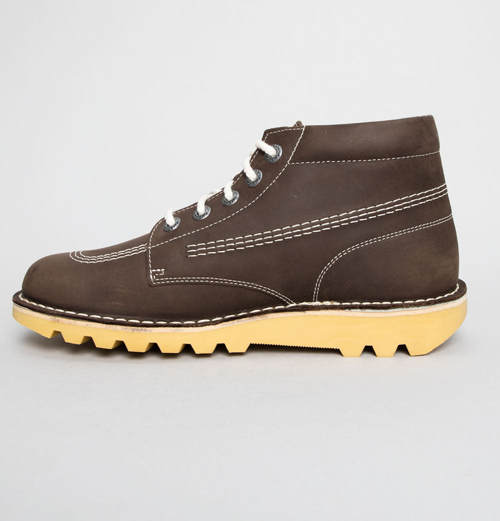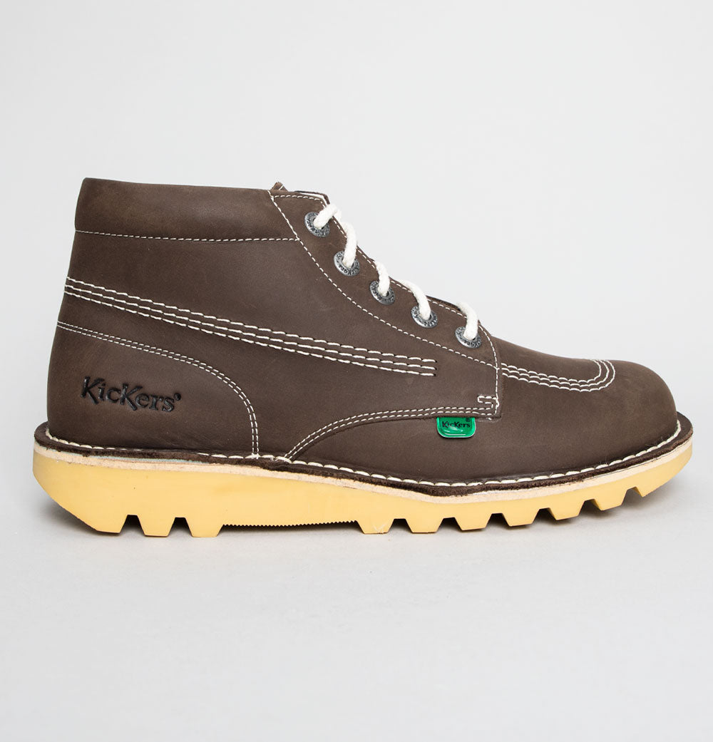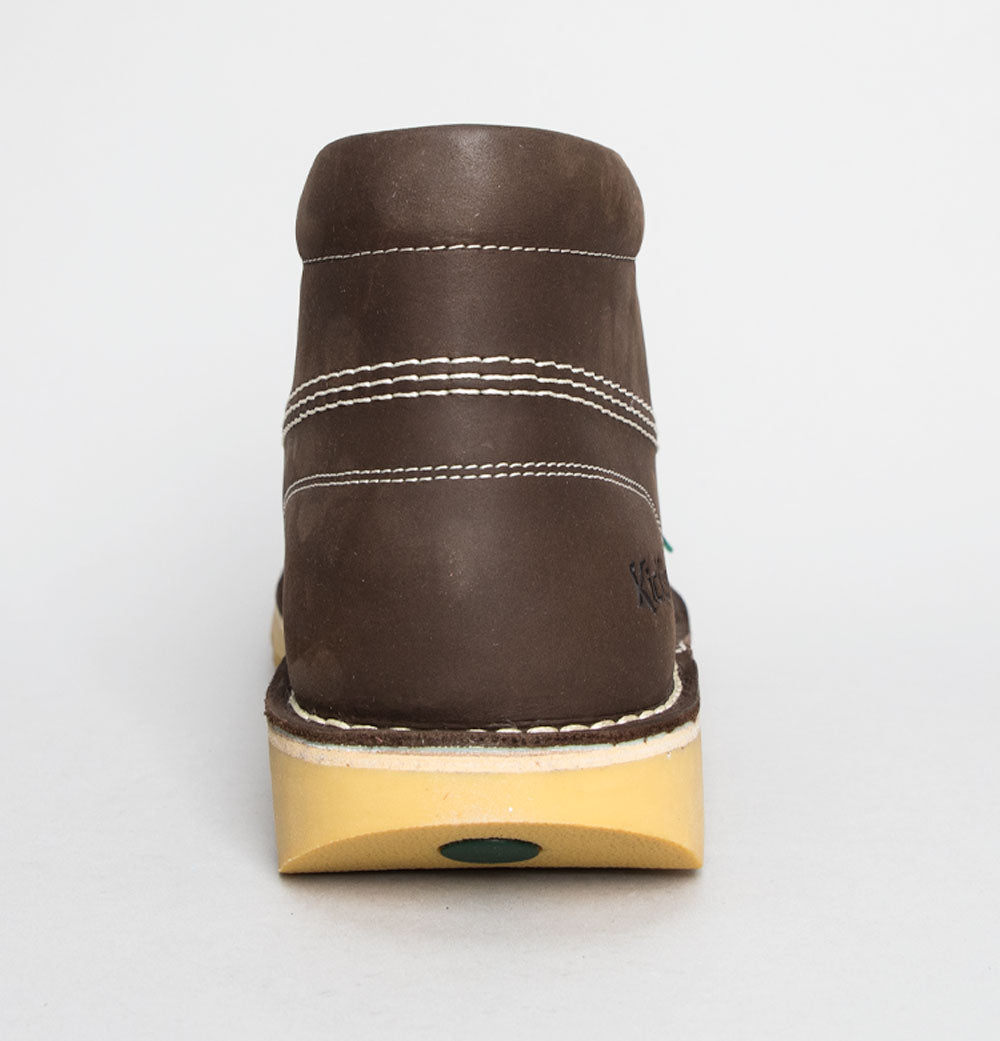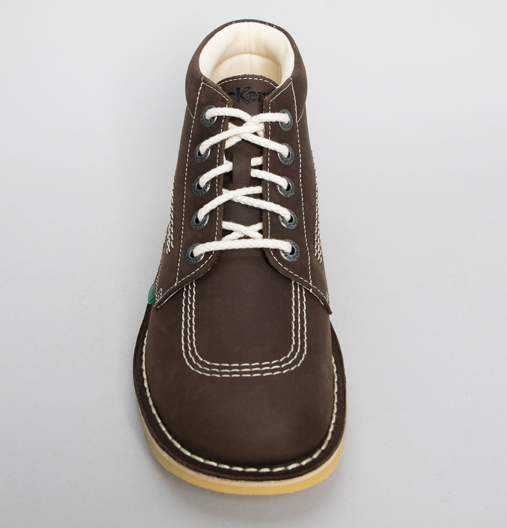 Kickers® Kick Hi classic heritage boots. Brown premium suede leather uppers. Triple stitch detail in White. Rounded laces with branded metal eyelets. Classic leather Kickers® fleurette. Iconic Kickers® Red and Green heel plugs. Natural chunky sole unit. Padded collar. All UK standard sizes.