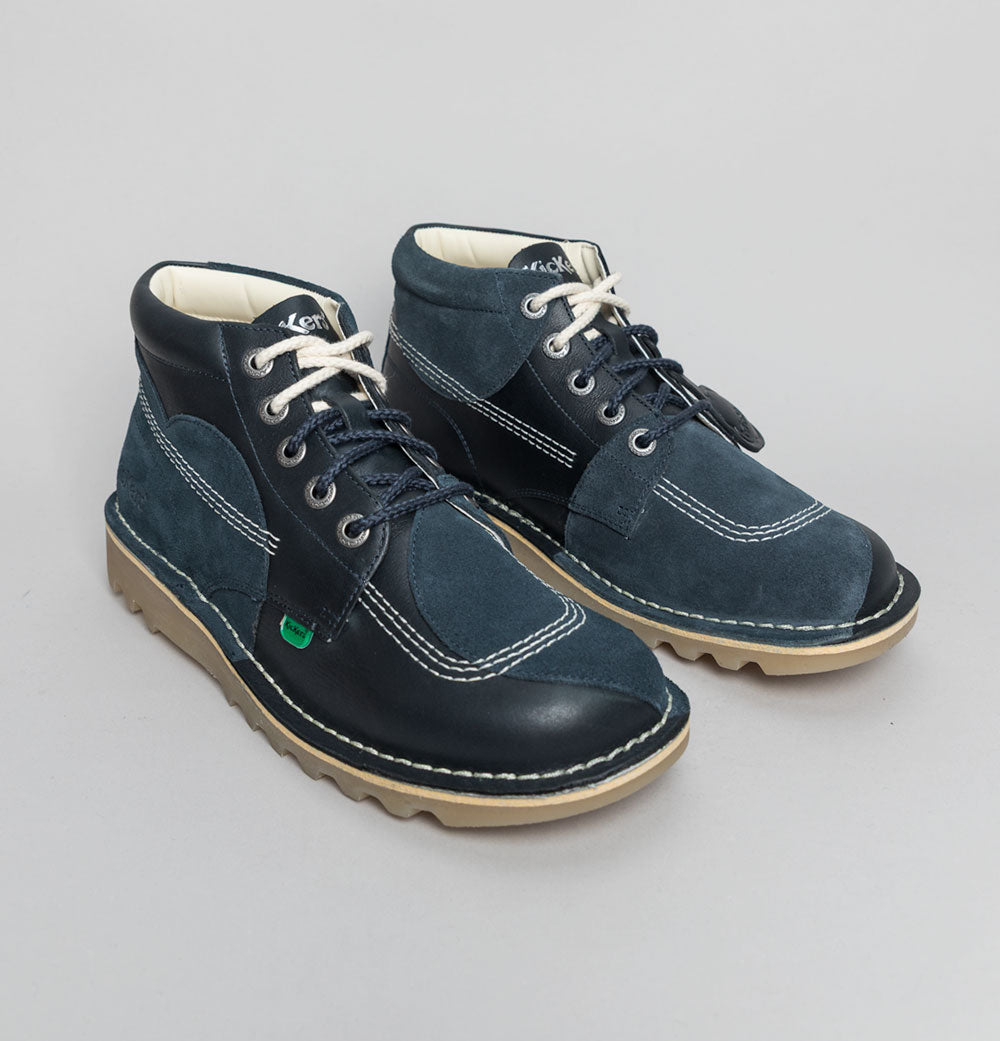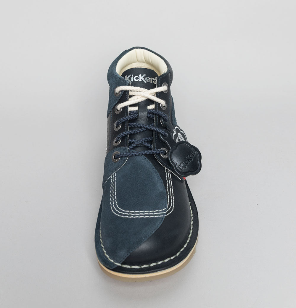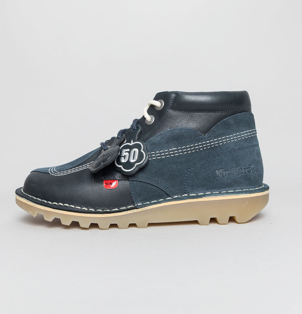 Kickers® Kick Hi stitch boots in Navy. Premium pull up leather uppers with suede overlays. Triple stitch detail in White. Rounded laces. Silver branded metal eyelets. Classic leather Kickers® fleurette and a special edition 50 version. Iconic Kickers® Red and Green heel plugs. Natural chunky Gum sole unit. Padded collar. All UK standard sizes.