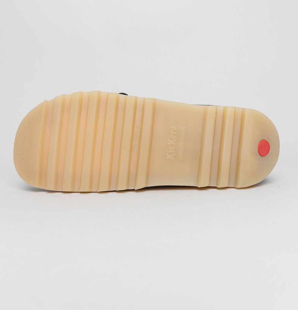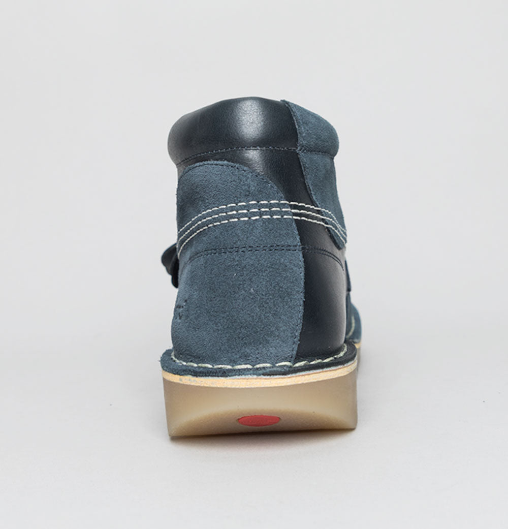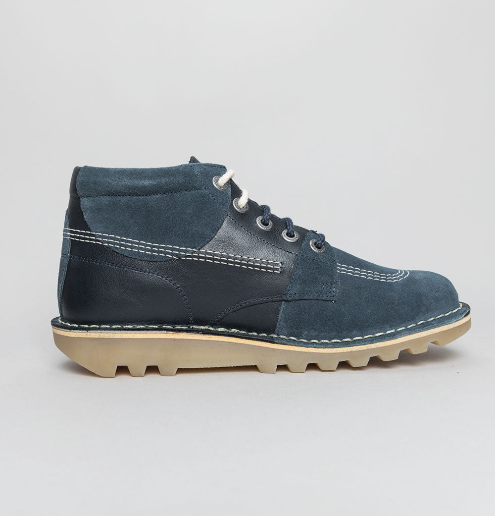 Kickers® Kick Hi stitch boots in Navy. Premium pull up leather uppers with suede overlays. Triple stitch detail in White. Rounded laces. Silver branded metal eyelets. Classic leather Kickers® fleurette and a special edition 50 version. Iconic Kickers® Red and Green heel plugs. Natural chunky Gum sole unit. Padded collar. All UK standard sizes.