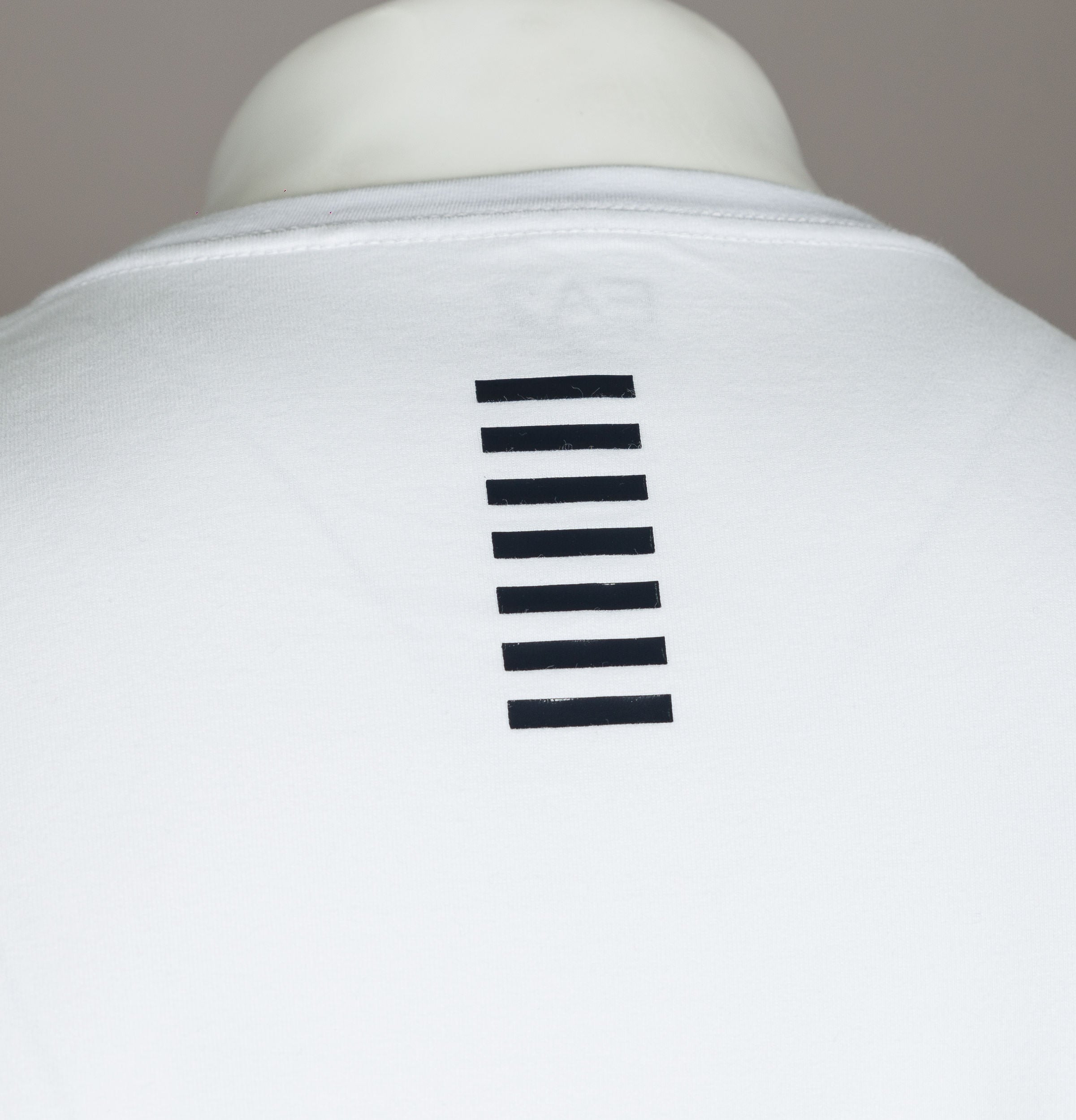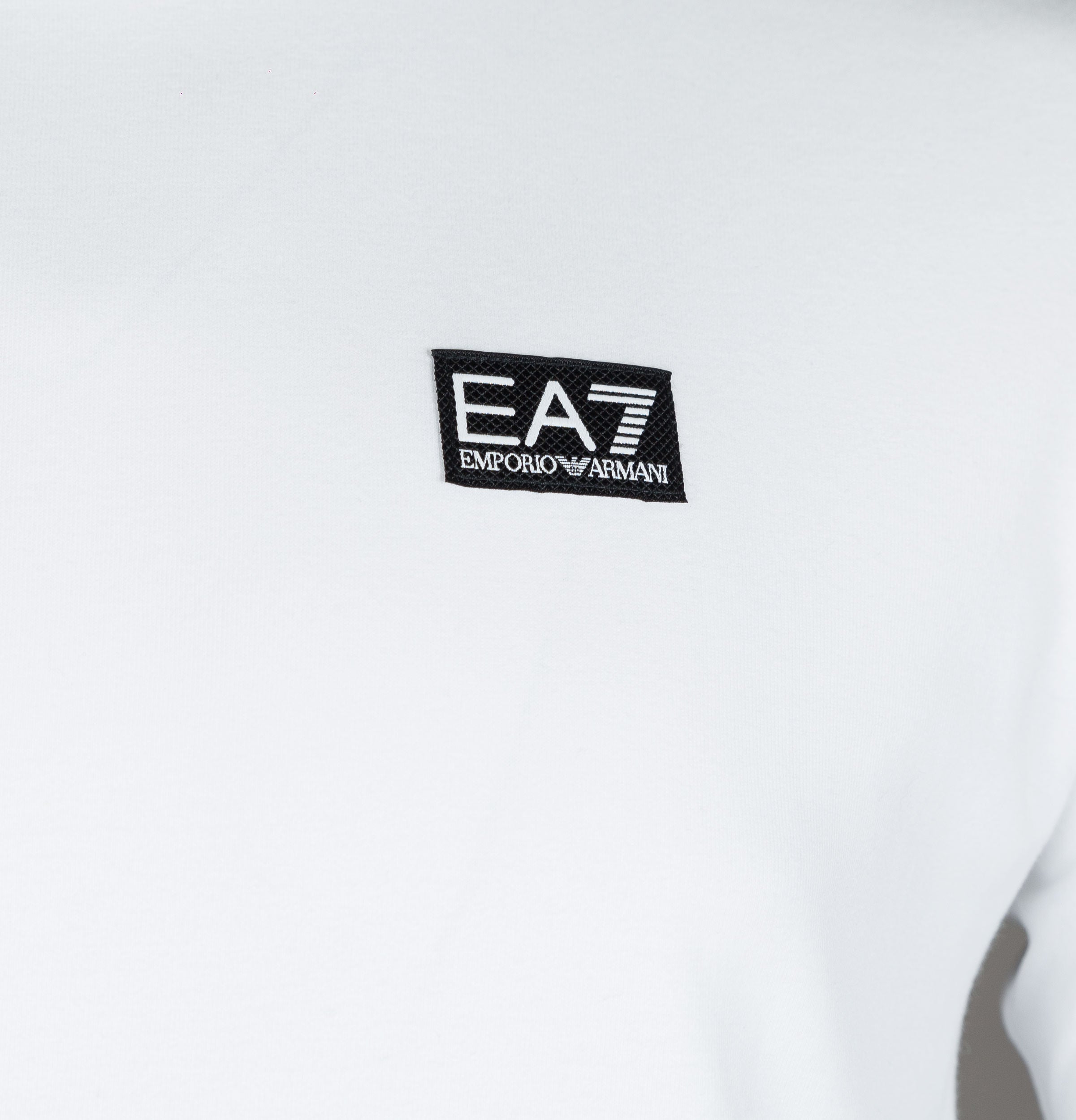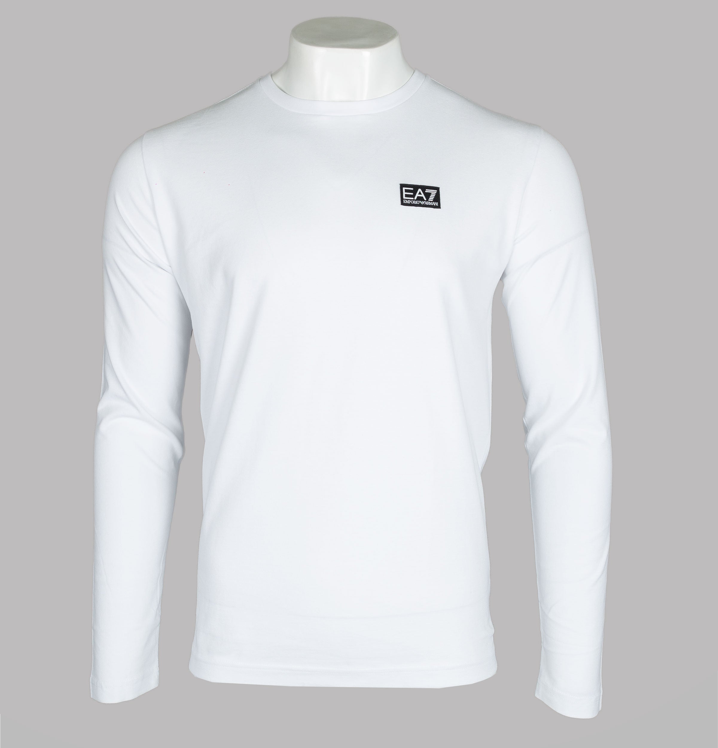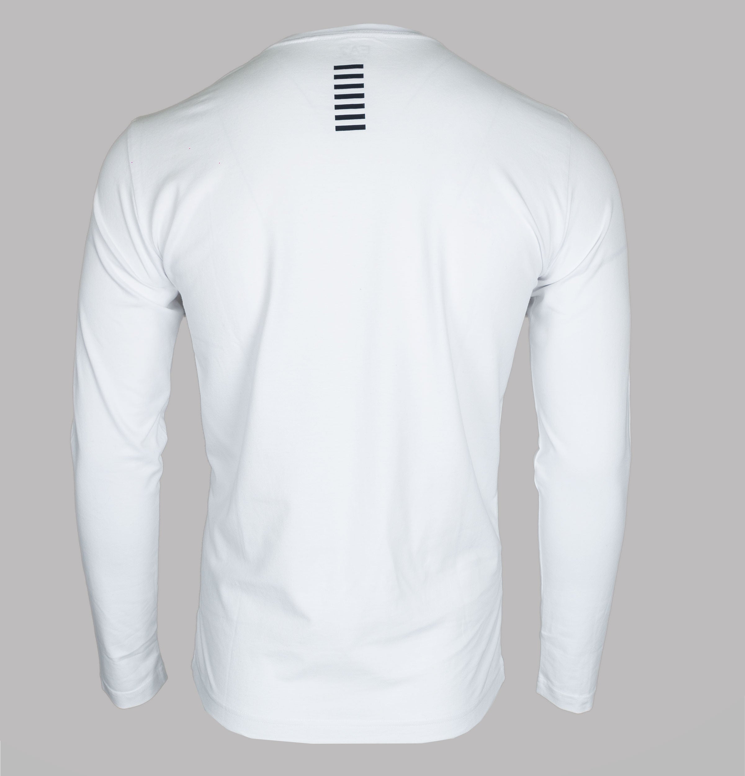 EA7 Emporio Armani long sleeve woven box logo t-shirt. White heavy duty cotton fabric. Ribbed crew neck. Woven EA7 Emporio Armani box logo on the chest. Black rubberised stripe detail on the upper back. Regular fit. 100% cotton.