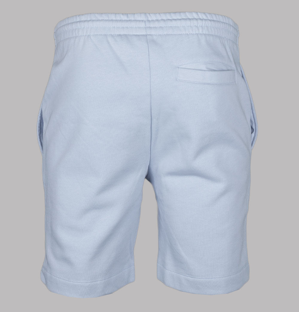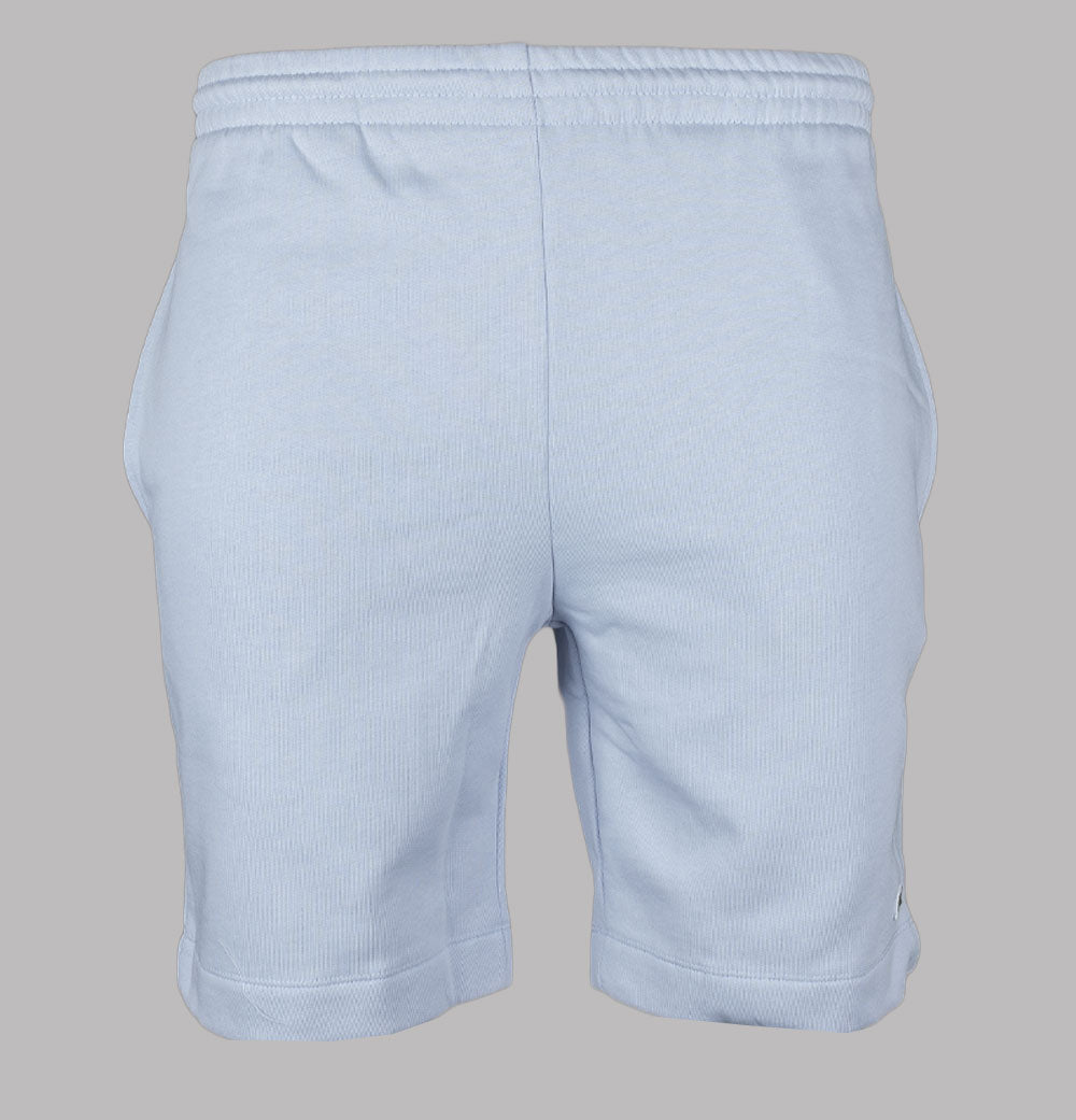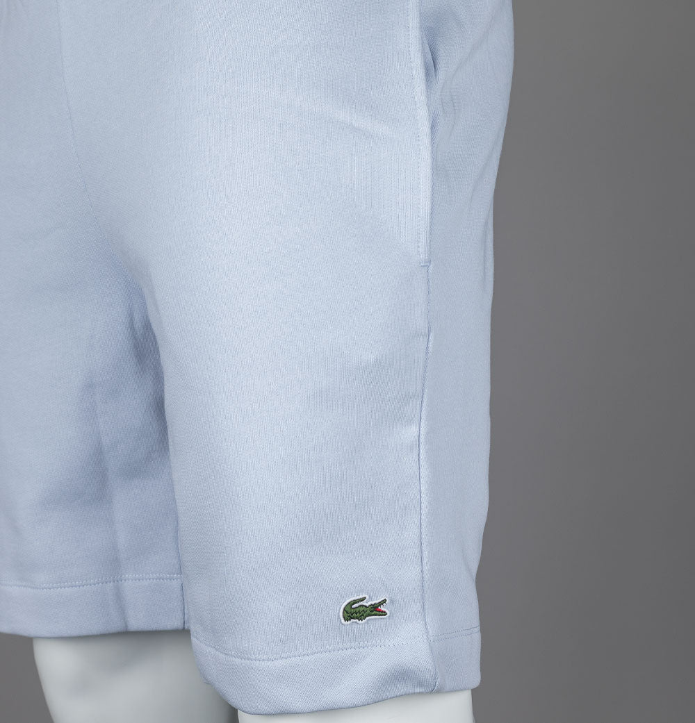 Lacoste fleece jogger shorts. Pale Blue organic brushed cotton fabric. Internal draw cord waistband. Side pockets and one back pocket. Embroidered Green Lacoste crocodile on the leg. Regular fit. 84% cotton, 16% polyester.