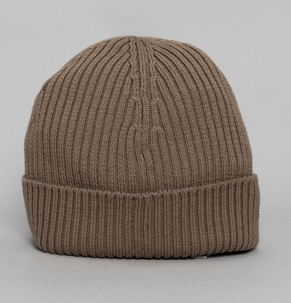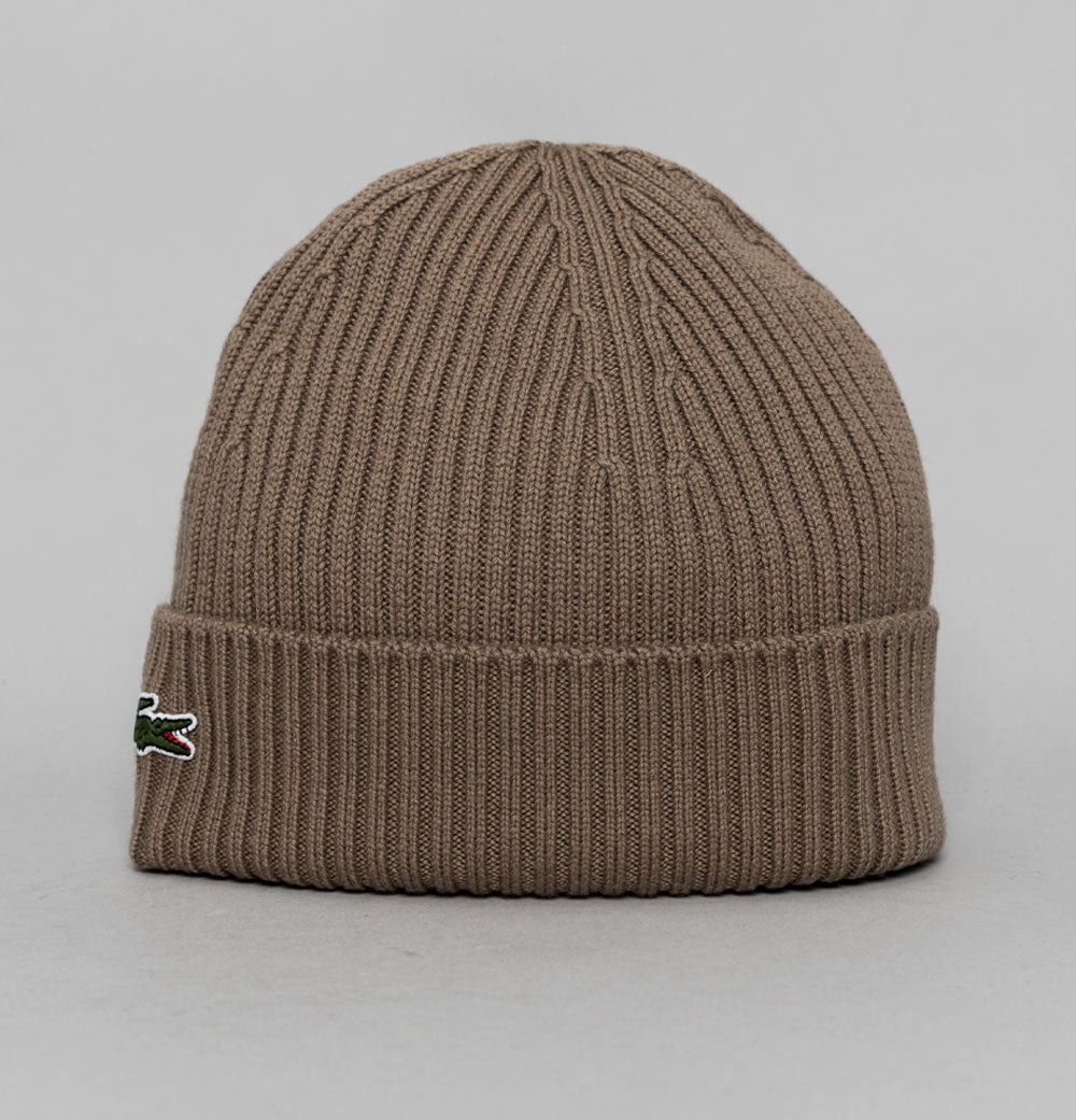 Lacoste ribbed wool knit beanie in Brown. Soft wool fabric. Ribbed design. Turned edge with Lacoste crocodile embroidery. One size. 100% wool.