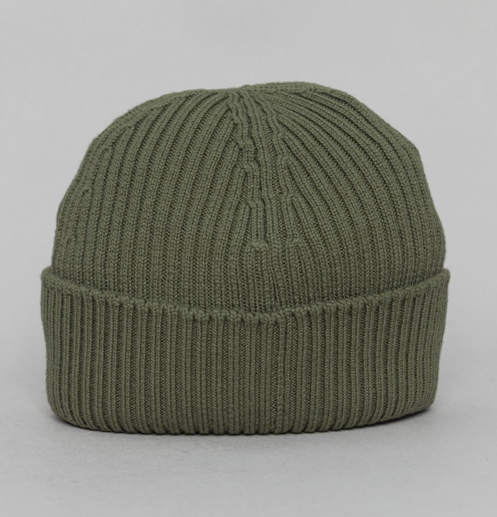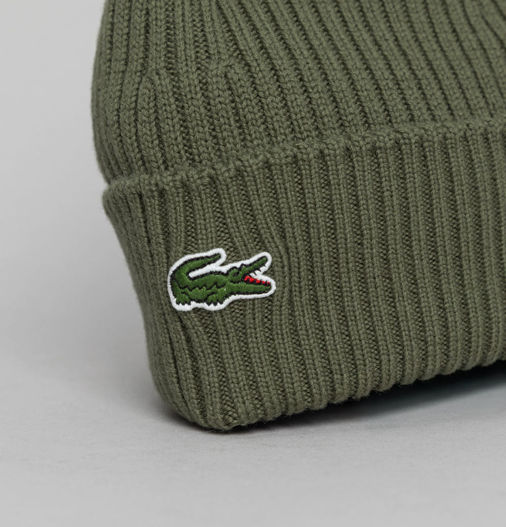 Lacoste ribbed wool knit beanie in Khaki Green. Soft wool fabric. Ribbed design. Turned edge with Lacoste crocodile embroidery. One size. 100% wool.