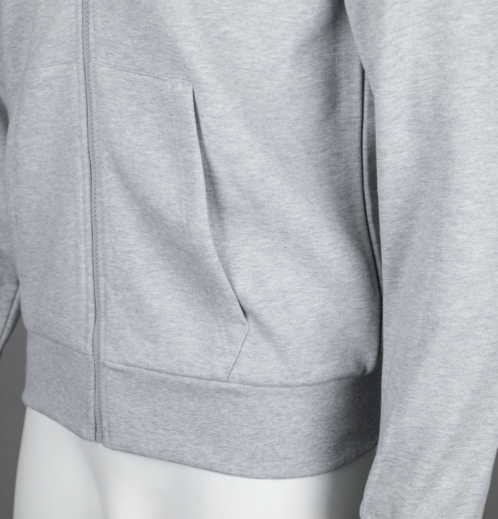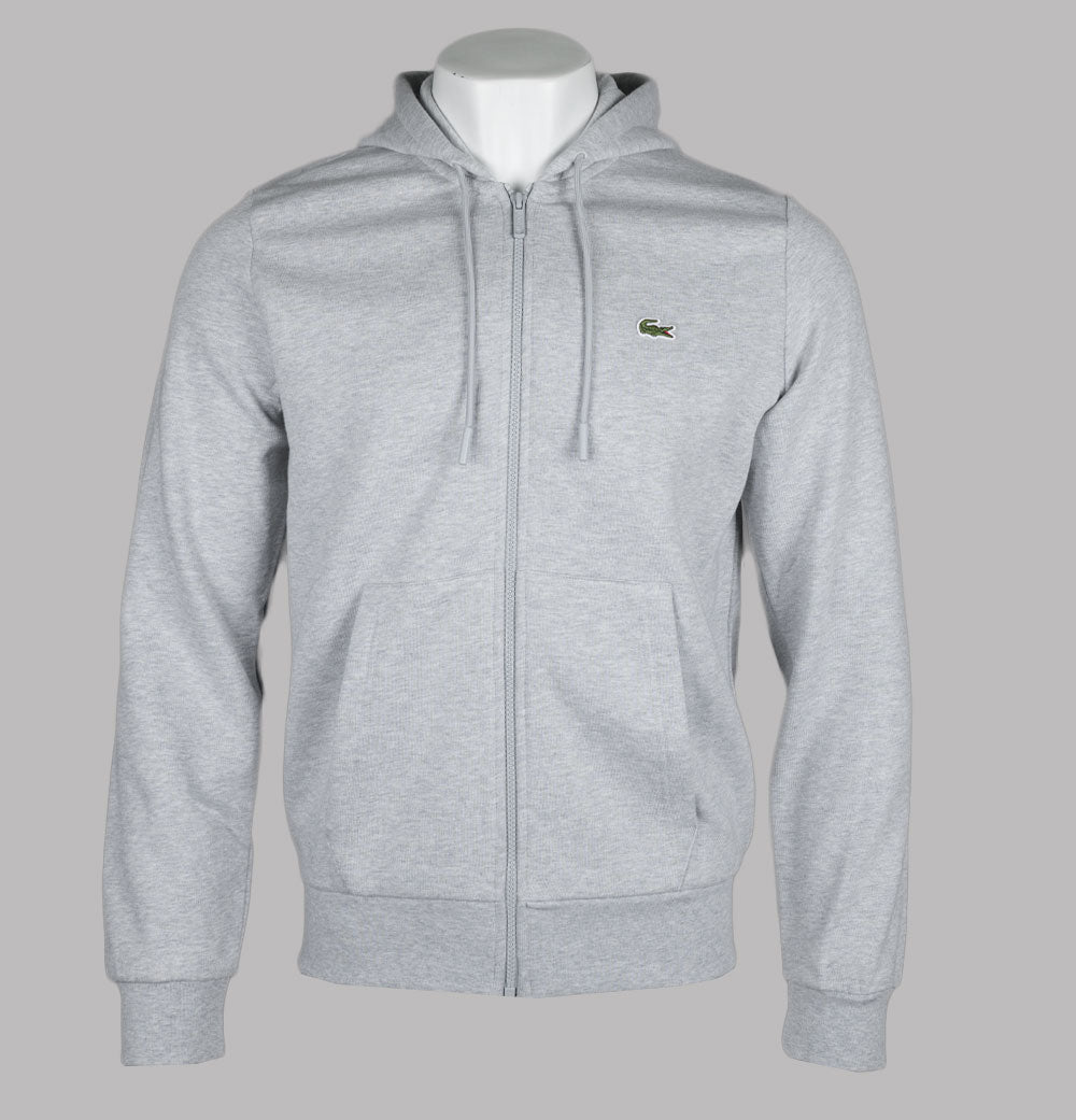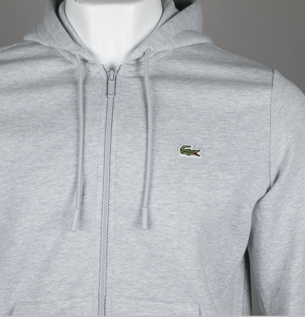 Lacoste zip up fleece hoodie in Grey. Organic brushed cotton fabric. Front zip up fastening with a Lacoste branded zipper. Draw cord hood. Front pockets. Embroidered Green Lacoste crocodile on the chest. Ribbed sleeve cuffs and hem. Classic fit. 84% cotton, 16% polyester.