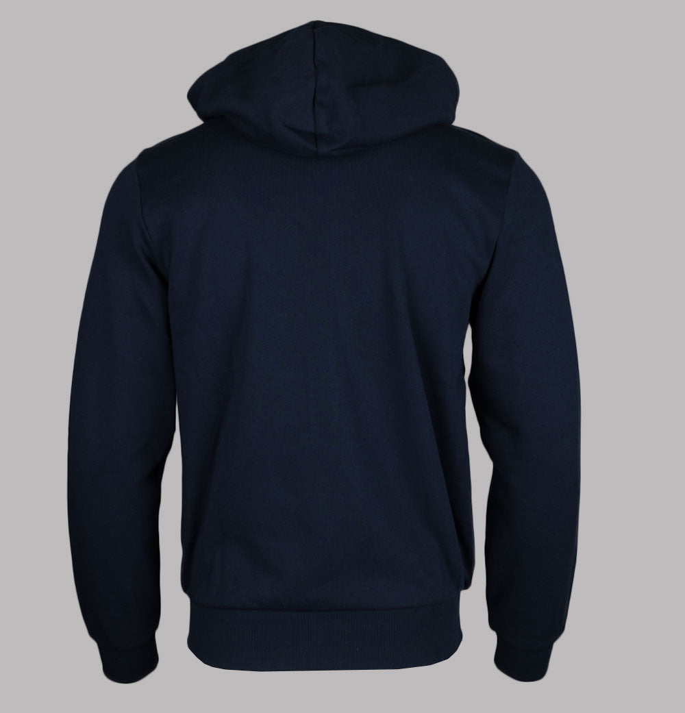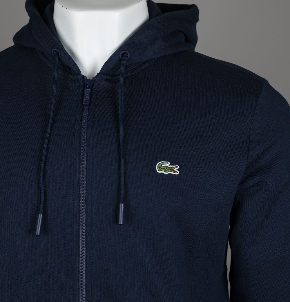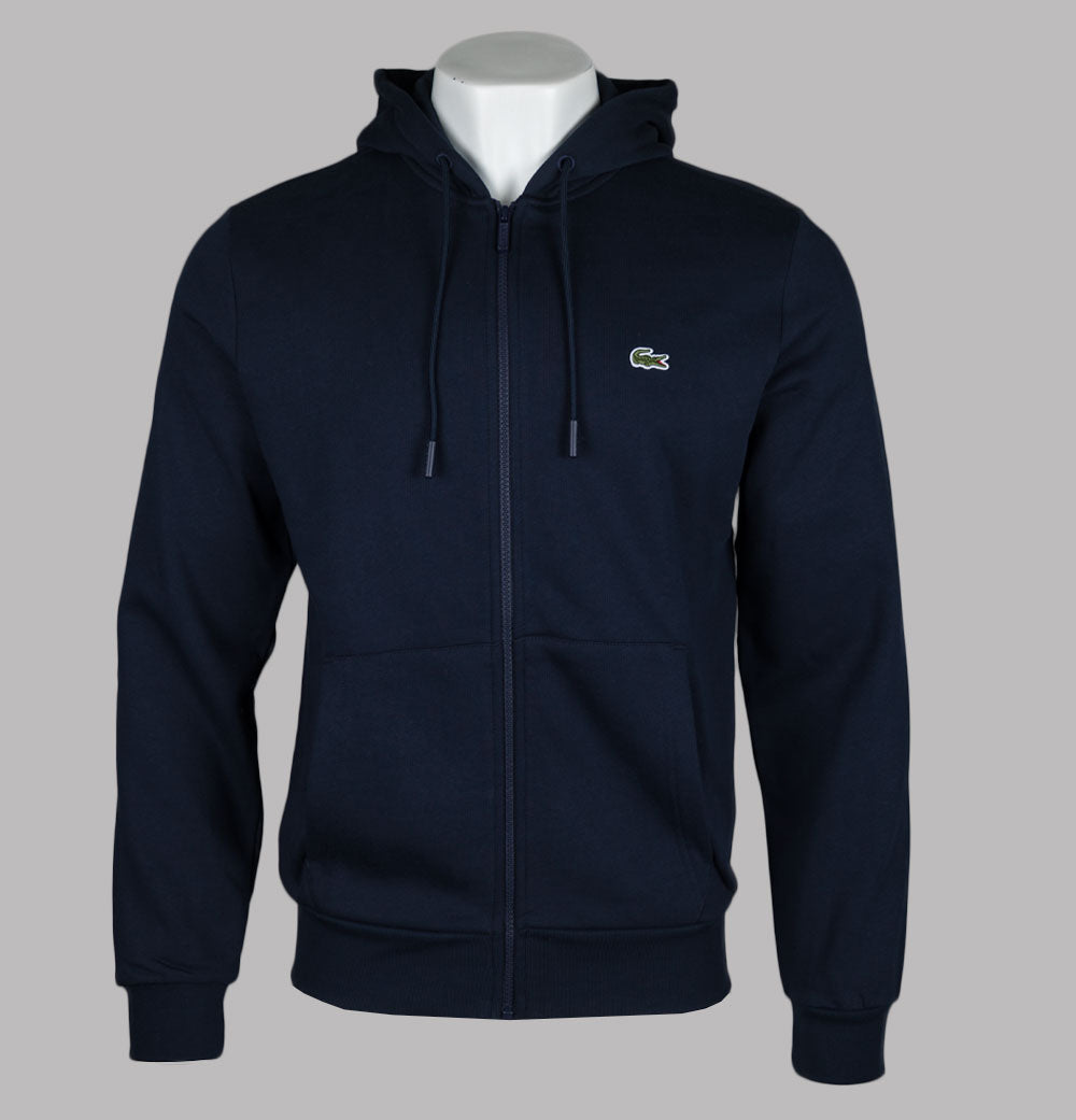 Lacoste zip up fleece hoodie in Navy. Organic brushed cotton fabric. Front zip up fastening with a Lacoste branded zipper. Draw cord hood. Front pockets. Embroidered Green Lacoste crocodile on the chest. Ribbed sleeve cuffs and hem. Classic fit. 84% cotton, 16% polyester.