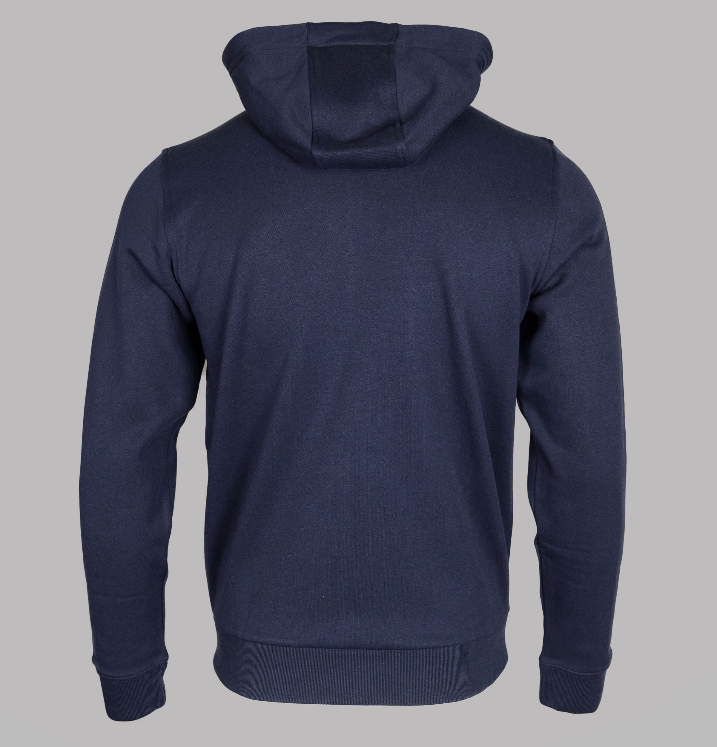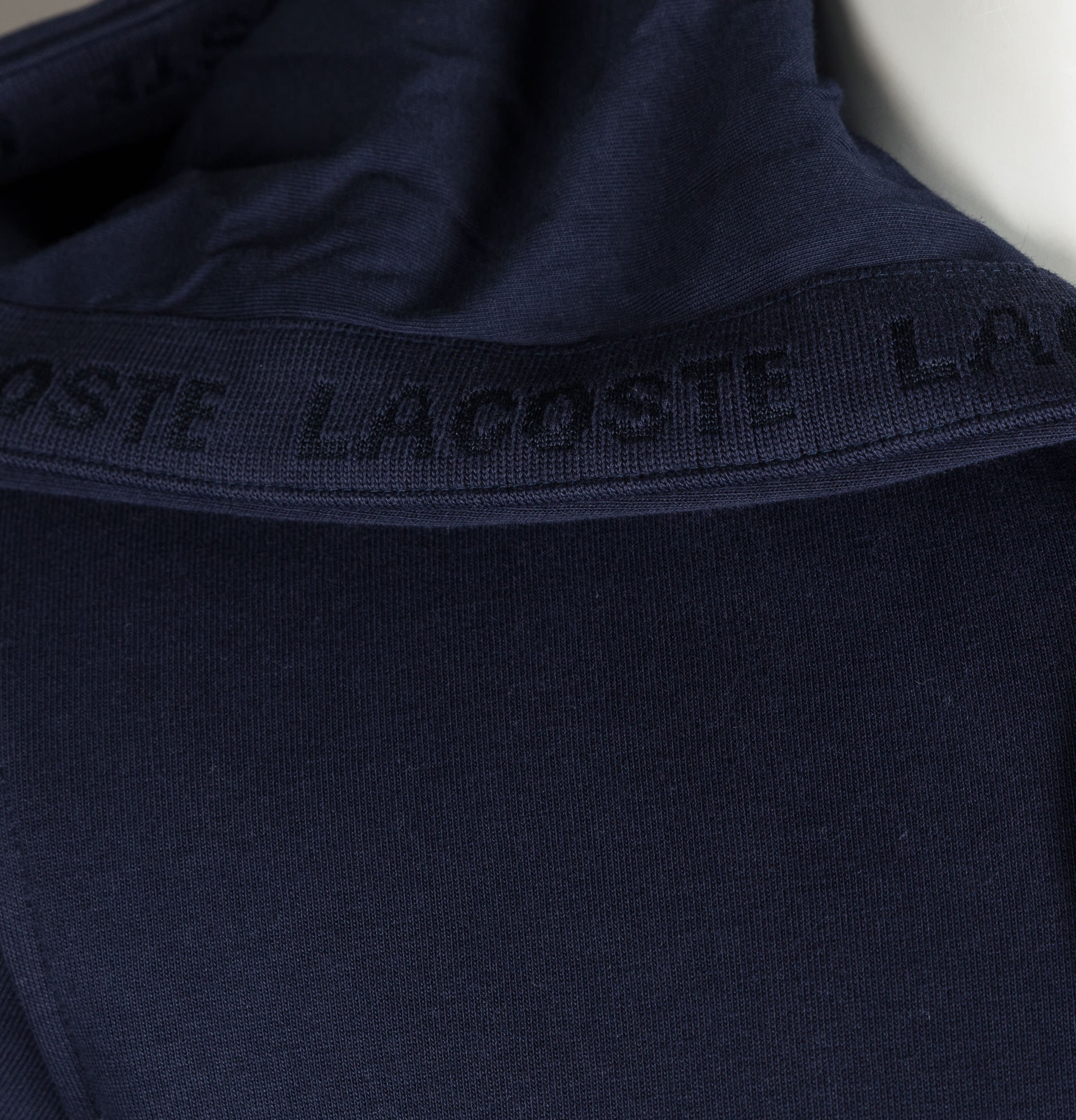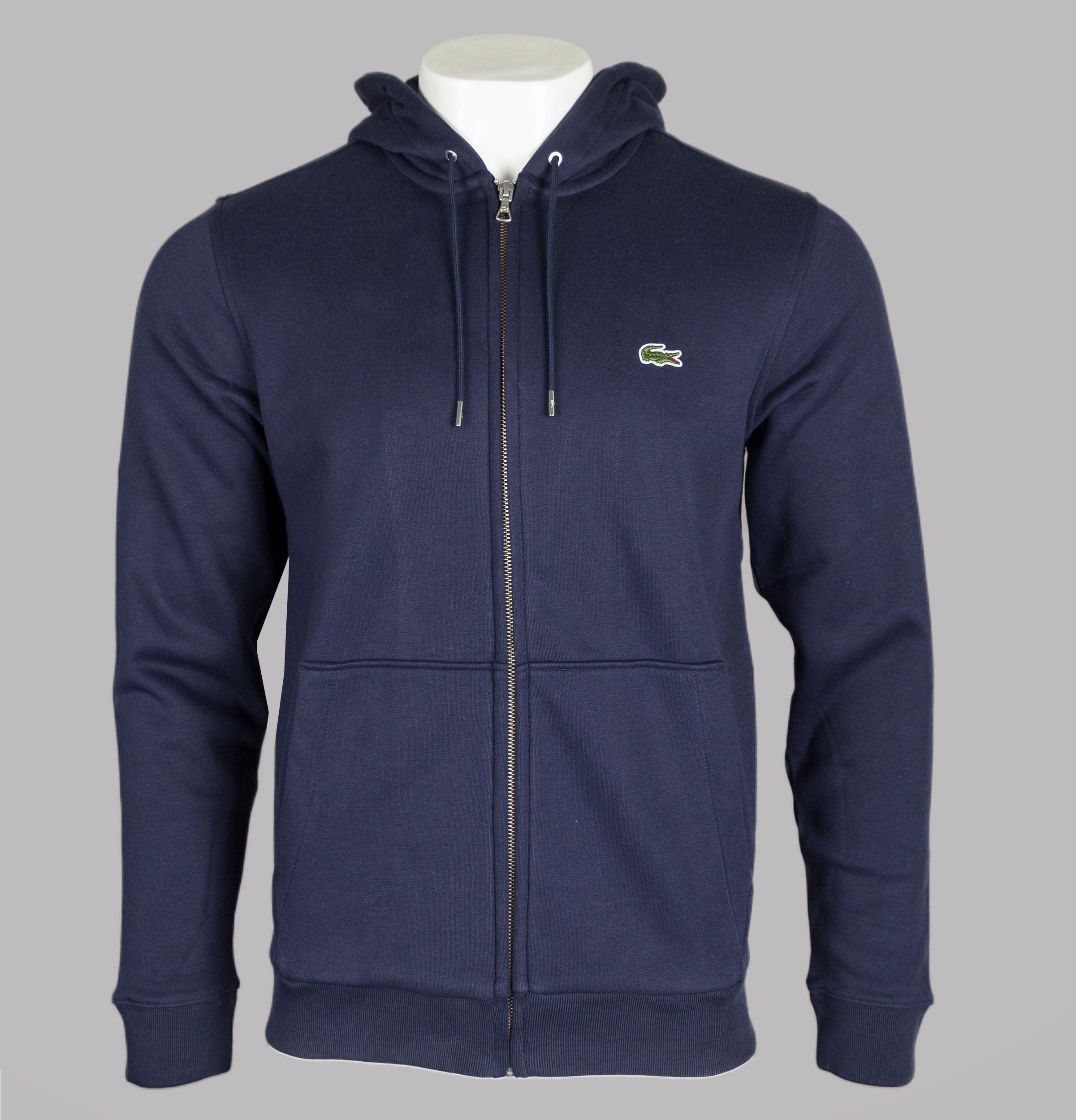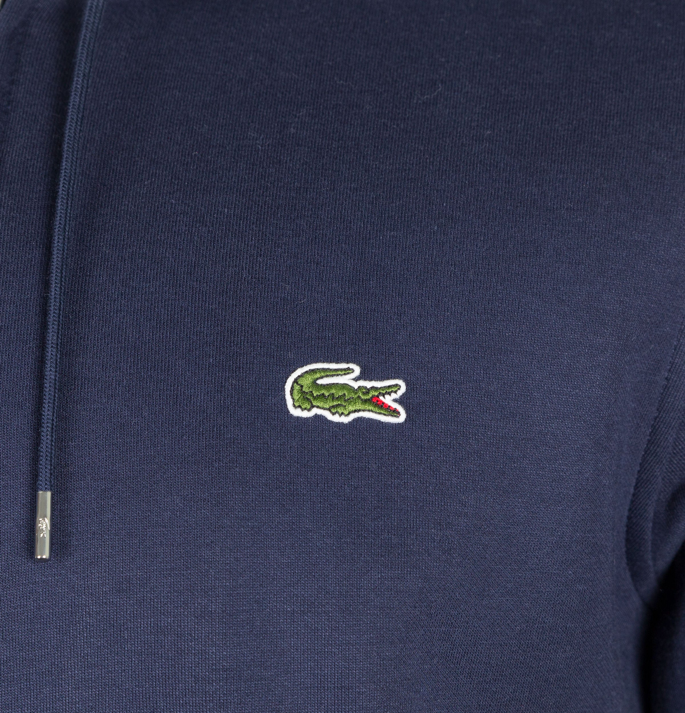 Lacoste zip up hooded sweatshirt. Navy Blue premium fleece back cotton fabric. Draw cord hood with Lacoste branded metal eyelets. Lacoste woven branding inside the hood. Full zip up fastening with a crocodile branded zipper. Front kangaroo style pocket. Embroidered Green Lacoste crocodile on the chest. Ribbed sleeve cuffs and hem. Regular fit. 65% cotton, 35% polyester.