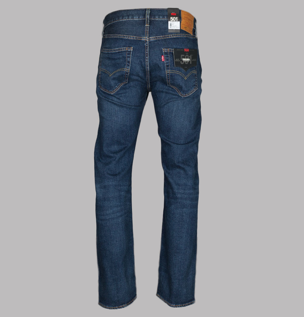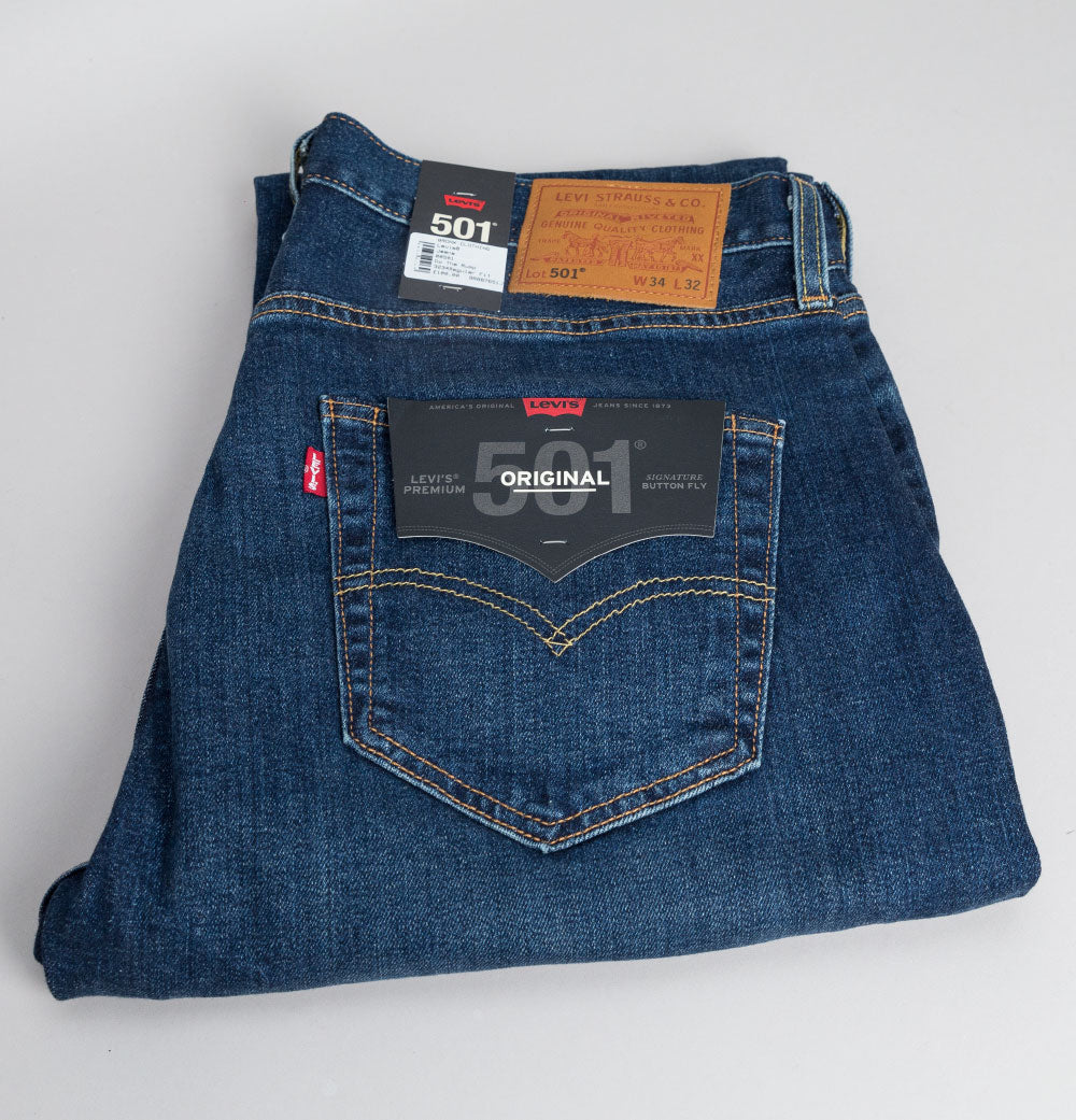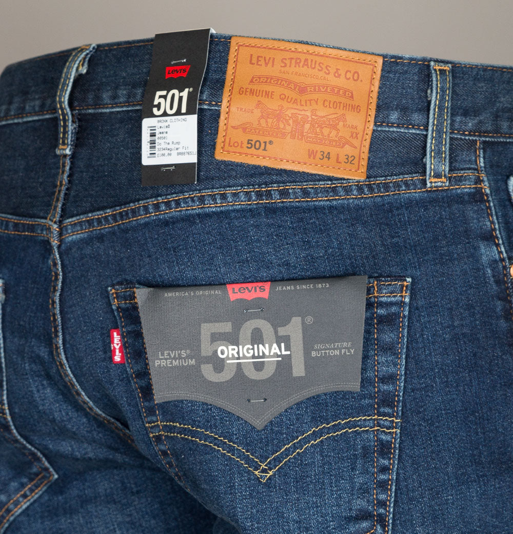Levi's® 501® original fit jeans in Do The Rump Blue. 10.25 OZ denim. Classic button fly with signature Levi's® branded buttons. 5 pocket construction. Gold stitch detail. Levi's® leather branded patch on the back. The iconic Levi's® Red tab on the back pocket. Regular fitting waist and legs with a 16.5 inch leg opening. 94% cotton, 5% polyester, 1% elastane.