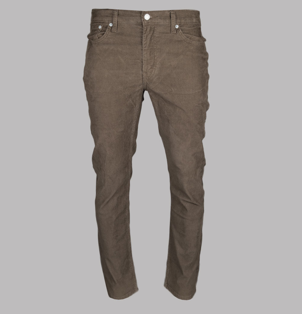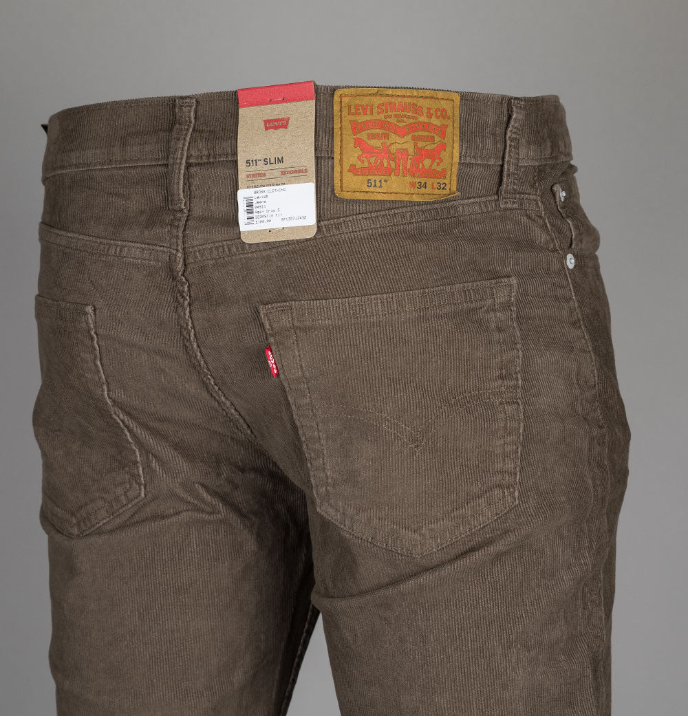 Levi's® 511™ slim fit Cords in Rain Drum S. Light Brown classic 5 pocket style. Zip fly with a Levi's® branded top button. Iconic Levi's® Red tab on the back pocket. Brown Levi's® branded leather patch on the back of the waistband. Branded metal trims. Tonal stitch detail. Belt loops. Sits below the waist with a slim fit from hip to ankle. Added stretch for all-day comfort. 83% cotton, 15% polyester, 2% elastane.