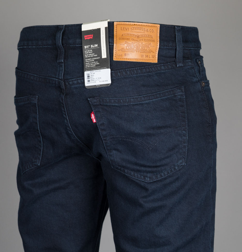 Levi's® 511™ slim fit jeans in Master Of None. Dark Indigo denim. Classic 5 pocket style. Zip fly with a metal signature Levi's® branded top button. Iconic Levi's® Red tab on the back pocket. Brown leather branded patch on the back. Tonal stitch detail. Metal branded trims. Sits below the waist with a slim fit from hip to ankle. 67% cotton, 32% lyocell, 1% elastane.