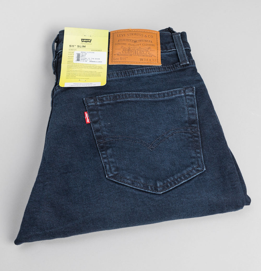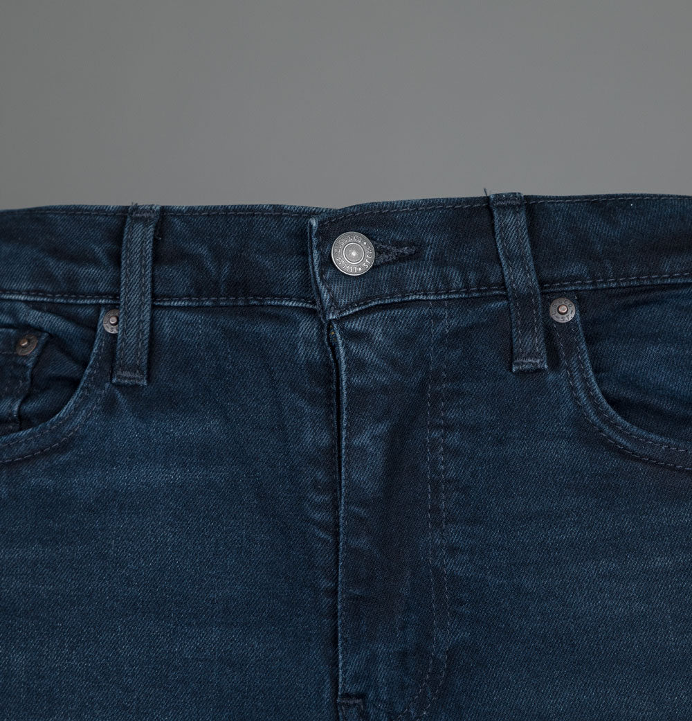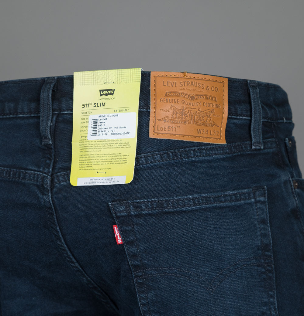 Levi's® 511™ slim fit performance flex Jeans. Chicken Of The Woods Dark Blue washed denim. Classic 5 pocket style. Zip fly with a Levi's® branded top button. Iconic Levi's® Red tab on the back pocket. Brown Levi's® branded patch on the back of the waistband. Branded metal trims. Tonal stitch detail. Belt loops. Sits below the waist with a slim fit from hip to ankle. 70% cotton, 28% lyocell, 2% elastane.