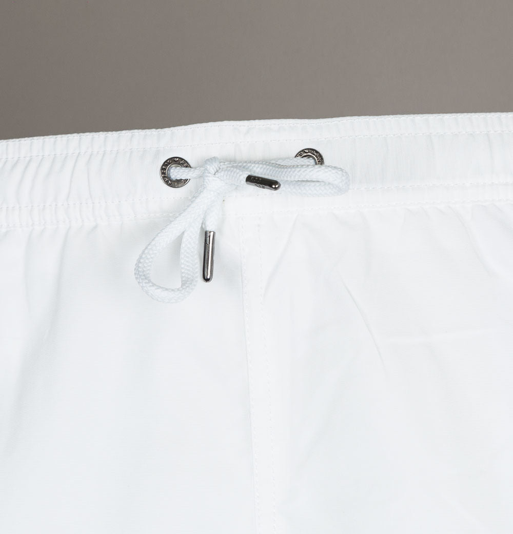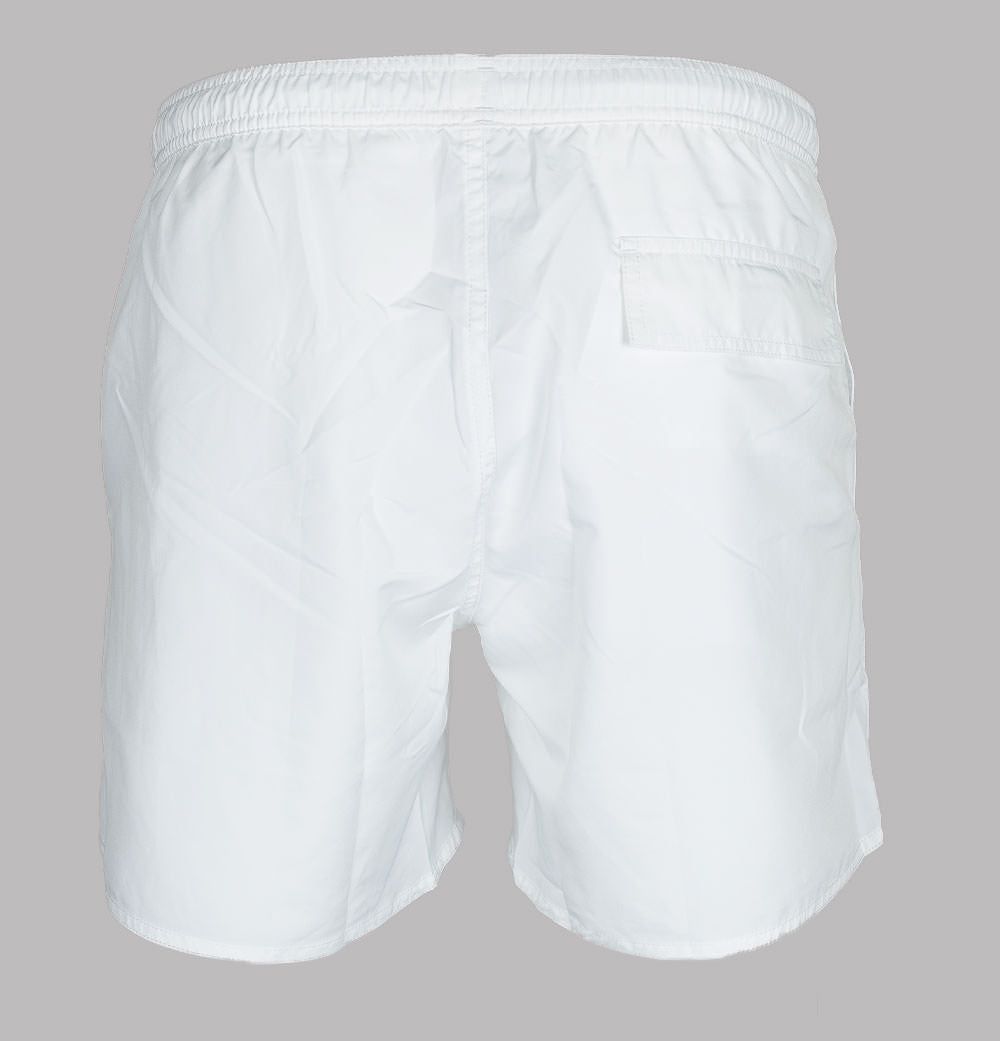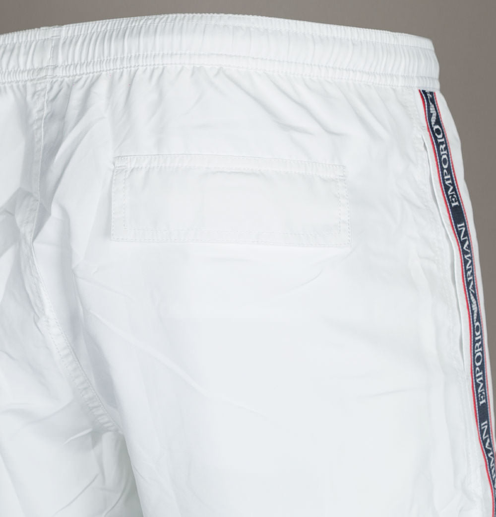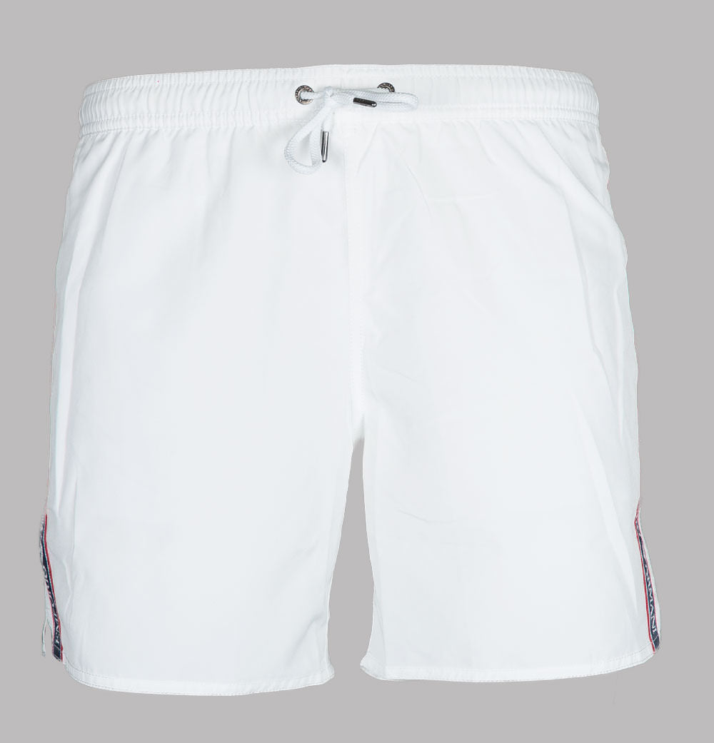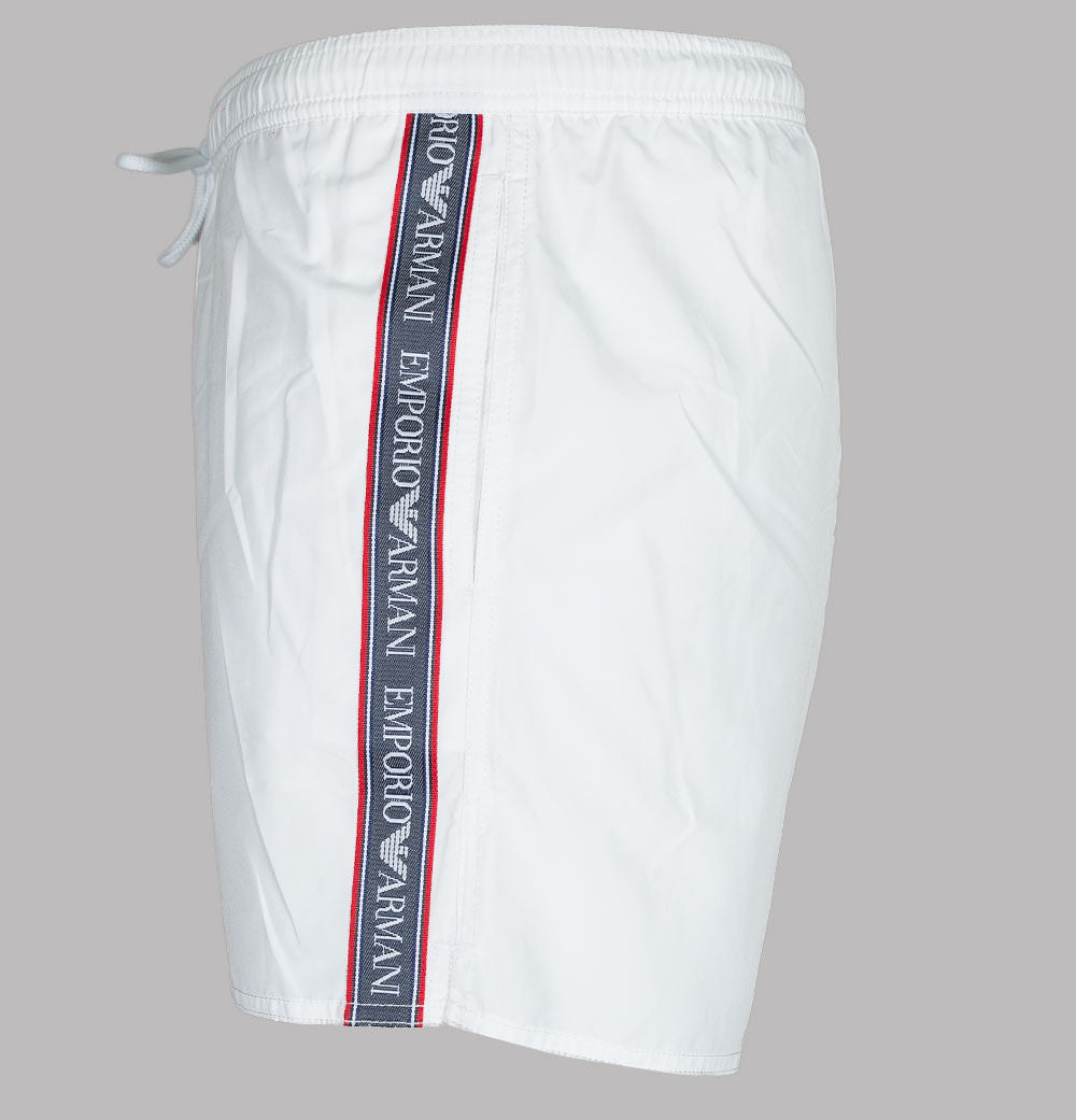 Emporio Armani logo taping swim shorts. White lightweight fabric. Draw cord waistband with metal Emporio Armani branded eyelets. Two front pockets. One back velcro pocket. Signature Emporio Armani taping down the legs. Premium mesh lining. Regular fit with a short inseam. 100% polyester.