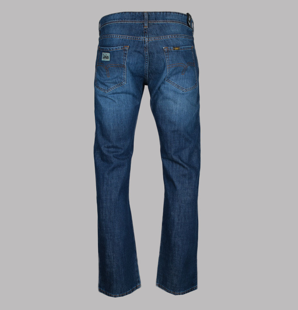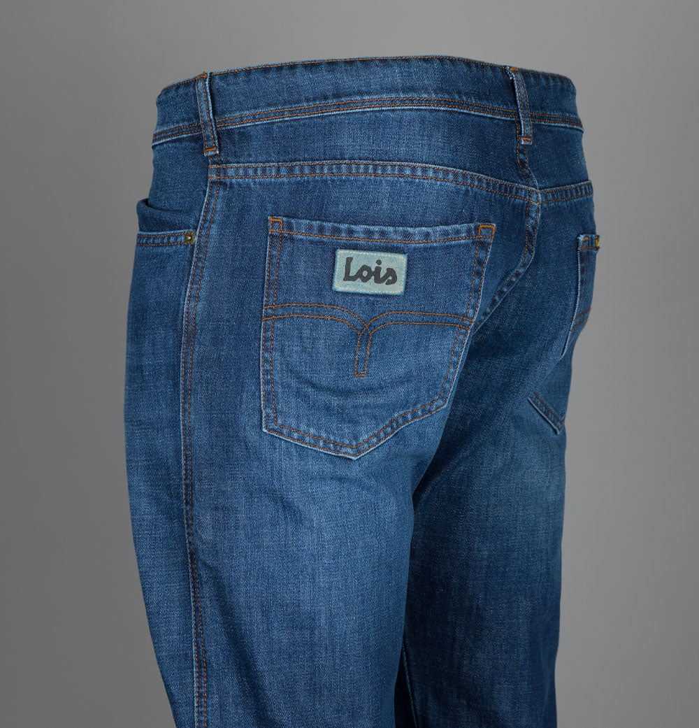 Lois Marvin denim jeans. Dark Stone wash cotton fabric. Classic 5 pocket style. Button up fly with Lois branded buttons. Lois Bull branding on the front pocket. Embroidered Lois branding on the back pockets. Belt loops. Gold stitch detail. Regular fitting waist with wide loose fit legs. 100% cotton. Made in Spain.