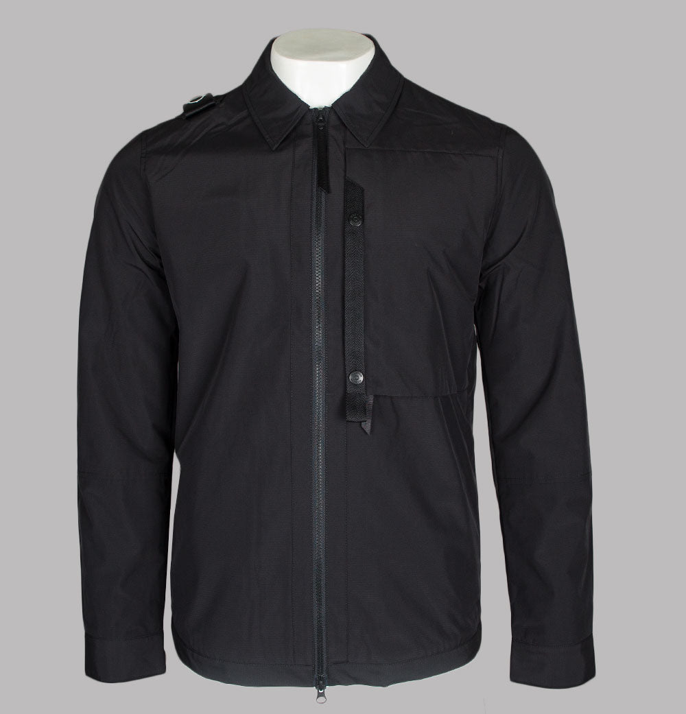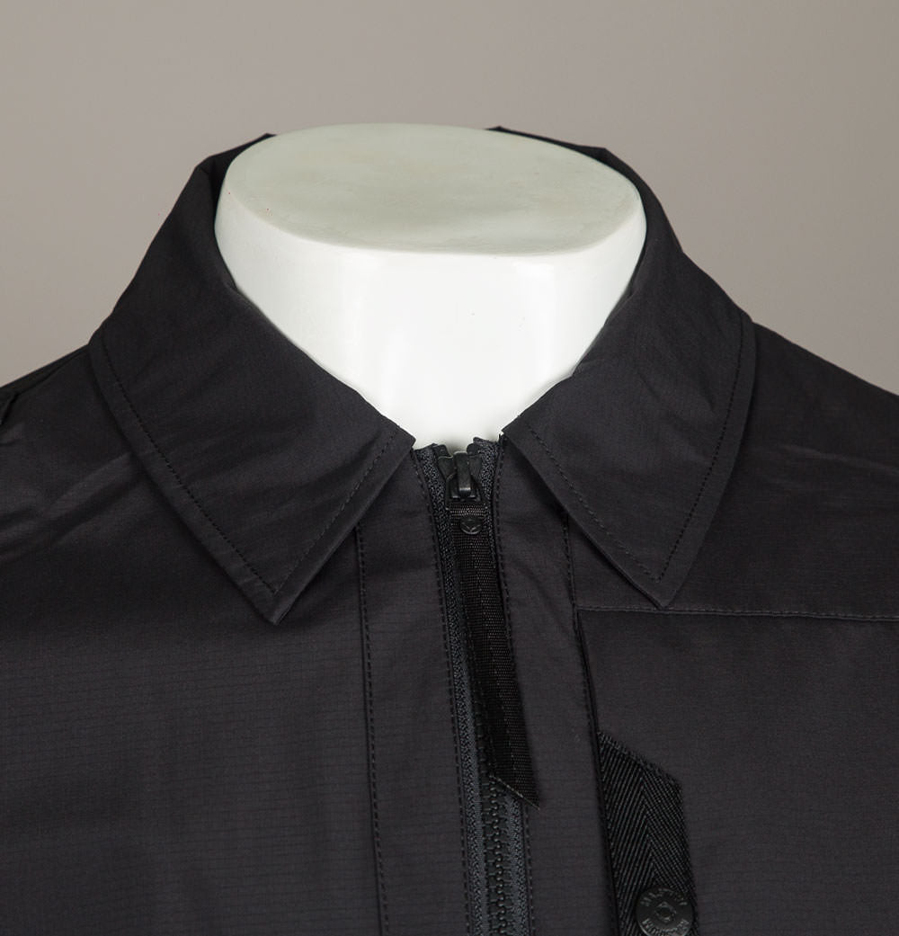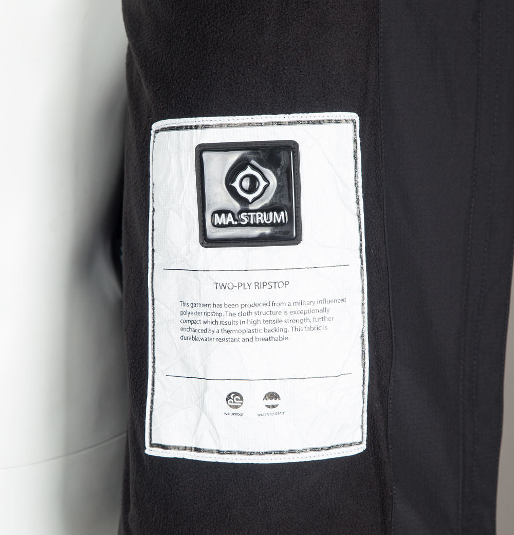 Ma.Strum fleece lined overshirt. Jet Black two-ply rip stop polyester fabric. Full front zip fastening with a Ma.Strum branded two way zipper. Pointed collar. Two concealed front zip pockets. Chest pocket with multi inner pockets. Adjustable snap fastening sleeve cuffs. Detachable Ma.Strum badge on the shoulder. Fleece lining. Regular fit. 100% polyester.