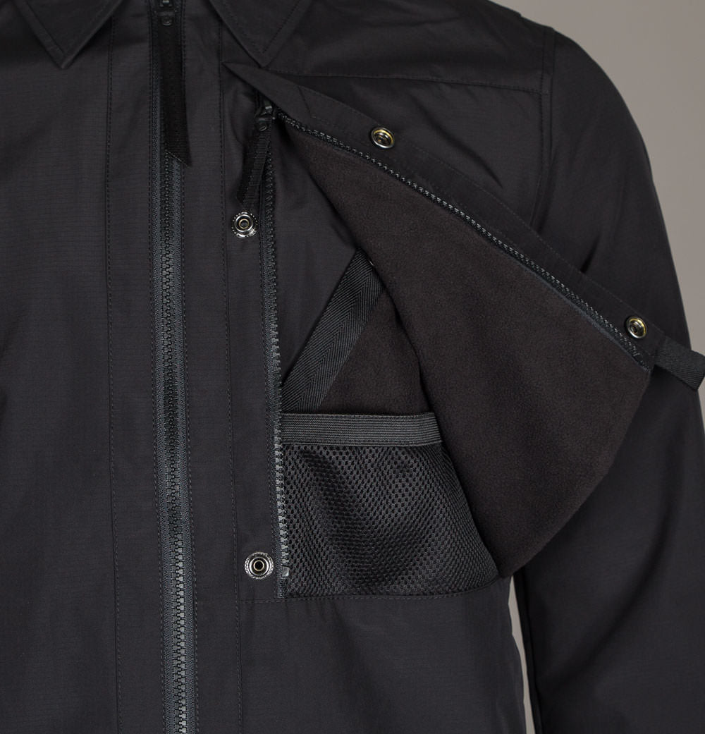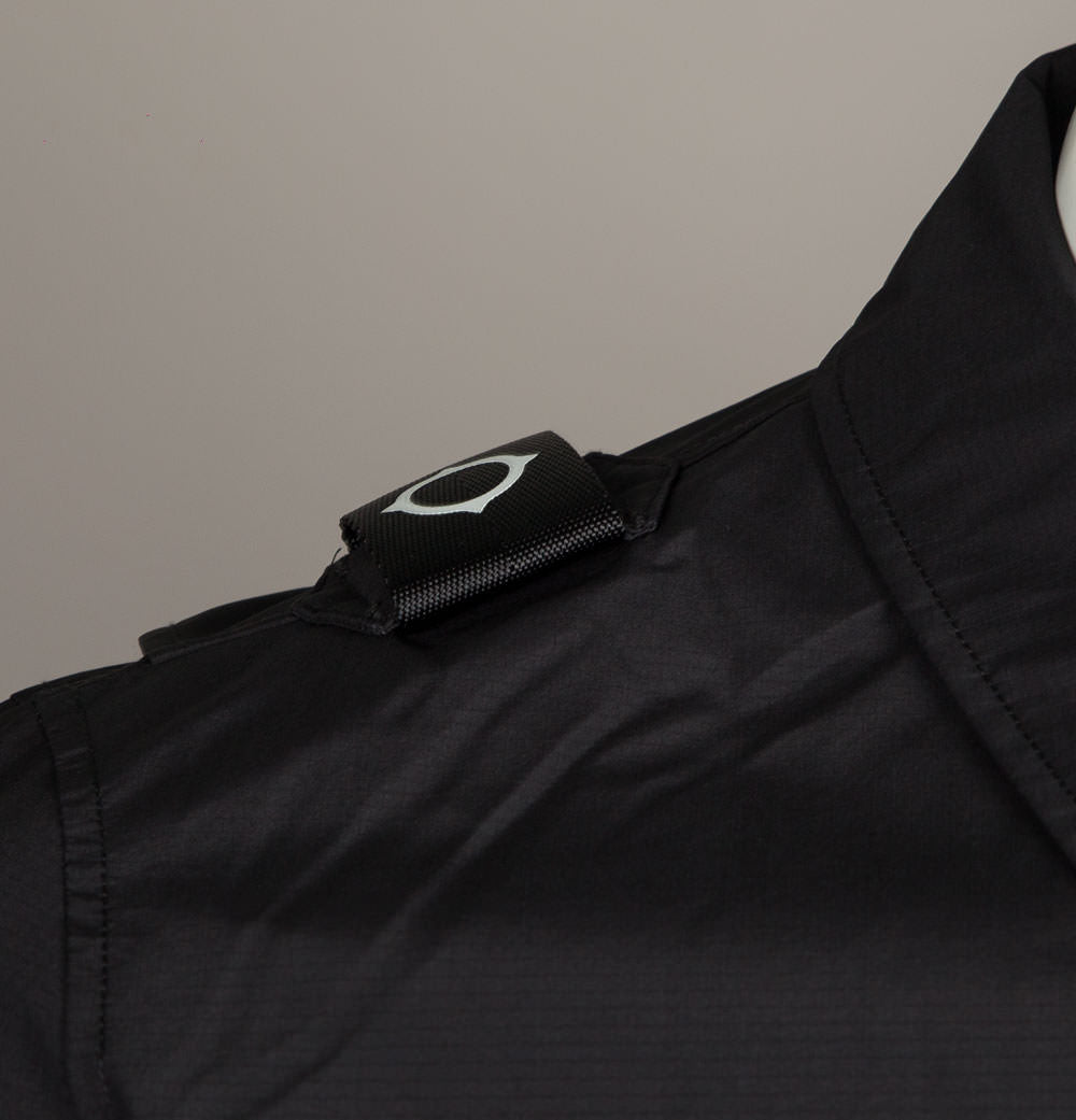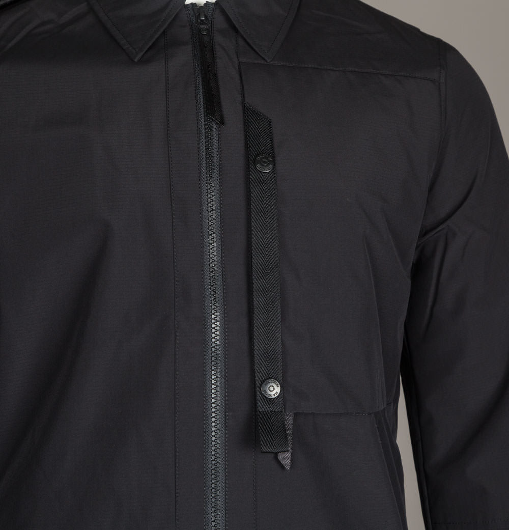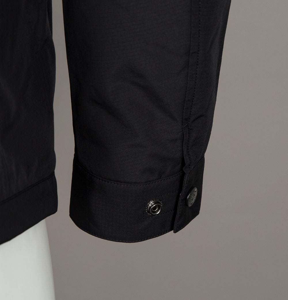 Ma.Strum fleece lined overshirt. Jet Black two-ply rip stop polyester fabric. Full front zip fastening with a Ma.Strum branded two way zipper. Pointed collar. Two concealed front zip pockets. Chest pocket with multi inner pockets. Adjustable snap fastening sleeve cuffs. Detachable Ma.Strum badge on the shoulder. Fleece lining. Regular fit. 100% polyester.