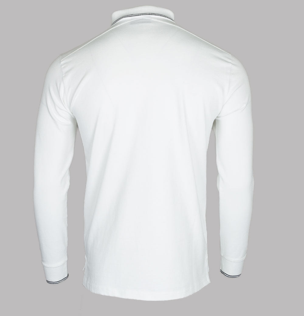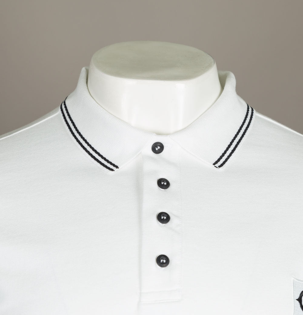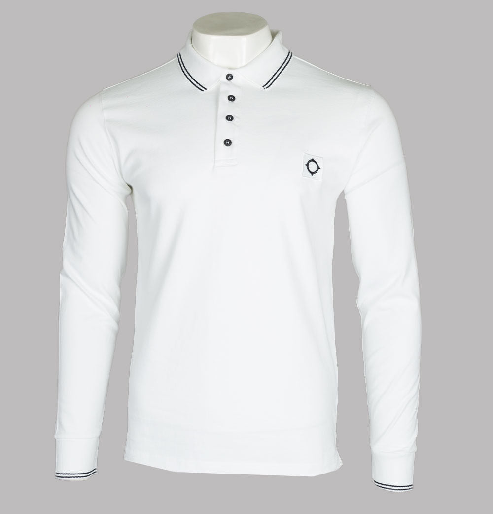 Ma.Strum long sleeve jersey polo shirt. Optic White premium cotton jersey fabric. Four button placket with signature Ma.Strum branded buttons. Ribbed collar and long sleeve cuffs with twin tipped detail. Embroidered Ma.Strum compass logo on the chest. Signature cross back detail. Side slit detail on the hem. Regular fit. 100% cotton.