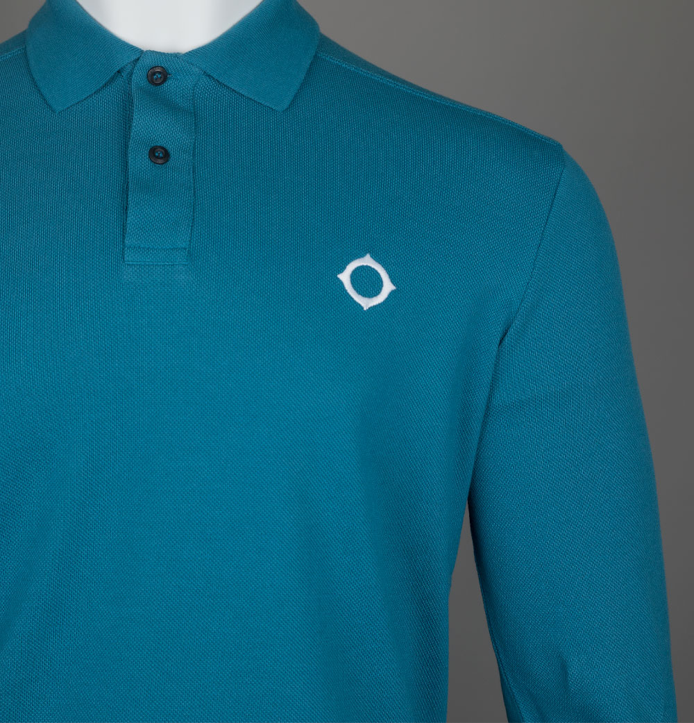 Ma.Strum long sleeve pique polo shirt. Storm Blue premium cotton pique fabric. Two button placket with Ma.Strum signature branded buttons. Ribbed collar and sleeve cuffs. Thick embroidered Ma.Strum logo on the chest in White. Signature cross back stitch detail. Side slits on the seam. Regular fit. 100% cotton.