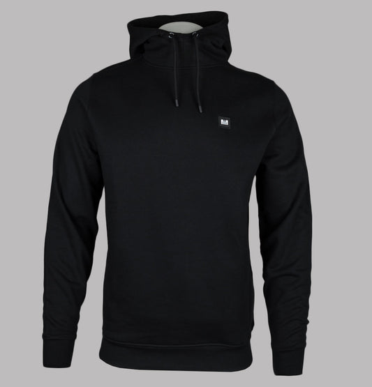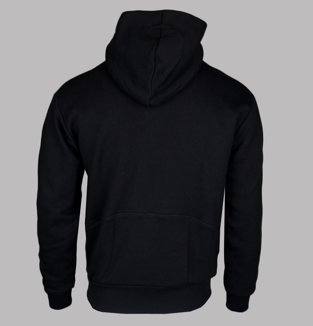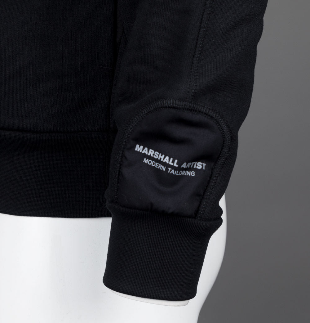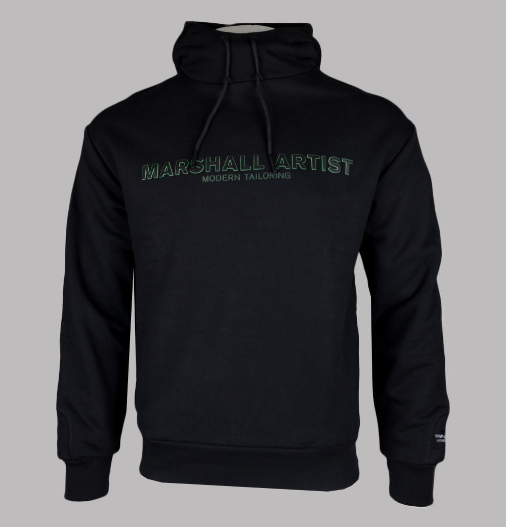 Marshall Artist Santiago hoodie. Black heavy duty cotton fabric. Draw cord hood. Rubber signature Marshall Artist branding on the chest with Green trim. Front pockets. Nylon panel on the sleeve with reflective Marshall Artist branding. Ribbed sleeve cuffs and hem. Tonal stitch detail. Relaxed fit. 100% cotton.