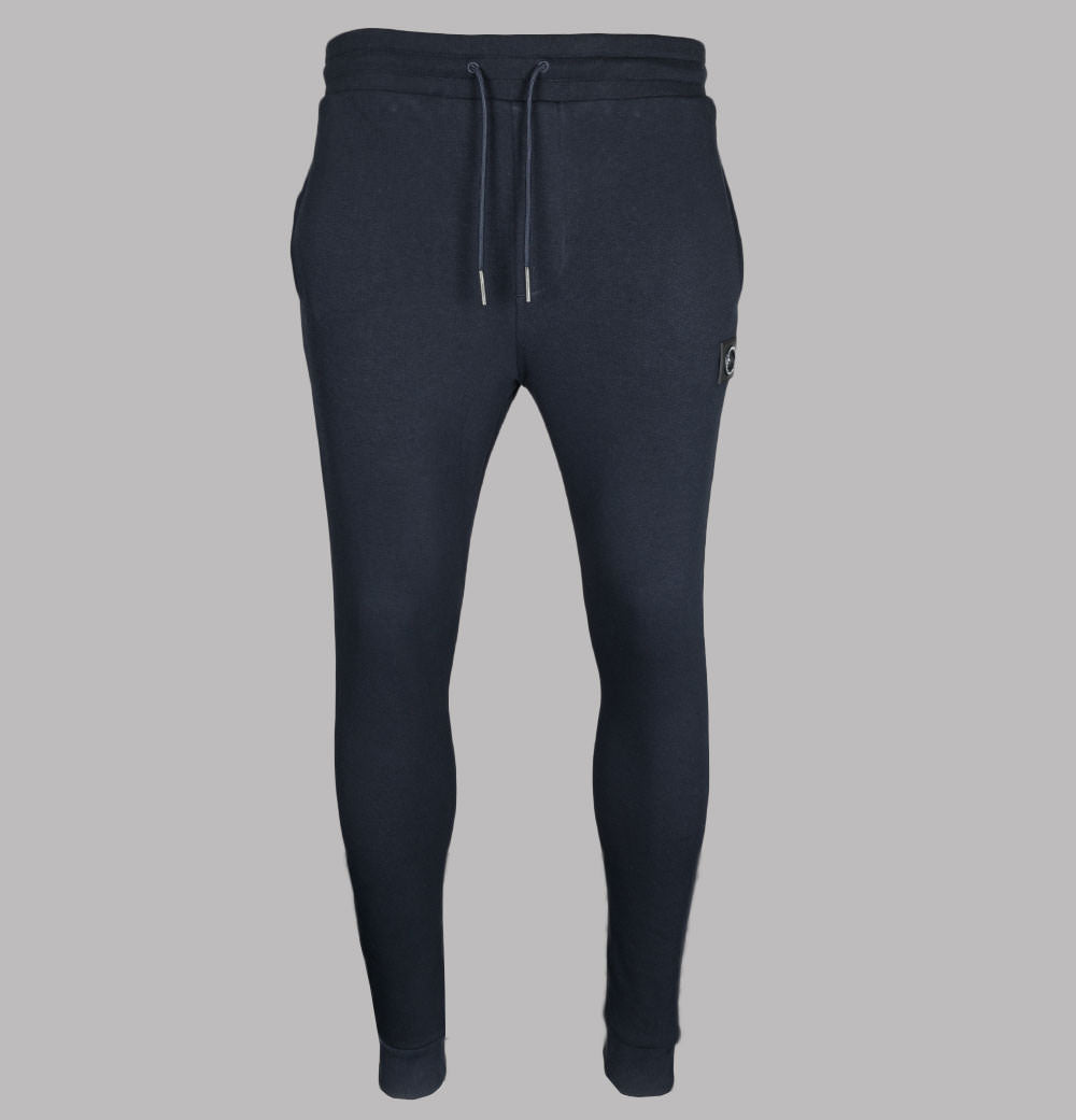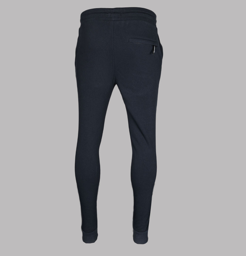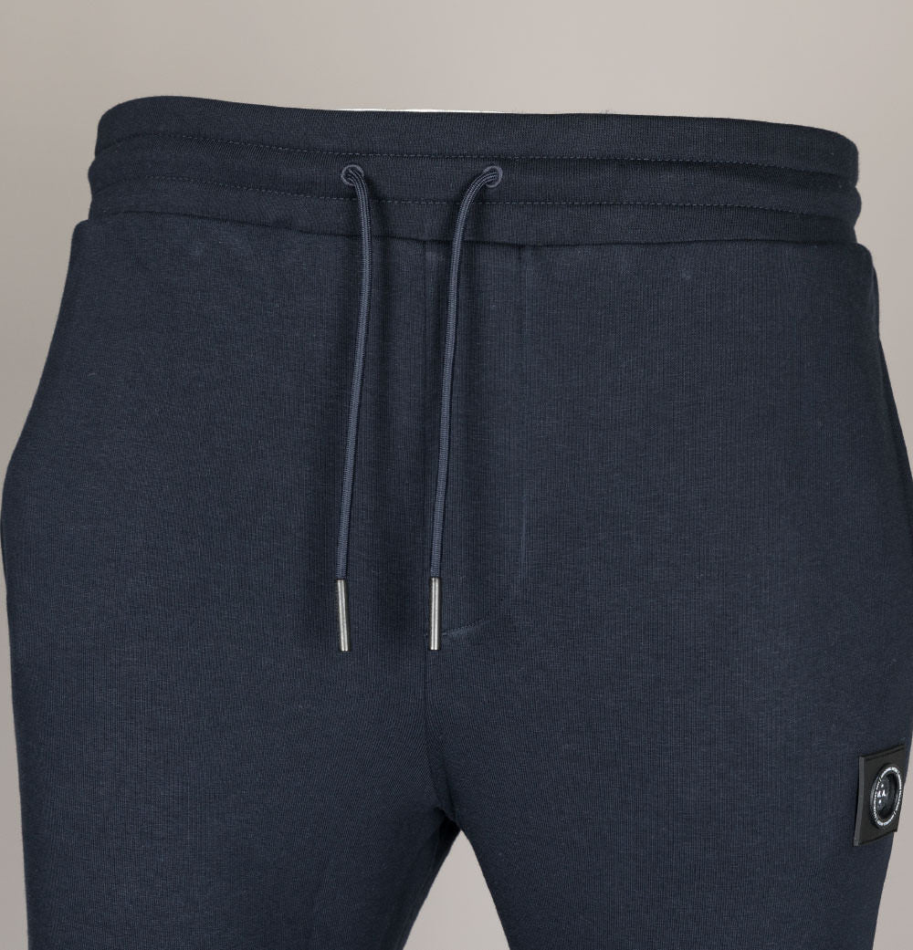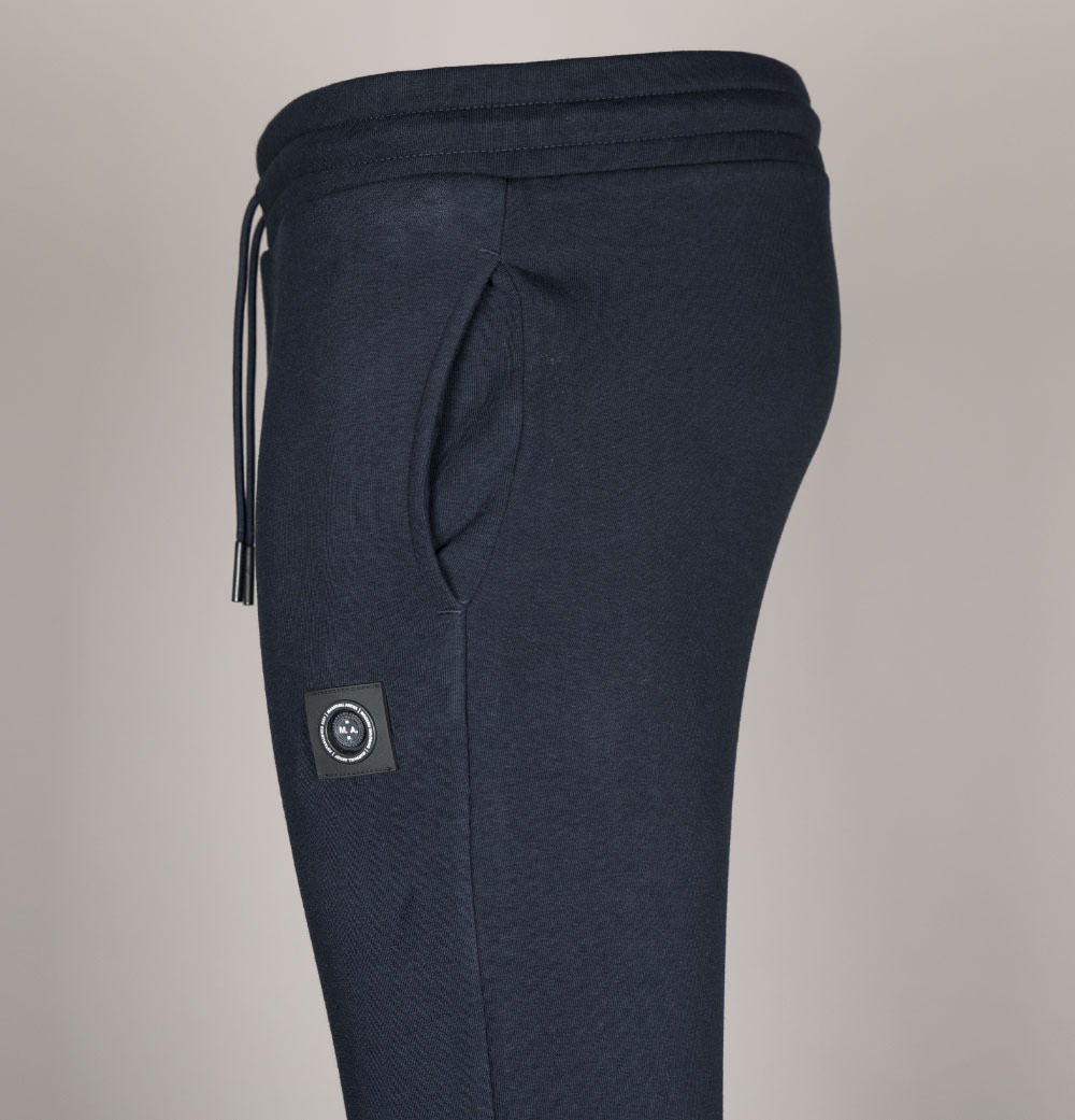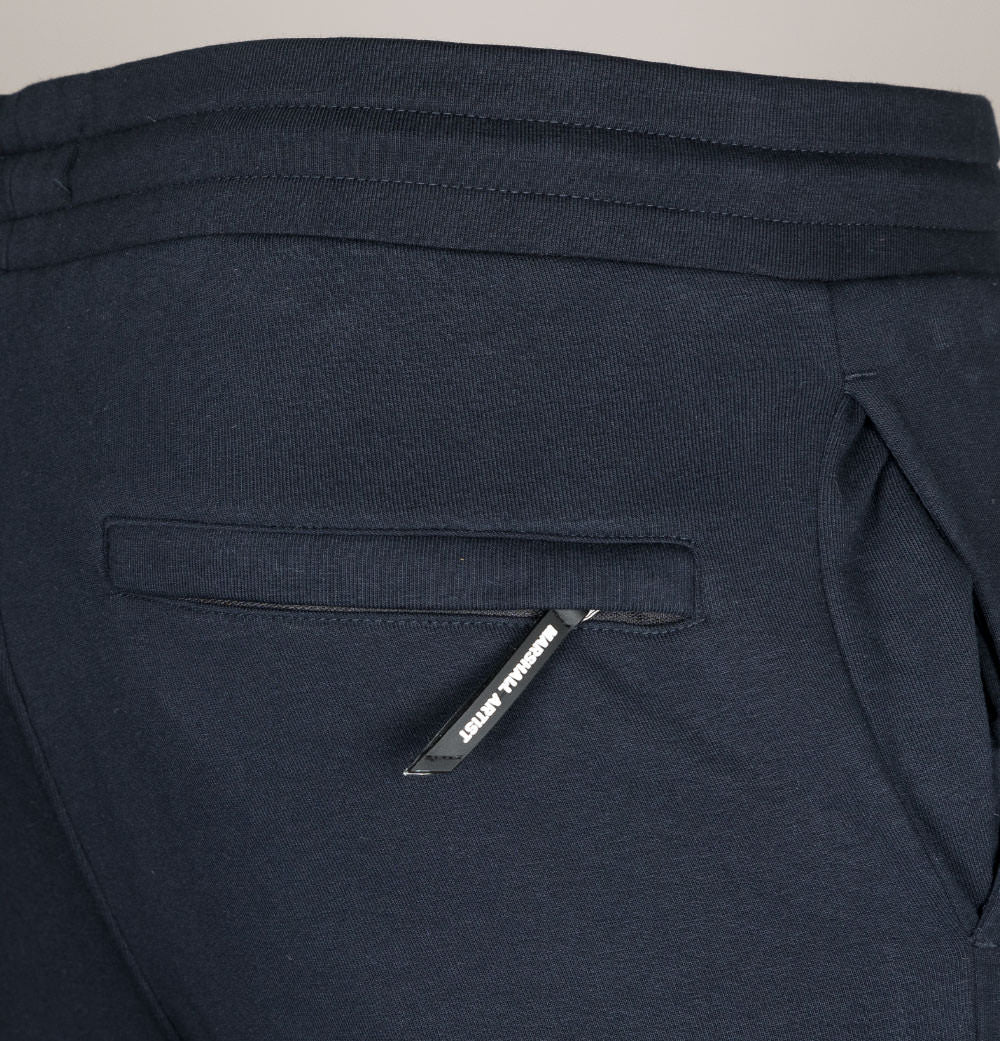 Marshall Artist Siren cotton joggers. Navy Blue soft fleece back cotton fabric. Rounded draw cord waistband. Two side pockets. One back zip pocket with a rubber Marshall Artist branded puller. Rubber Marshall Artist Siren badge on the left leg. Ribbed ankle cuffs. Regular fit waist with slightly tapered legs. 65% cotton, 35% polyester.