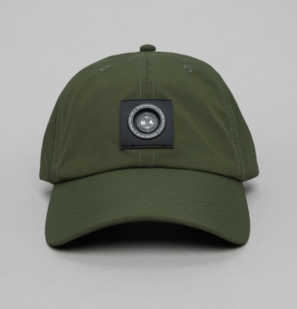Marshall Artist Siren cap. Khaki nylon ripstop fabric. 6 panel design with embroidered air vent holes. Curved peak with tonal stitch detail. Embroidered Marshall Artist Siren badge on the front. Adjustable strap with laser etched clasp. One size. 100% nylon.
