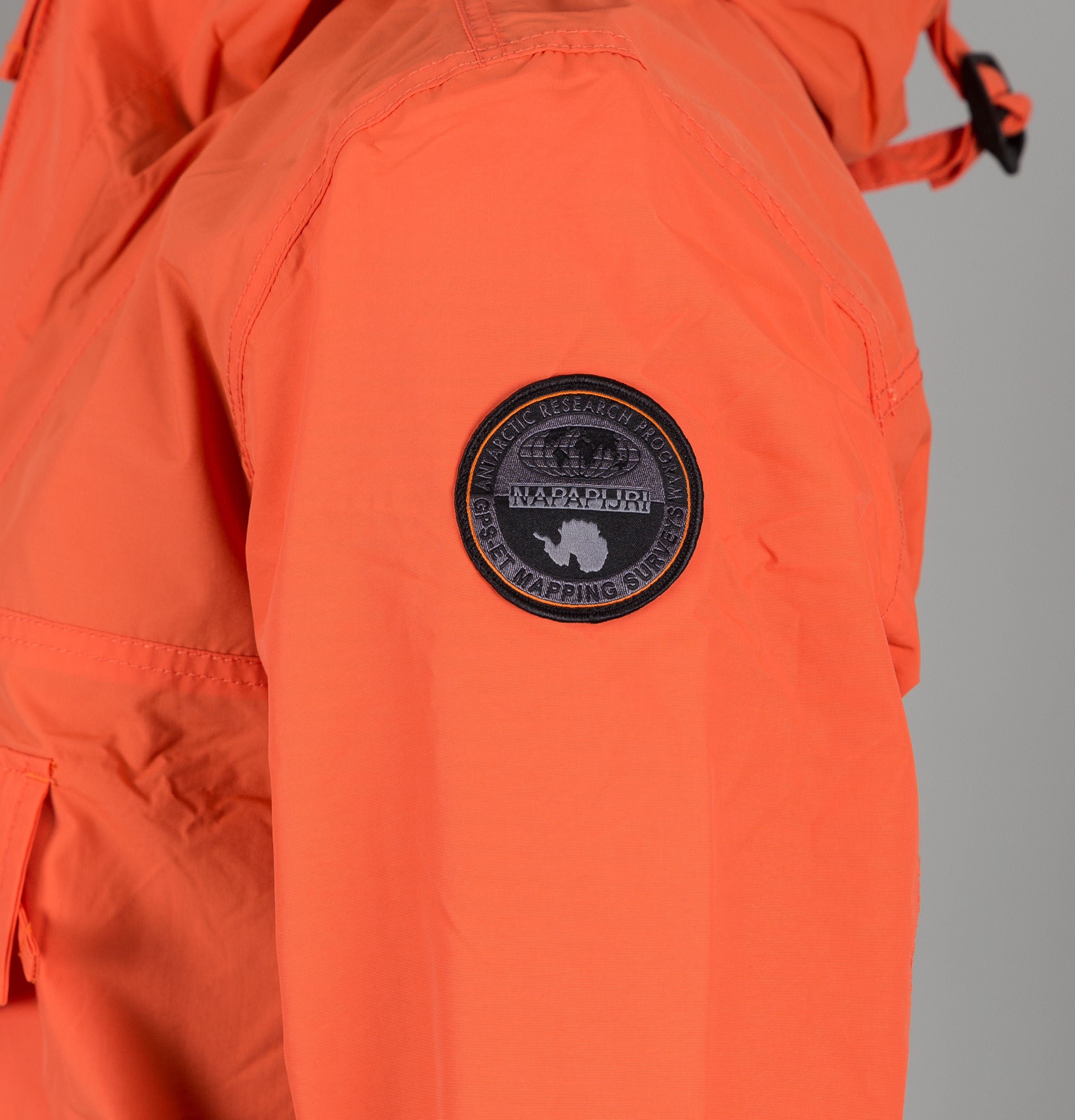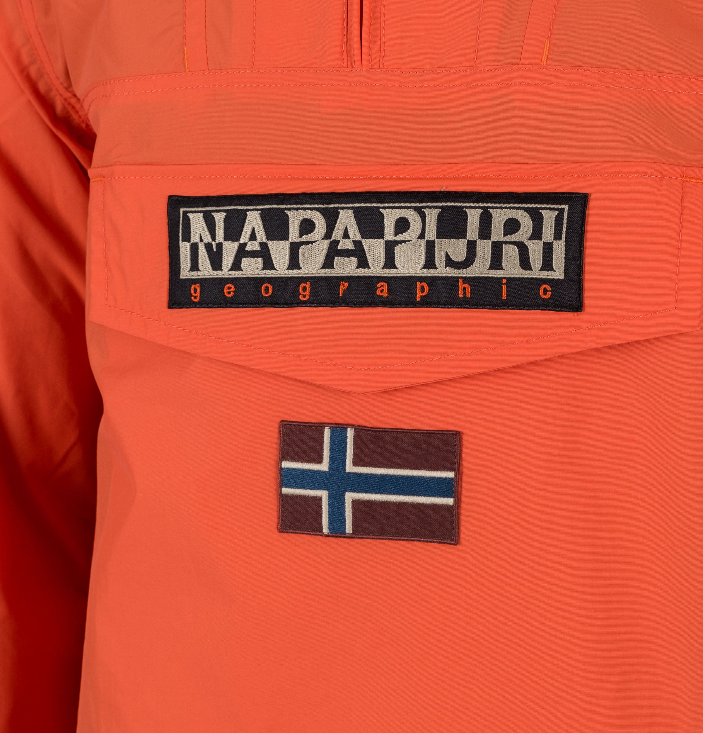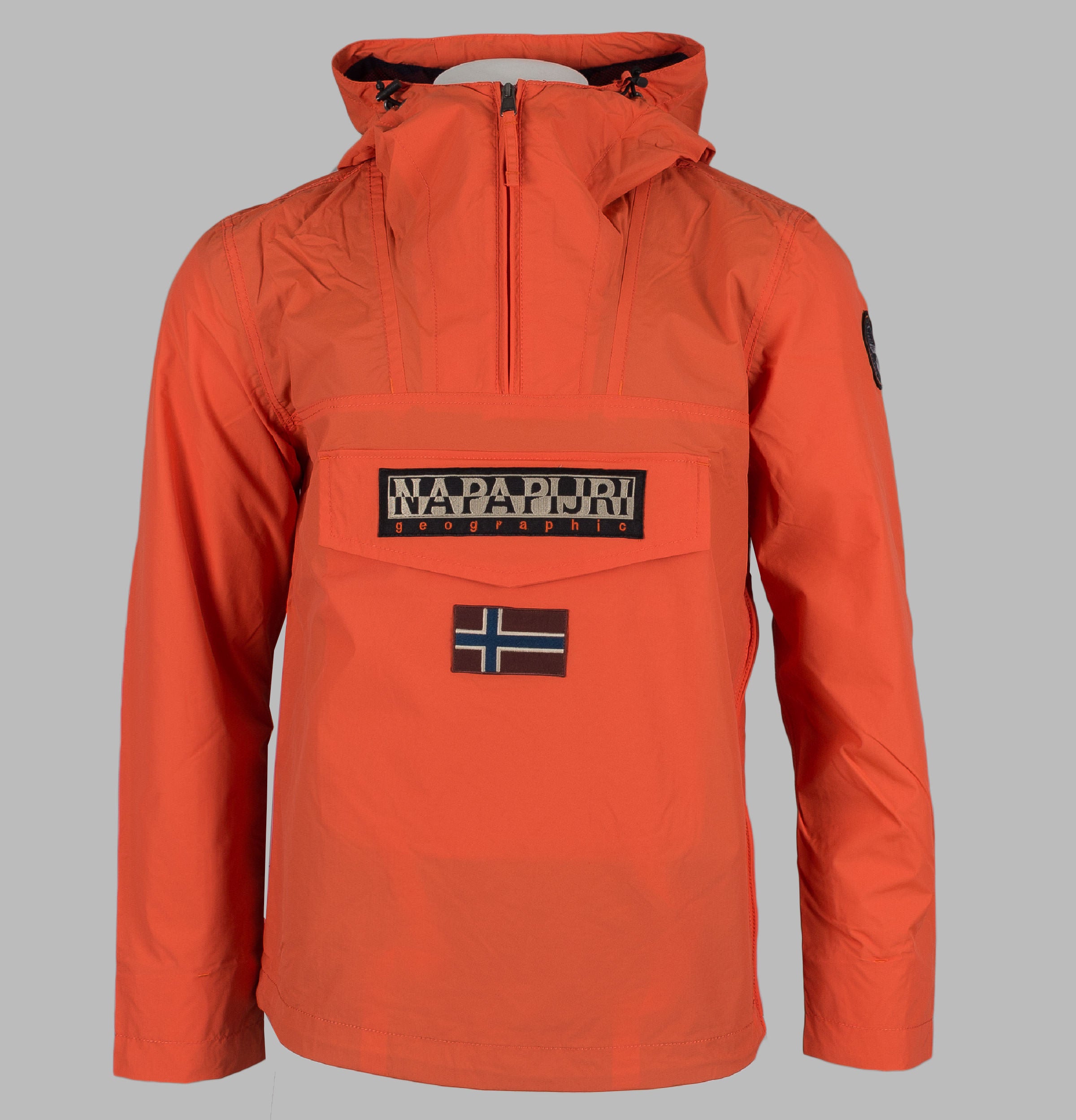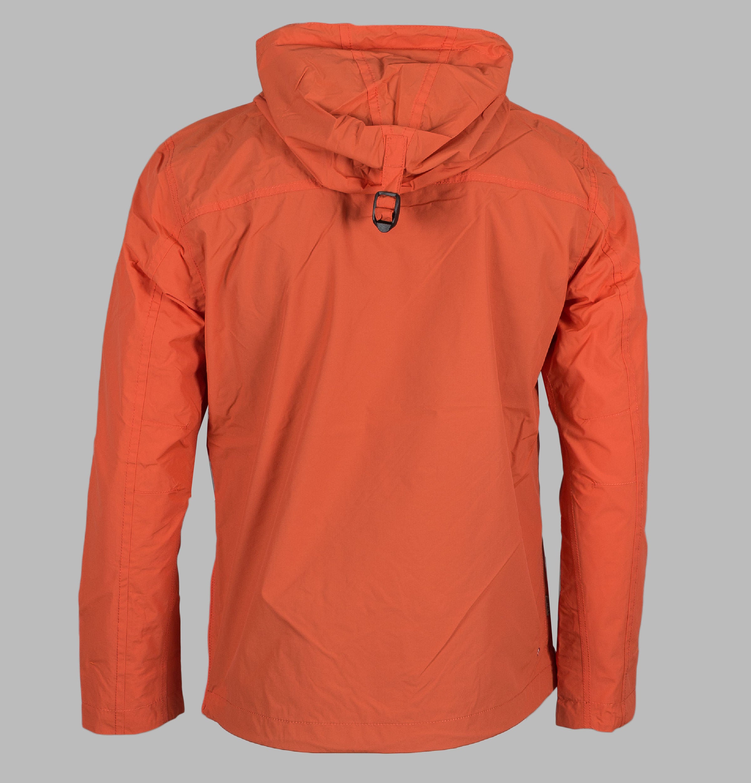 Napapijri Rainforest Summer Jacket. Orange mesh lined pullover hooded Anorak. Quarter zip fastening. Large signature Napapijri front flap kangaroo pocket with zip and velcro closure. Napapijri badge on the sleeve. Side seam opening with full zip closure. Concealed elasticated cuffs. Adjustable bungee cord hood and hem. Ventilation eyelets. Mesh lining on the inside and inside the hood. Lightweight and Waterproof. Breathable fabric MVP 3000g/m2-24 hours. Regular Fit. Outer Shell: 100% Polyamide, Body & Hood lining: 100% Polyester.