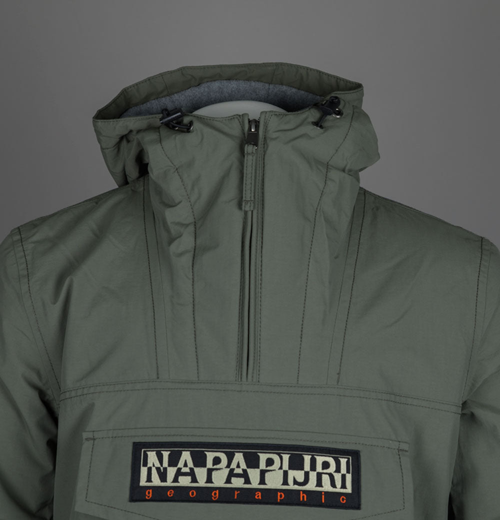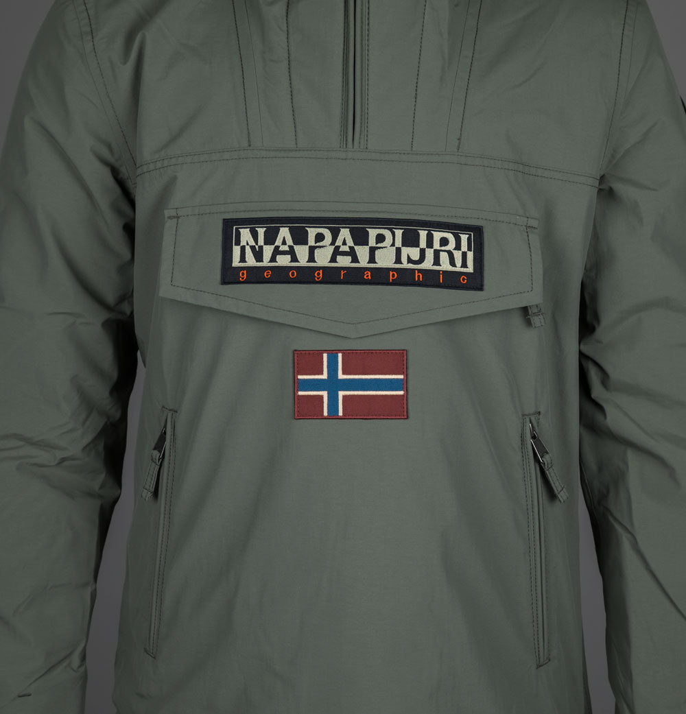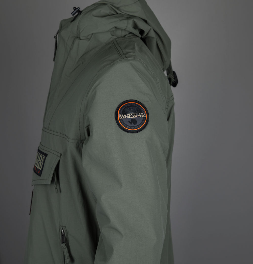 Napapijri Rainforest Pocket 2 jacket in Tea Leaf. Fleeced lined pullover hooded anorak. Quarter zip fastening. Large Napapijri branded front flap pocket with zip and velcro closure. Embroidered iconic Norwegian flag. Two front zip pockets. Embroidered Napapijri badge on the sleeve. Side seam opening with zip closure. Concealed elasticated sleeve cuffs. Adjustable bungee cord hood and hem. Ventilation eyelets. Fleeced lining on the inside and inside the hood. Regular fit. 100% polyamide. Waterproof fabric 2000-5000mm H20. Breathable fabric MVP 3000g/m2-24 hours.
