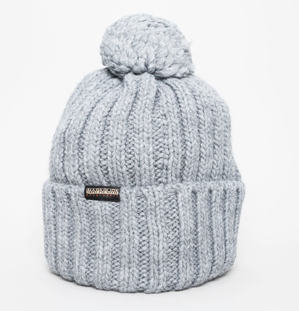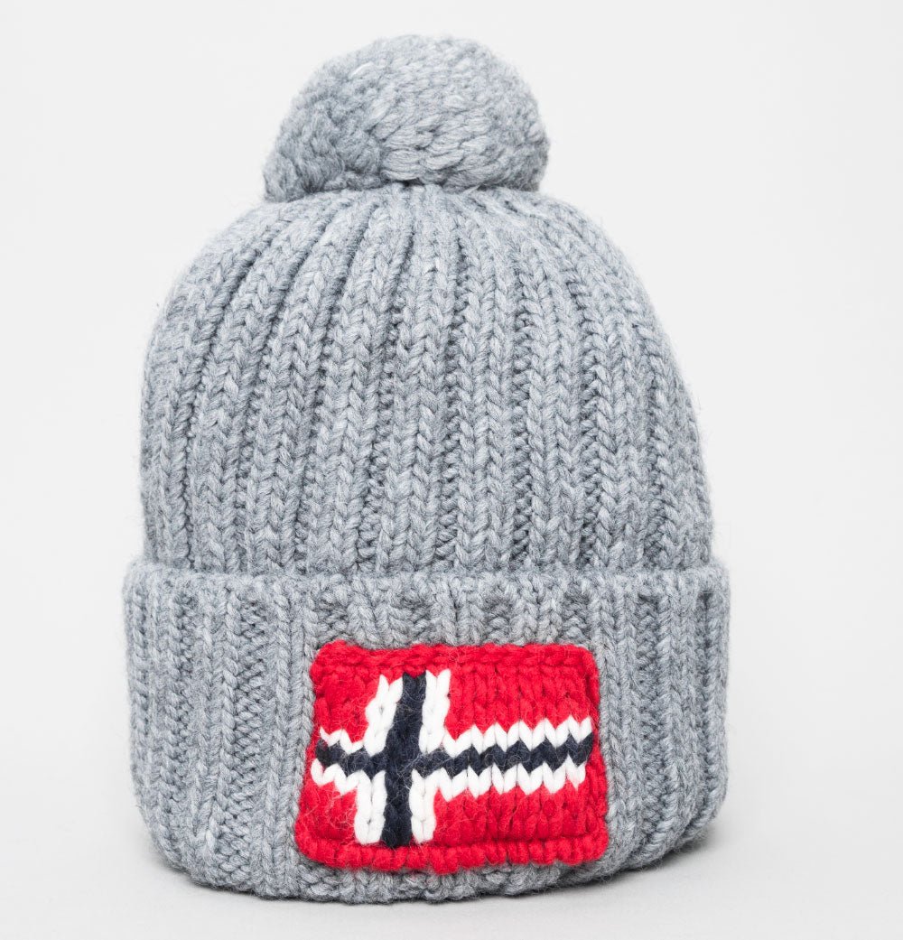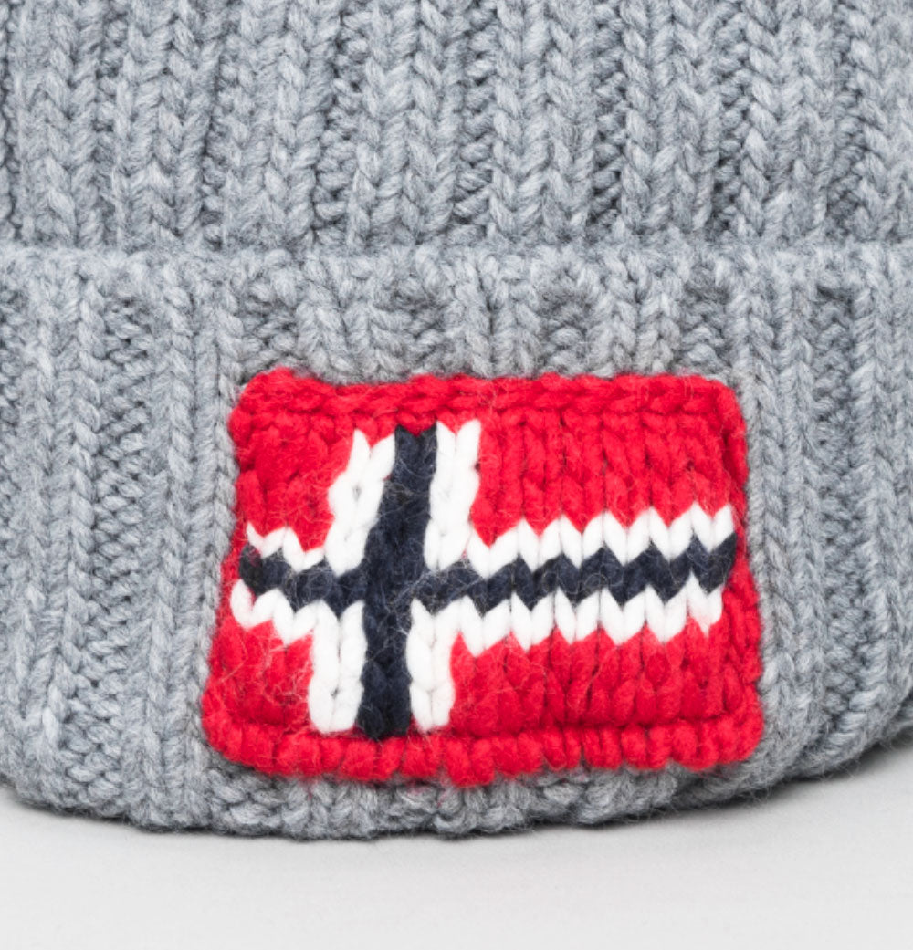 Napapijri Semiury 5 bobble beanie. Medium Grey chunky knitted beanie. Fold over front with knitted Norwegian flag across the front. Small embroidered signature Napapijri branded tag on the back. Finished with a top bobble. One size fits most. 75% acrylic, 10% wool, 10% polyamide, 5% viscose.
