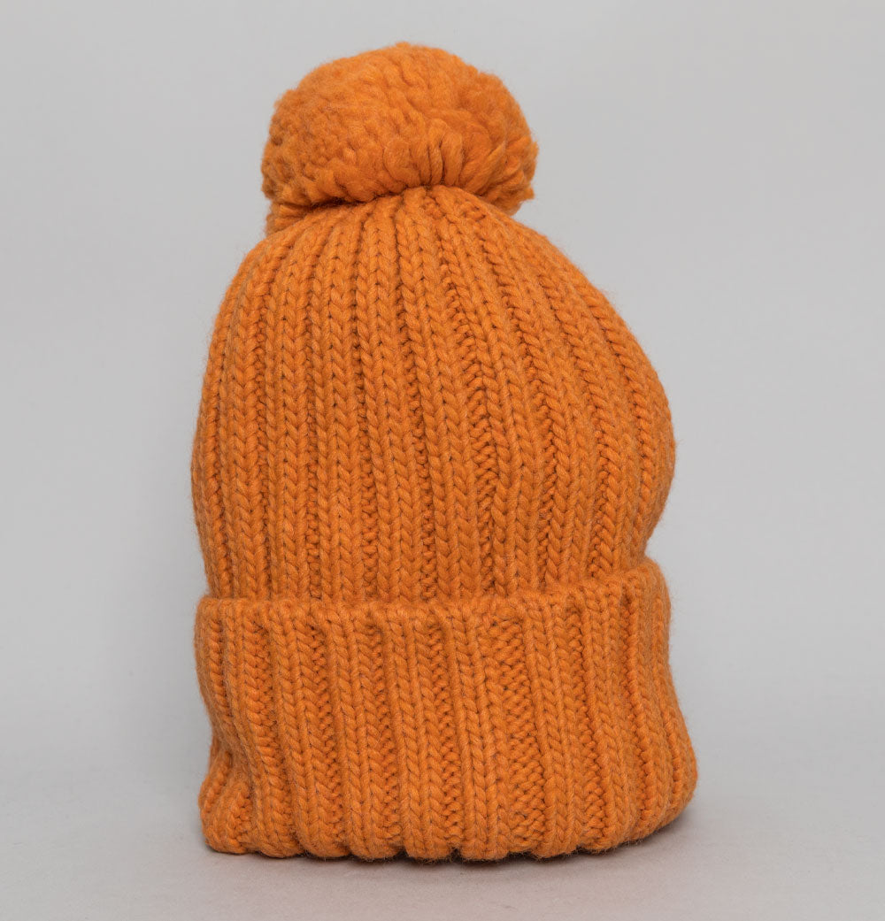 Napapijri Semiury bobble beanie in Orange Pumpkin. Chunky knitted fabric. Fold over front with knitted Norwegian flag. Finished with a top bobble. One size fits most. 75% acrylic, 10% wool, 10% polyamide, 5% viscose.