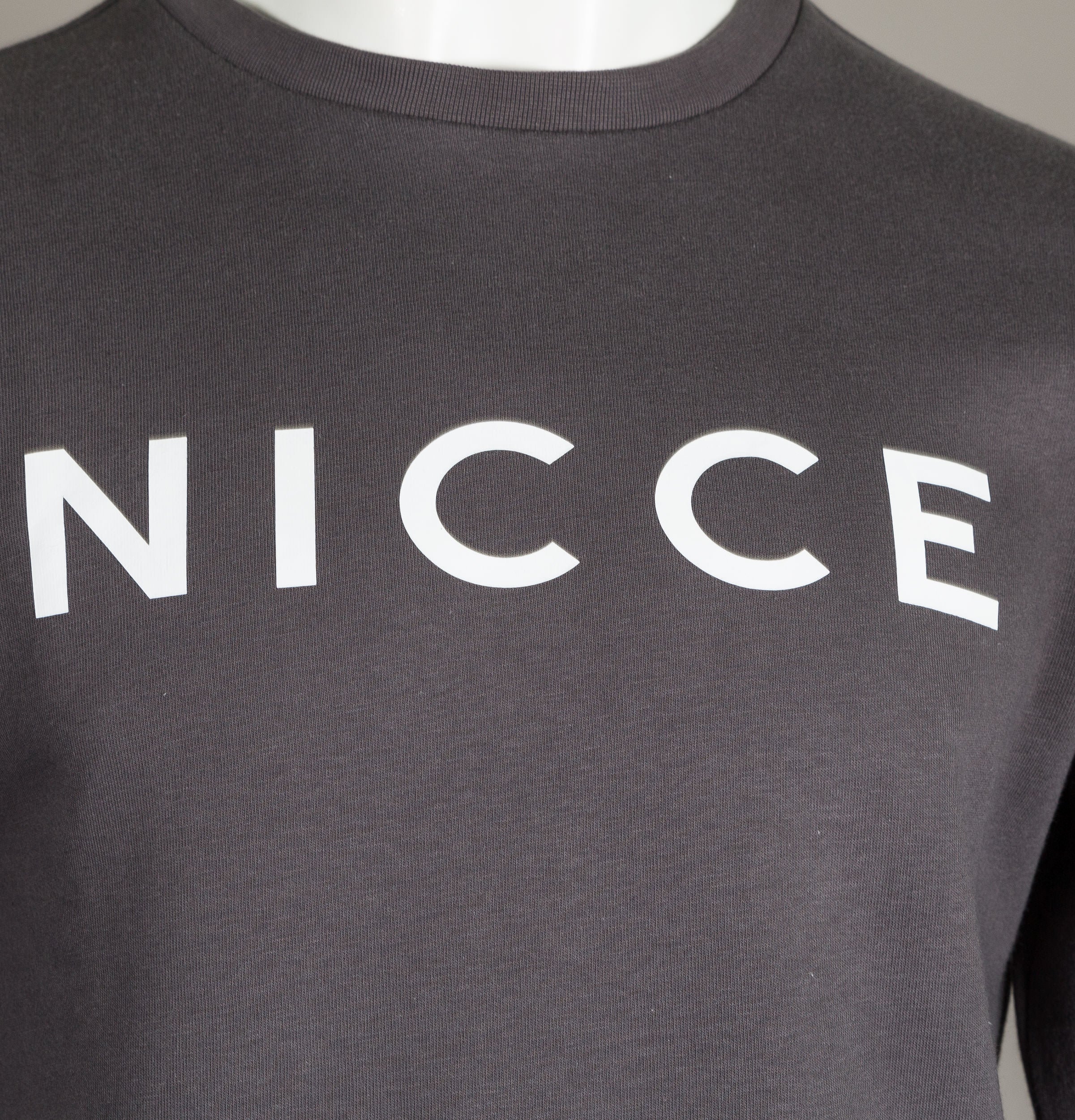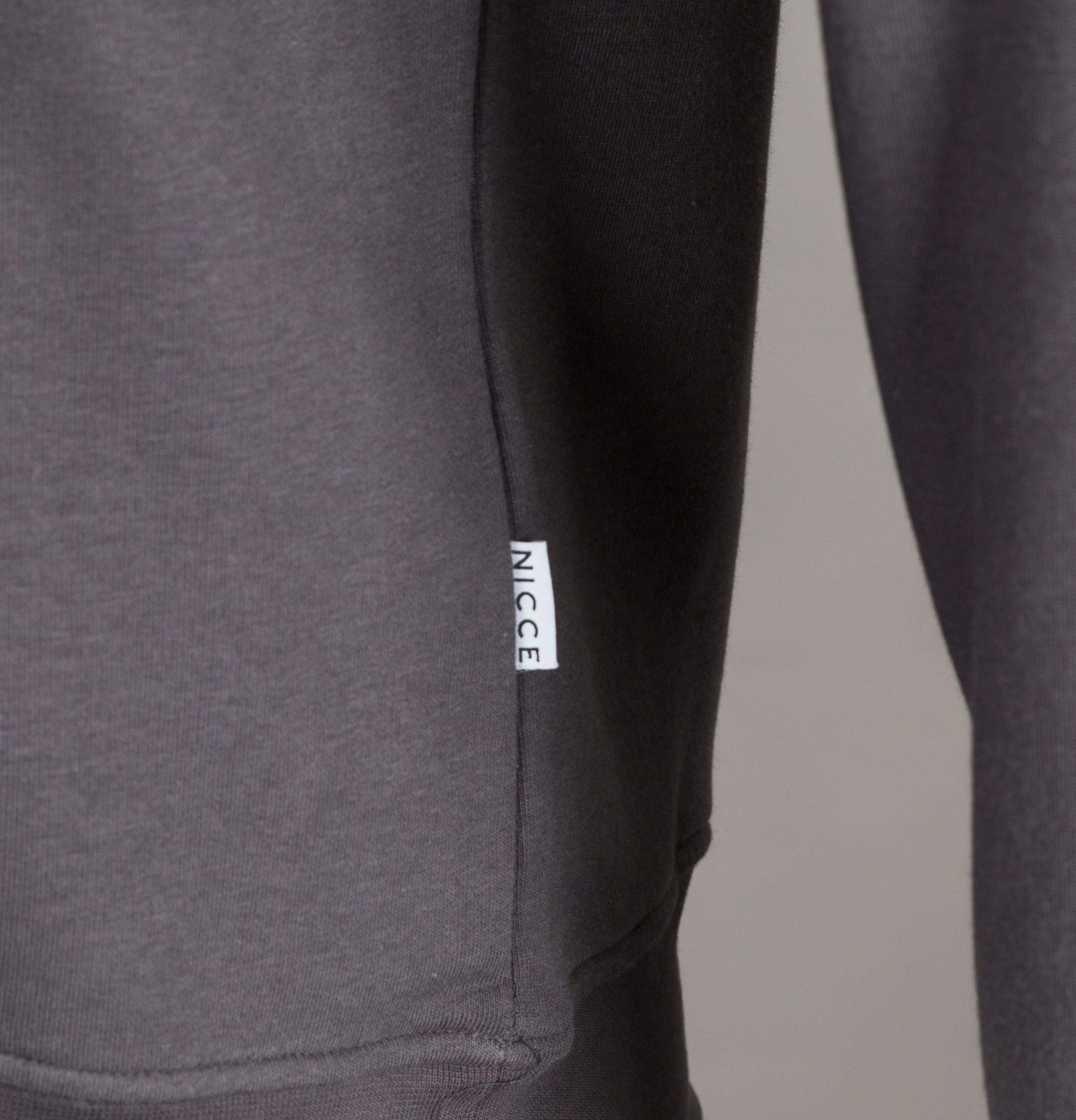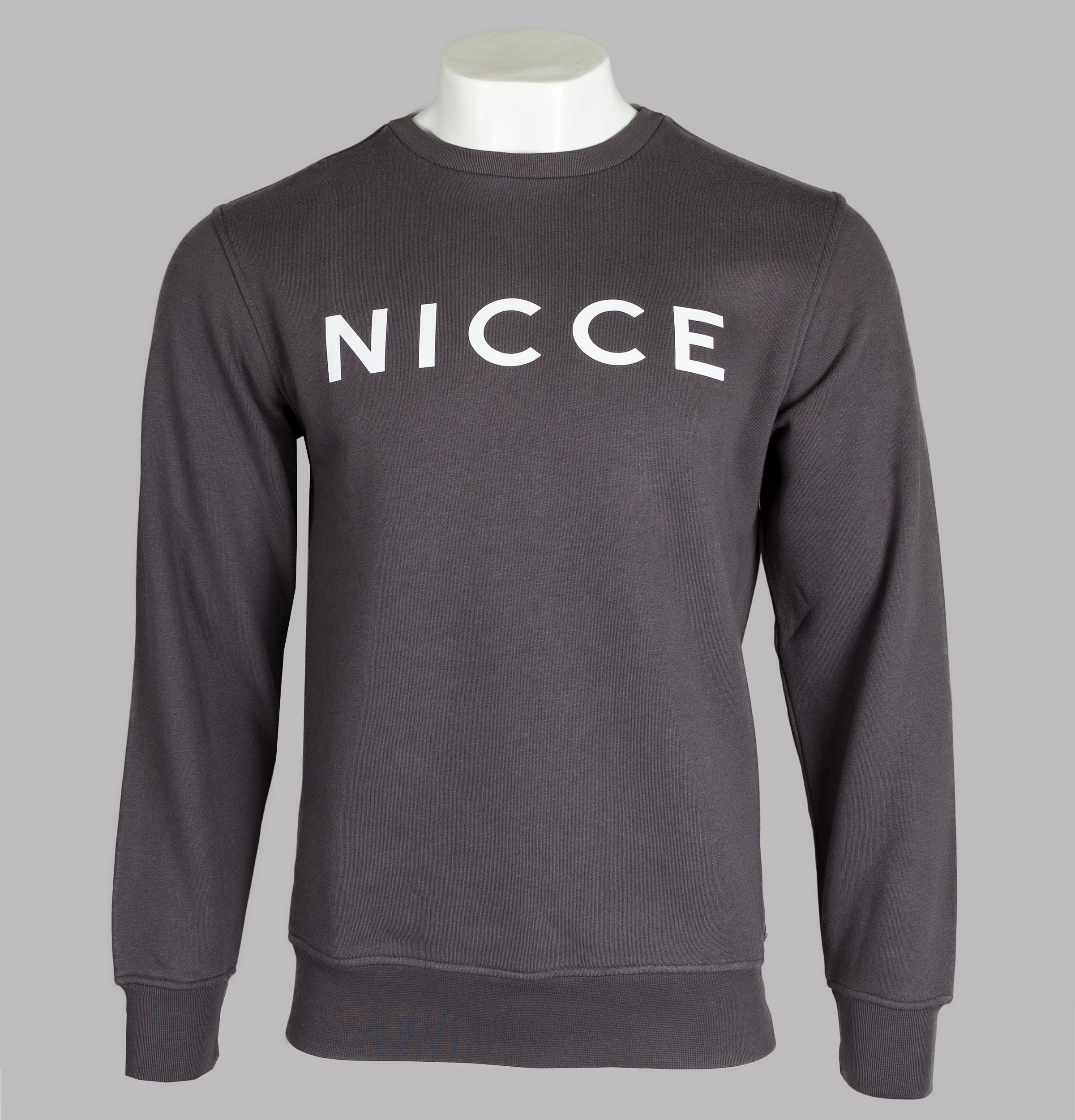 Nicce crew neck original logo sweatshirt. Coal Grey soft fleece back cotton fabric. Large Nicce signature logo printed on the chest in White. Small Nicce branded tag on the seam. Ribbed sleeve cuffs and waistband. Regular fit. 50% cotton, 50% polyester.
