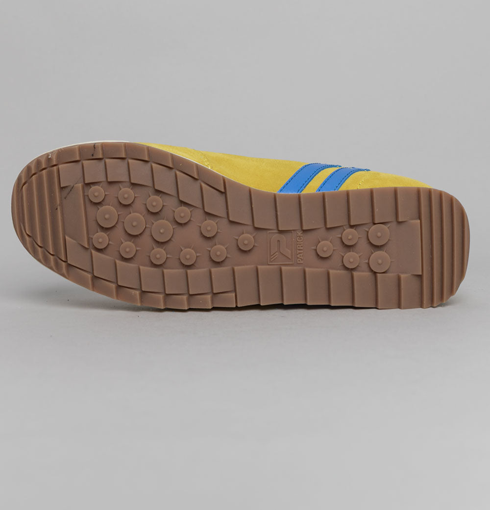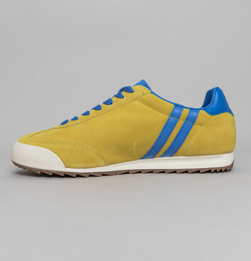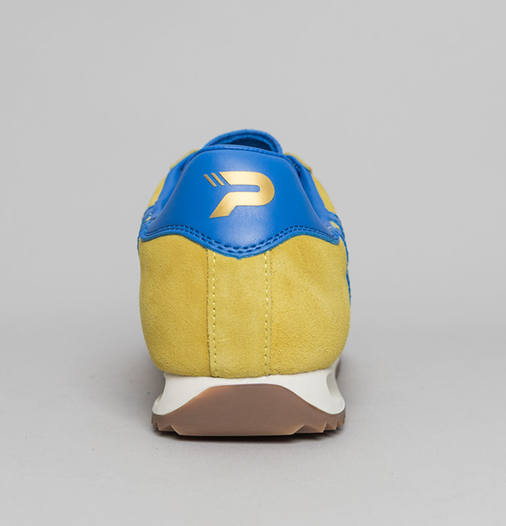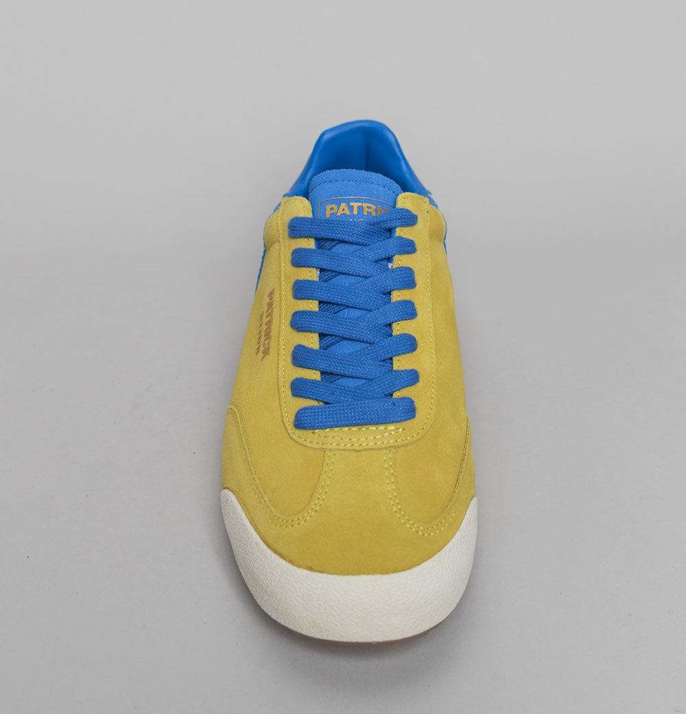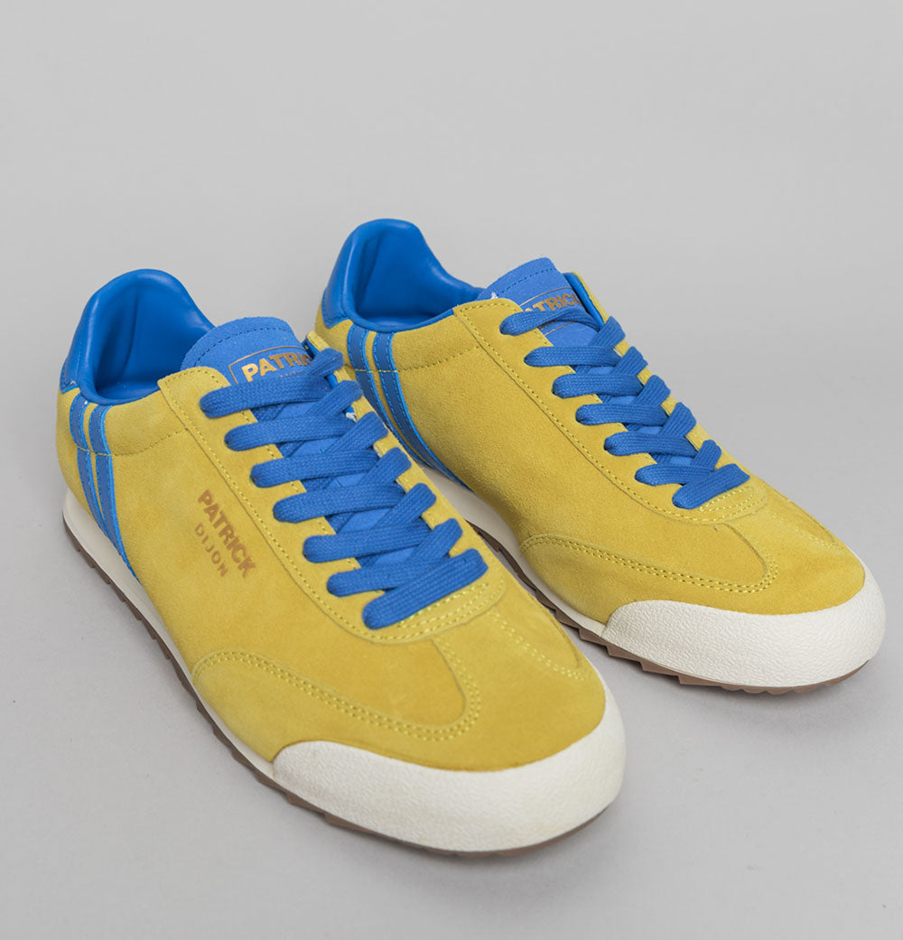 Patrick Dijon trainers in Yellow/Royal Blue. Yellow premium suede uppers. Royal Blue leather panel detail. Royal Blue leather heel tab with Gold Patrick branding. Gold printed Patrick Dijon branding. Lace up fronts. Tonal stitch detail. Rubber soles. All UK standard sizes.