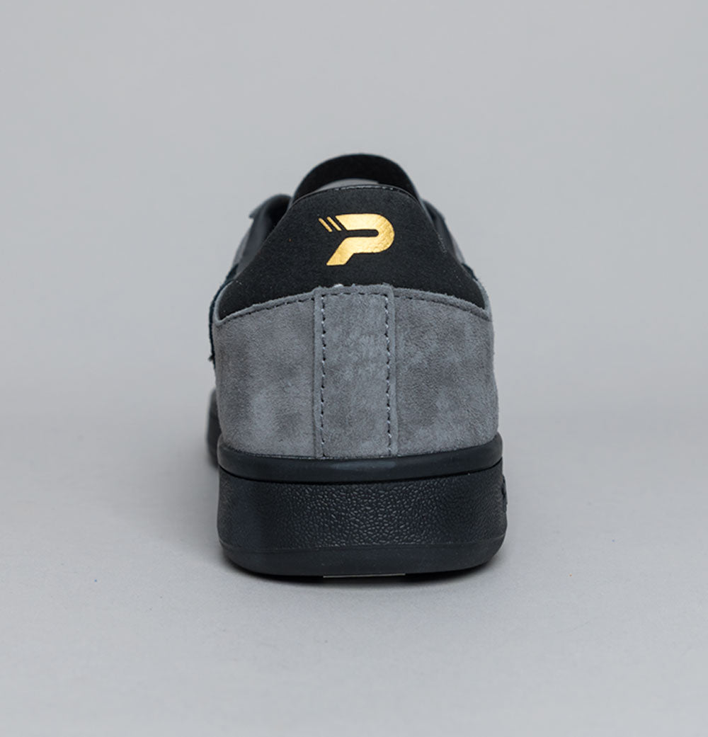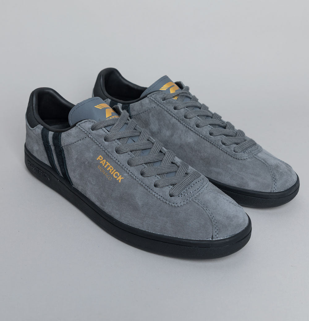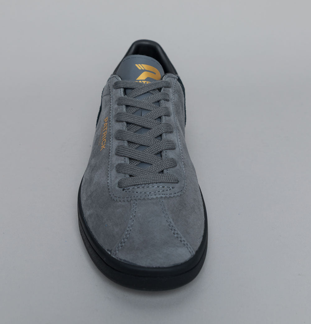 Patrick Monaco cupsole trainers in Charcoal/Black. Charcoal Grey premium suede uppers. Black leather panel detail. Black leather heel tab with Gold Patrick branding. Gold Patrick Monaco branding printed on the sides. Lace up fronts. Gum rubber cupsole. All UK standard sizes.