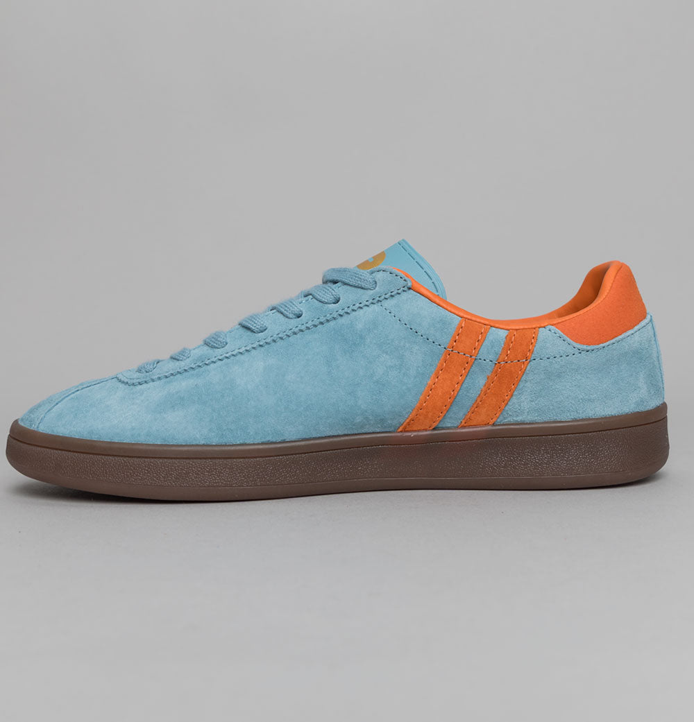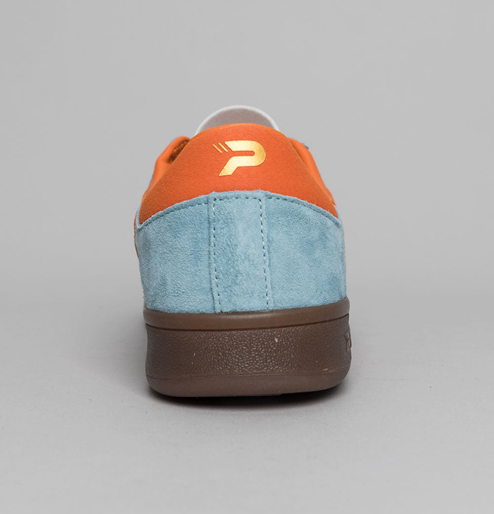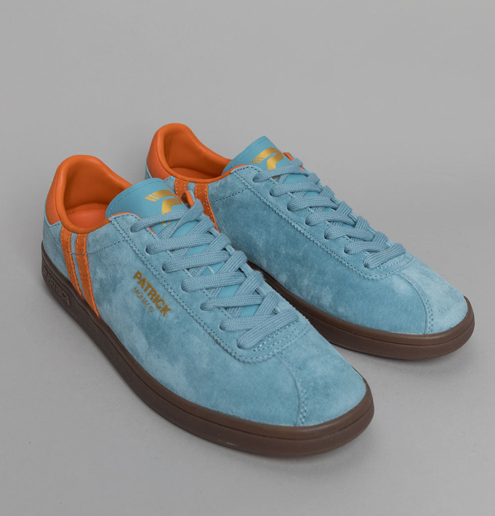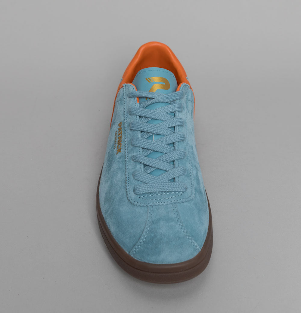 Patrick Monaco cupsole trainers in Light Blue/Orange. Light Blue premium suede uppers. Orange leather panel detail. Orange leather heel tab with Gold Patrick branding. Gold Patrick Monaco branding printed on the sides. Lace up fronts. Gum rubber cupsole. All UK standard sizes.
