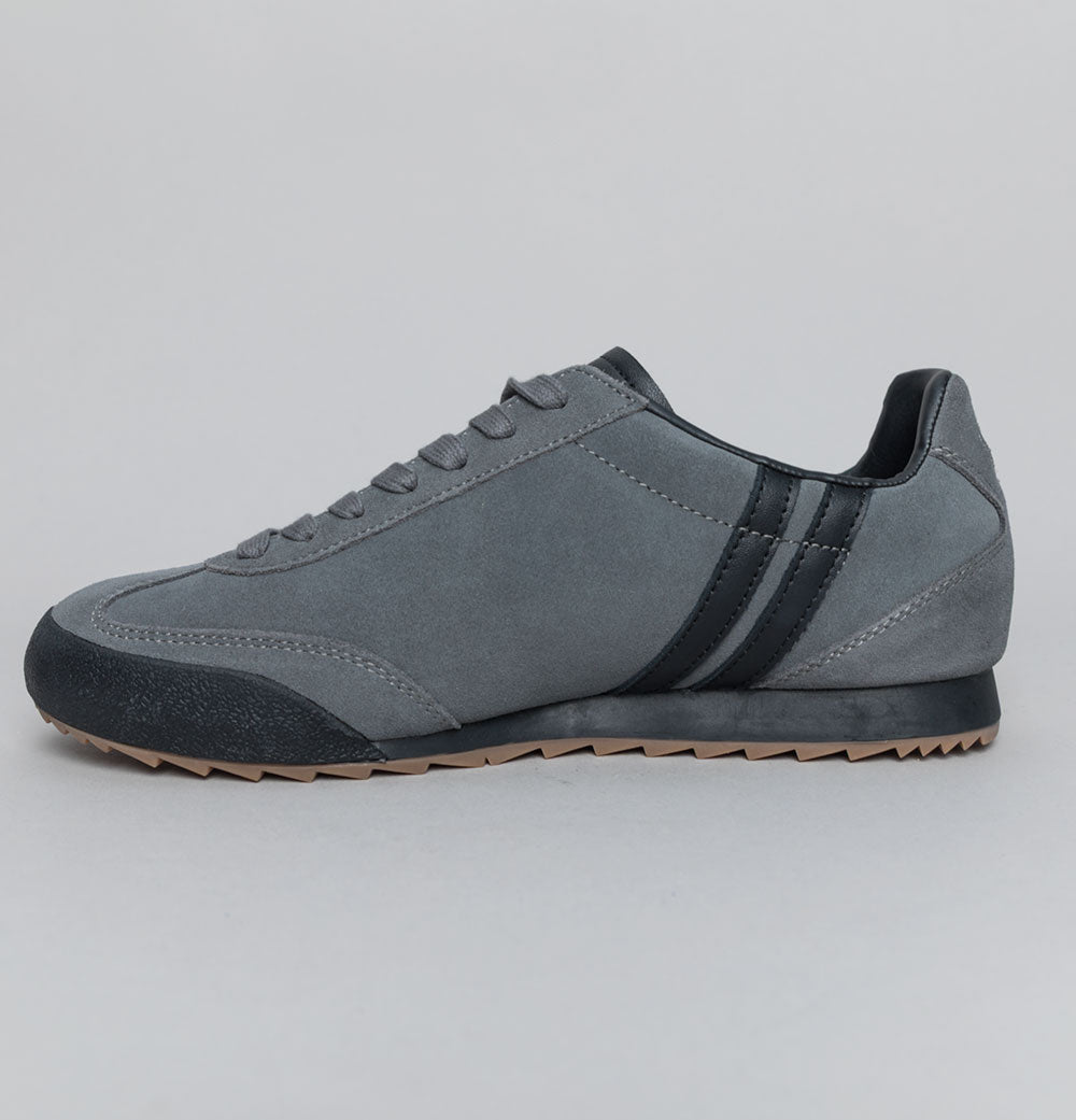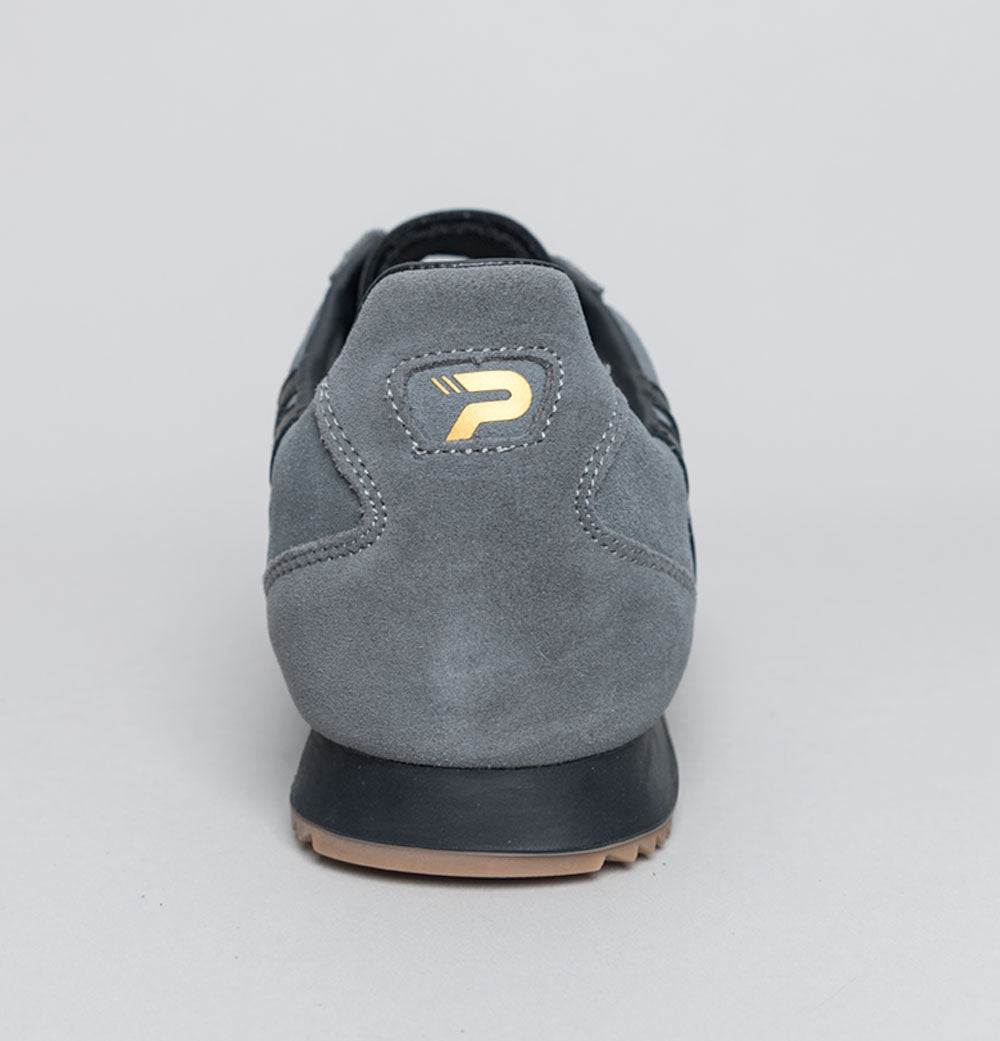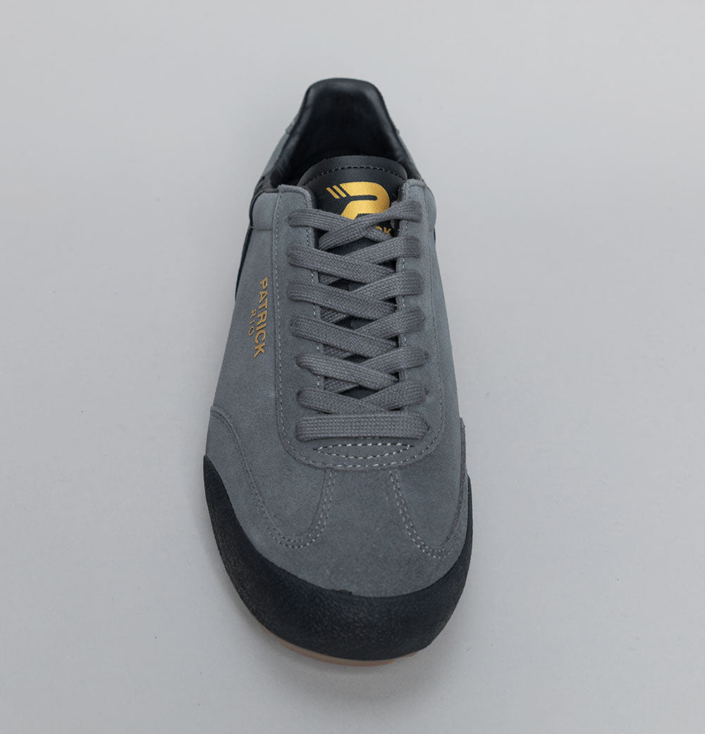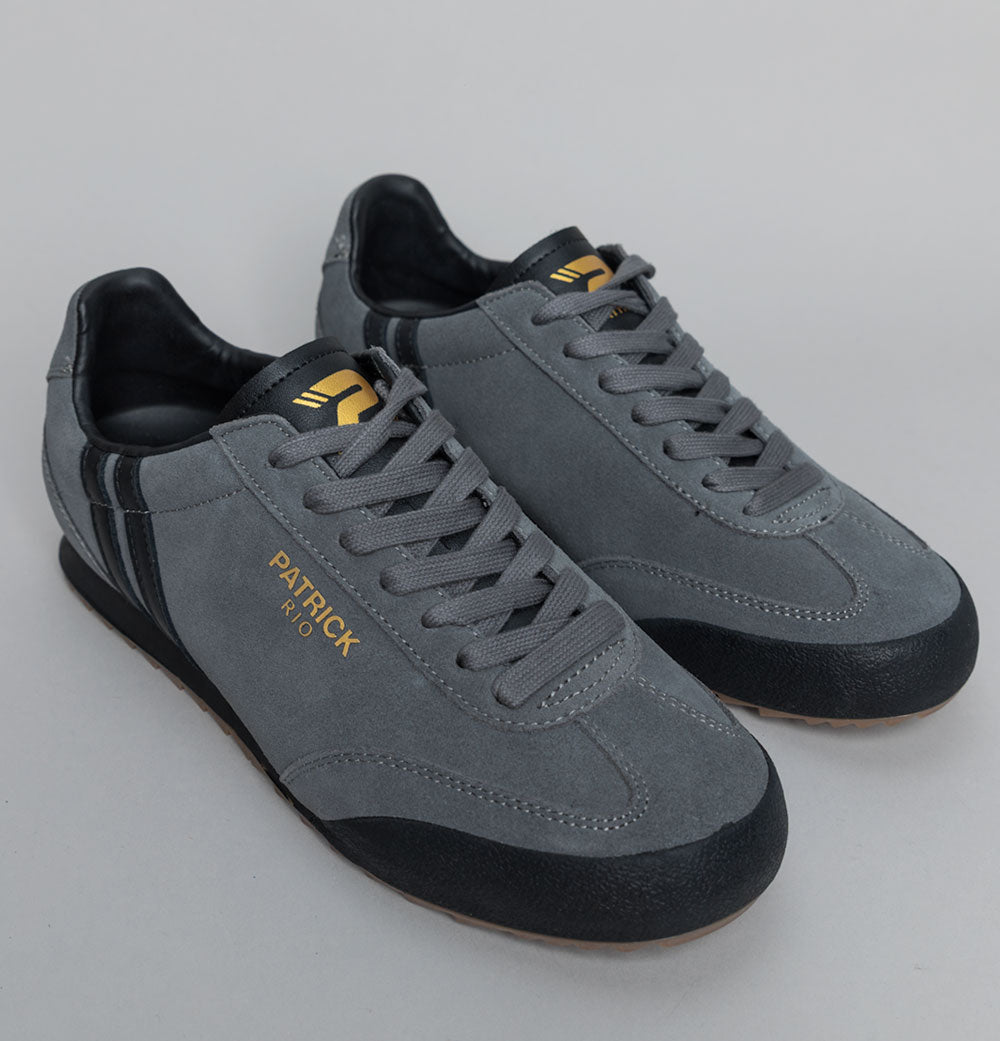 Patrick Rio Trainers in Charcoal/Black. Premium suede uppers. Black leather panel detail. Gold printed Patrick Rio branding. Lace up fronts. Tonal stitch detail. Black lining. Rubber soles. All UK standard sizes.