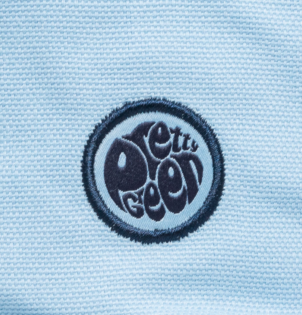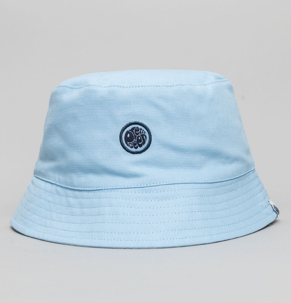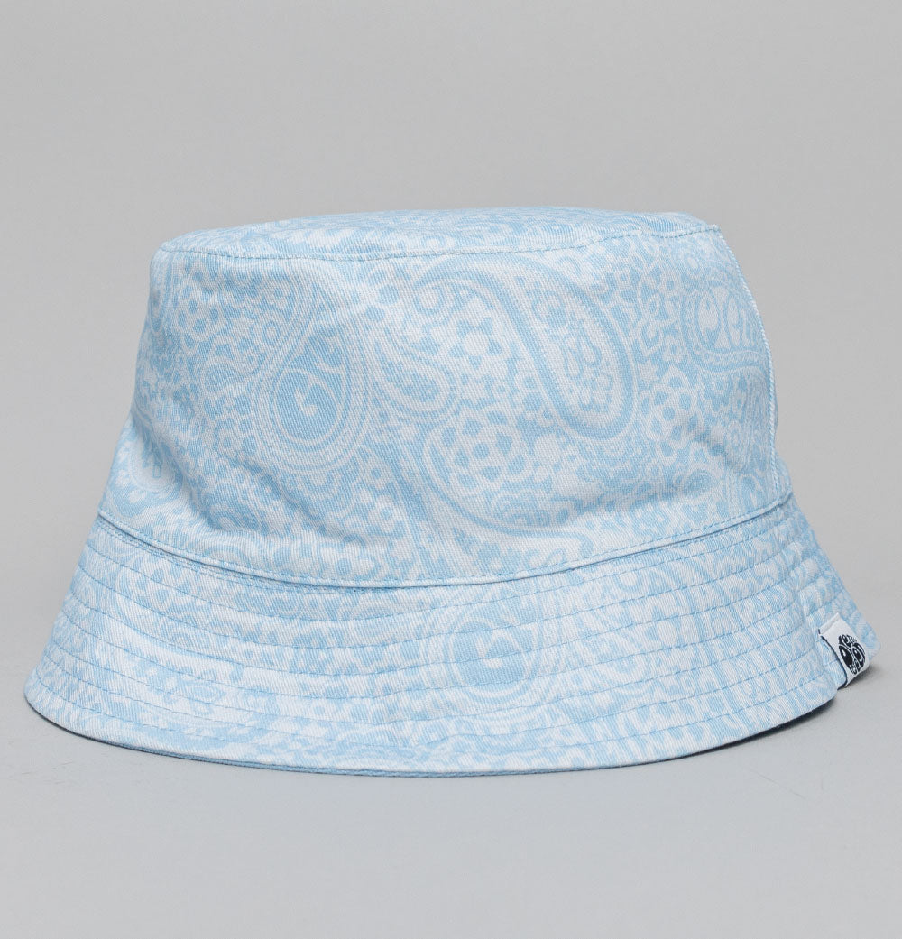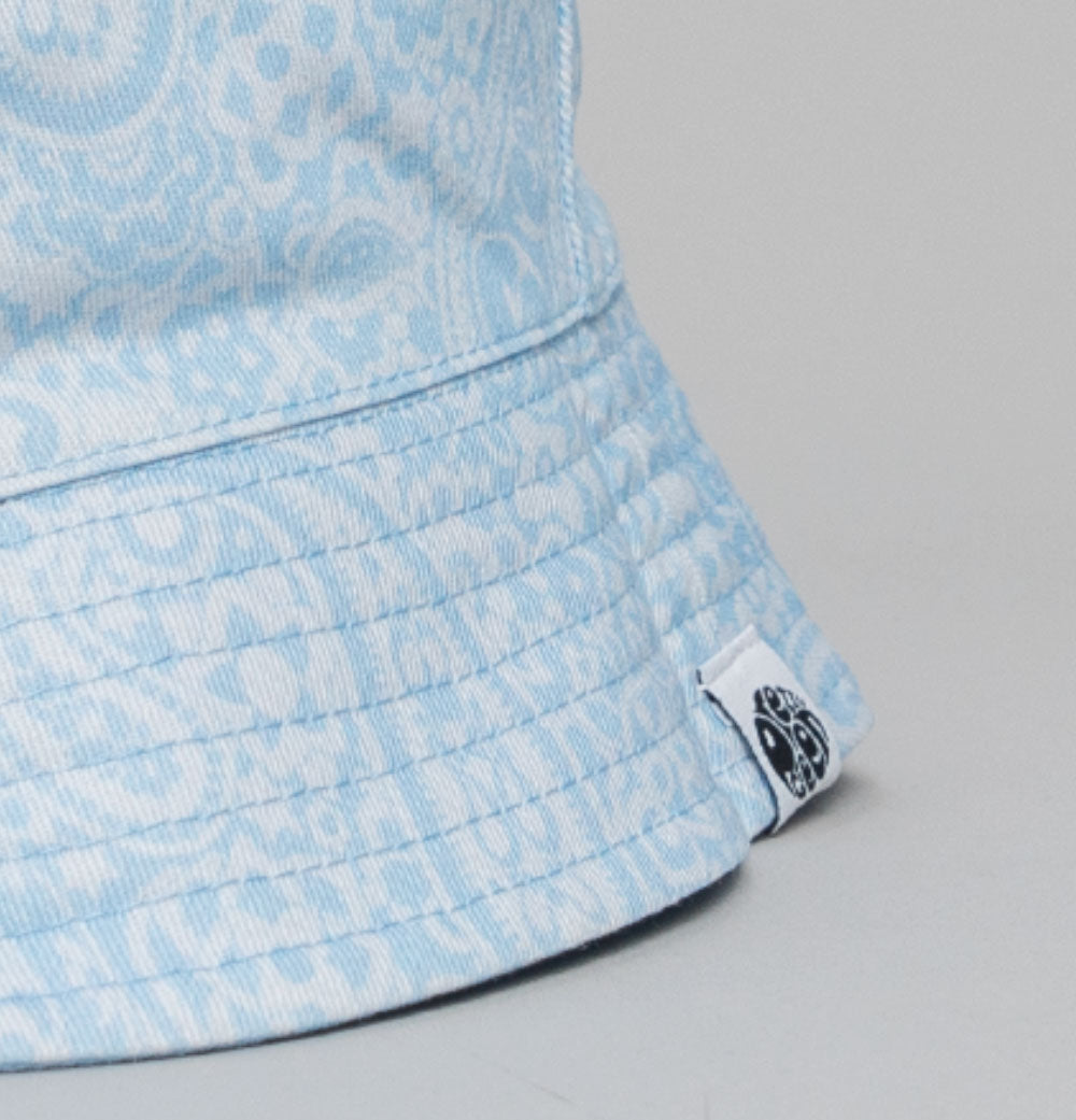 Pretty Green reversible tonal Paisley print bucket hat. Lightweight soft durable cotton fabric. Classic fisherman style. All over tonal Paisley print design on one side. Plain Light Blue on the reverse with an embroidered Pretty Green logo on the front panel. Soft brim with Pretty Green branded tag on both sides. 100% cotton.