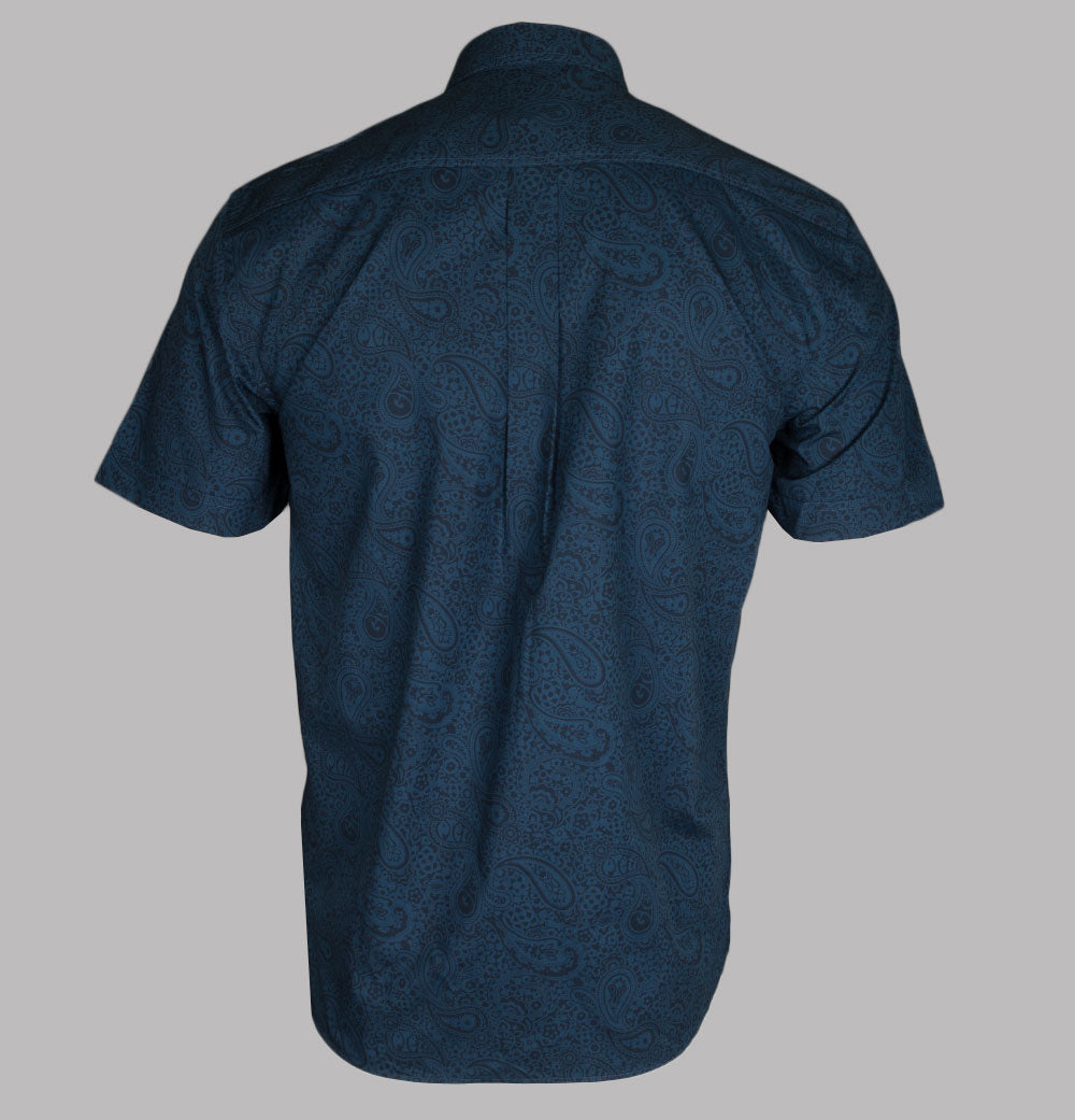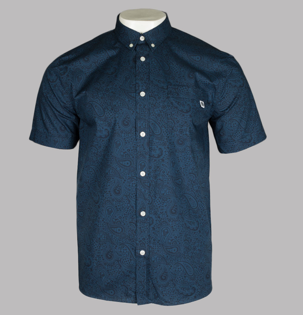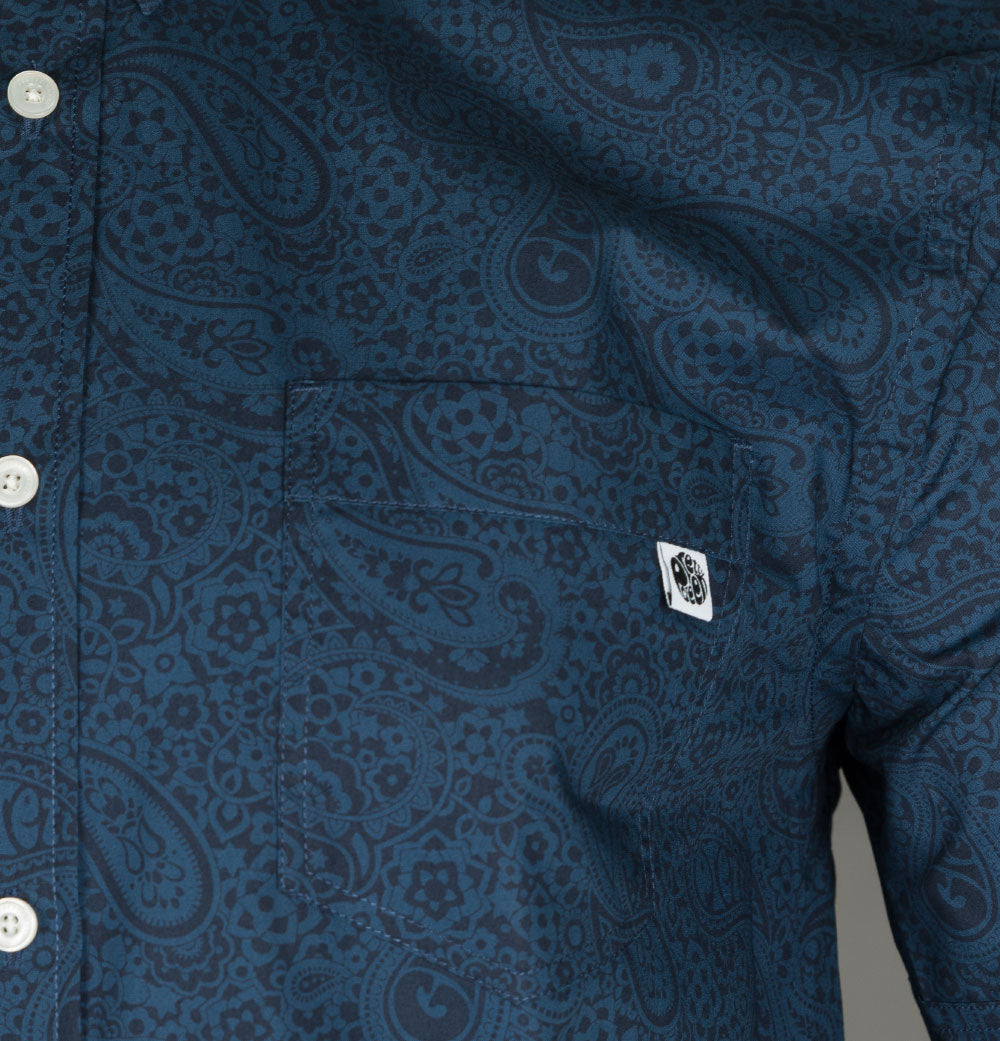 Pretty Green short sleeve tonal paisley shirt. Navy Blue lightweight cotton poplin fabric. All over tonal paisley print. Classic button down collar. Single chest pocket with with a Pretty Green branded tag. Pretty Green branded buttons. Tonal stitch detail. Slim fit. 100% cotton.