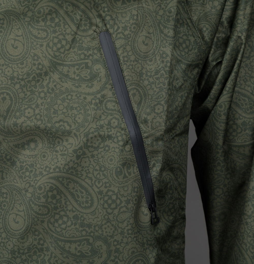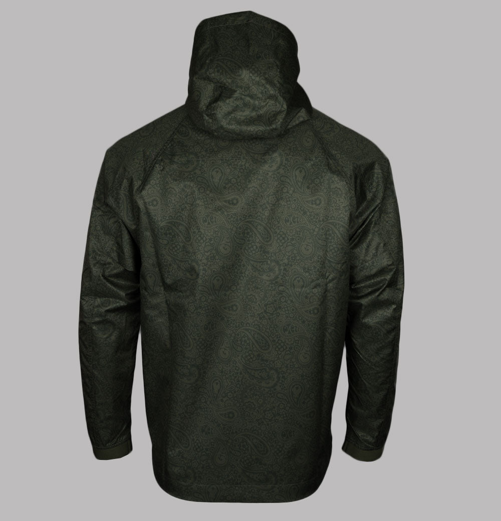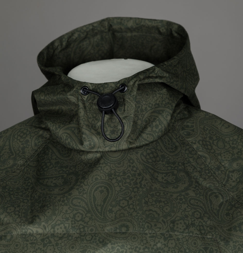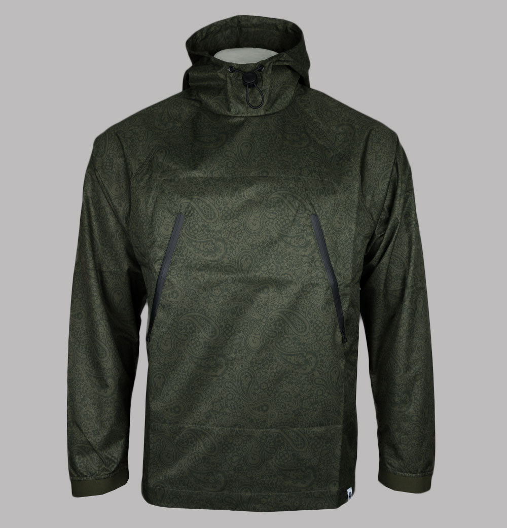 Pretty Green over the head tonal Paisley smock. Khaki lightweight water resistant polyester fabric. In house tonal Paisley design. Adjustable bungee cord hood. Large front zip pouch pocket with weather proof seals. Elasticated sleeve cuffs. Small Pretty Green branded tag on the seam. Regular fit. 100% polyester.