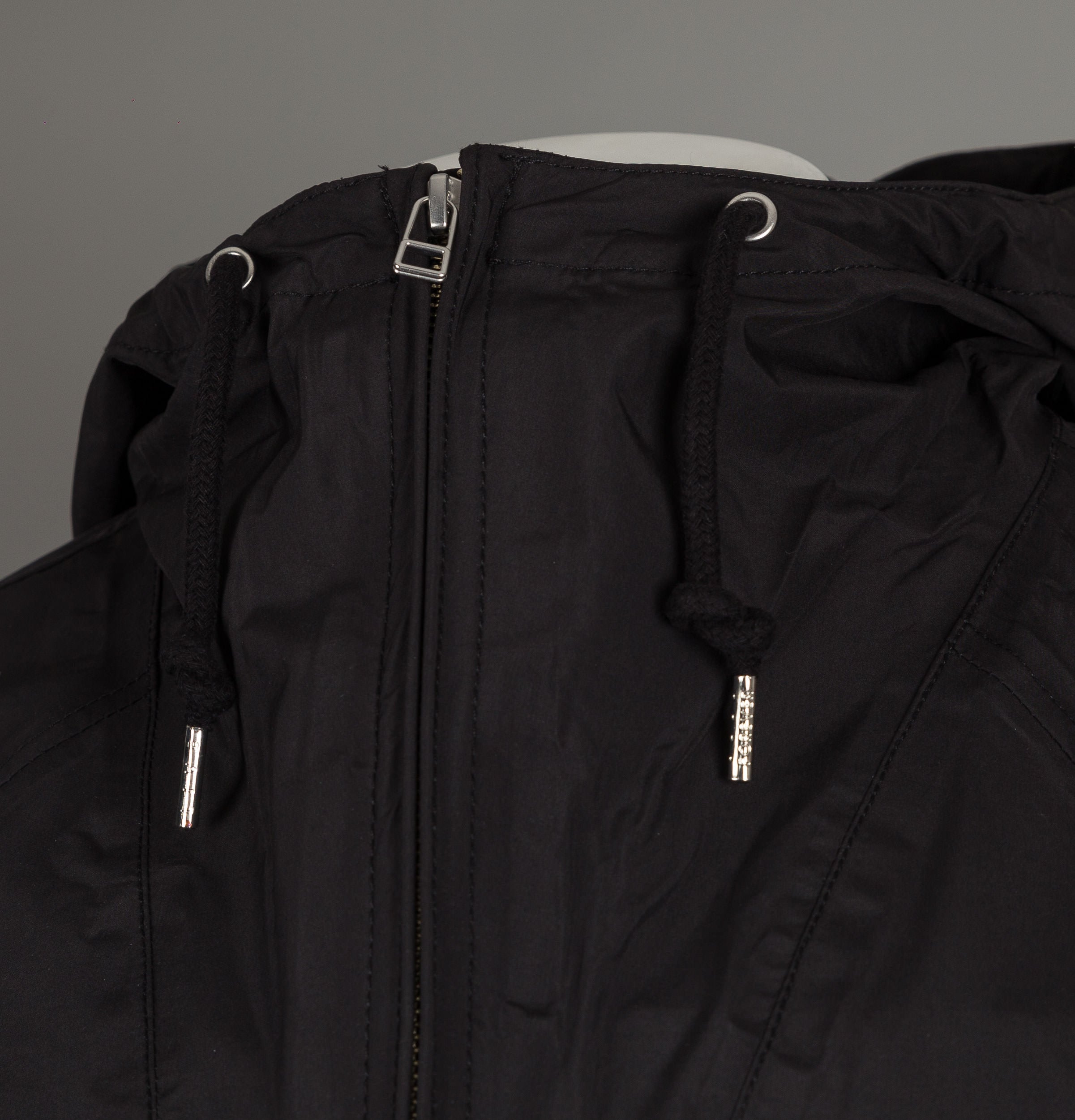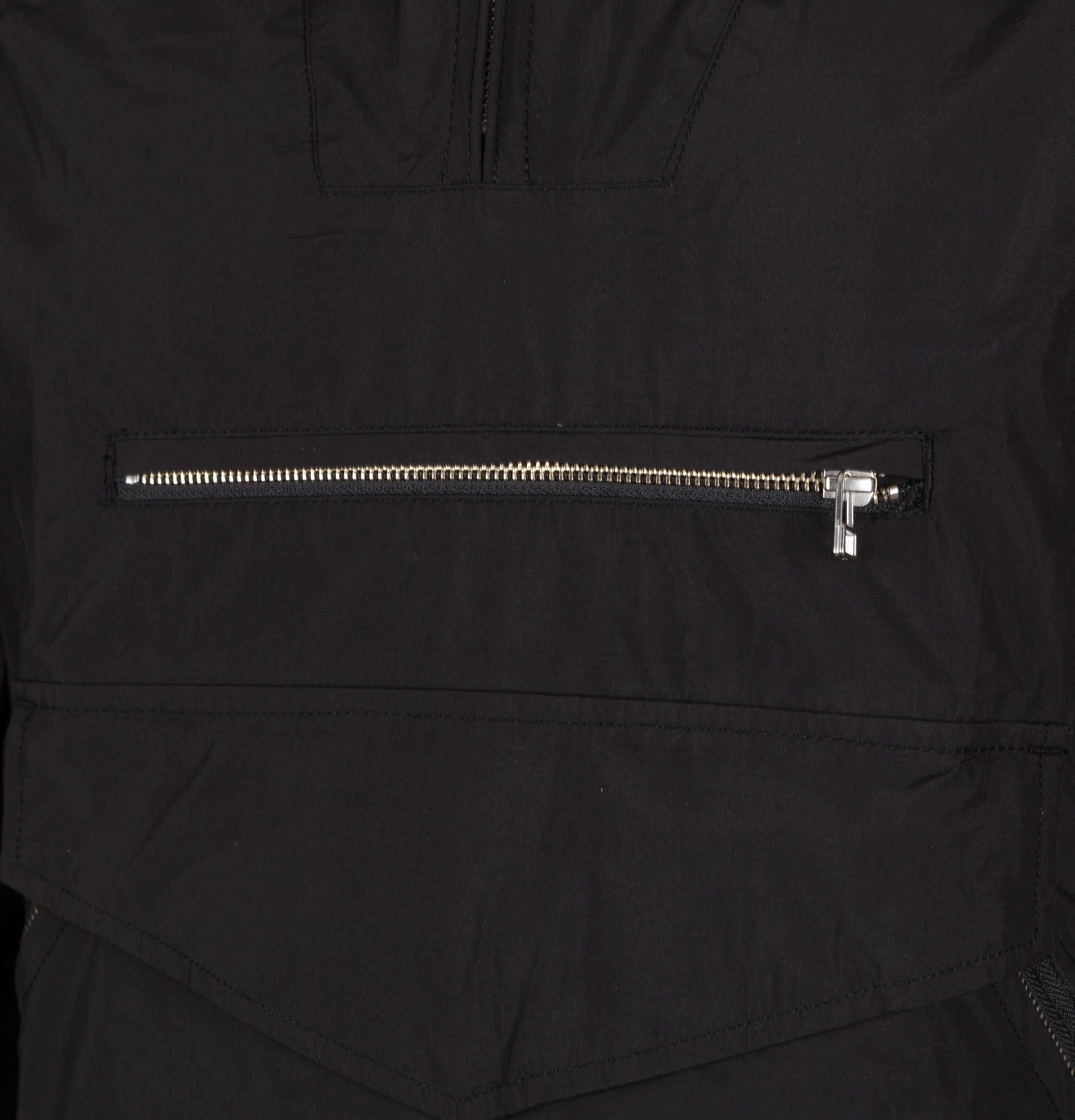 Pretty Green water resistant overhead hooded jacket. Black ultra lightweight polyester fabric. Half zip fastening on the front. Draw cord hood with metal eyelets. Front kangaroo pocket with side zips and pouch closure. Zip fastening front chest pocket. Adjustable draw cord hem. Air vent metal eyelets under the arms. Side zip seams. Functional back vent. Fully seam-sealed. Adjustable press stud sleeve cuffs. Embroidered Pretty Green badge on the right sleeve. Vintage paisley tag on the back of the neck. Regular fit. Composition — 100% Polyester. Machine washable.