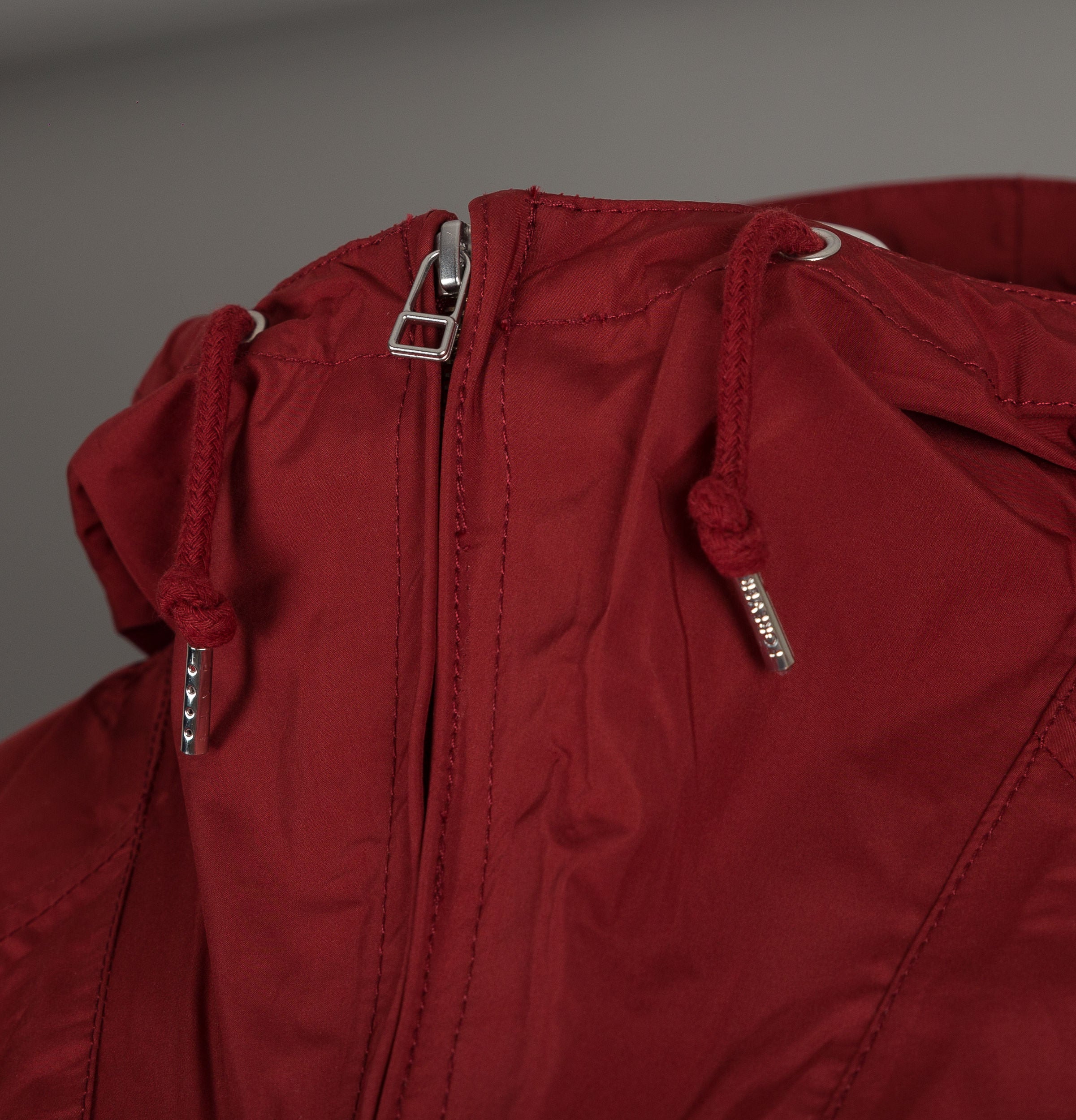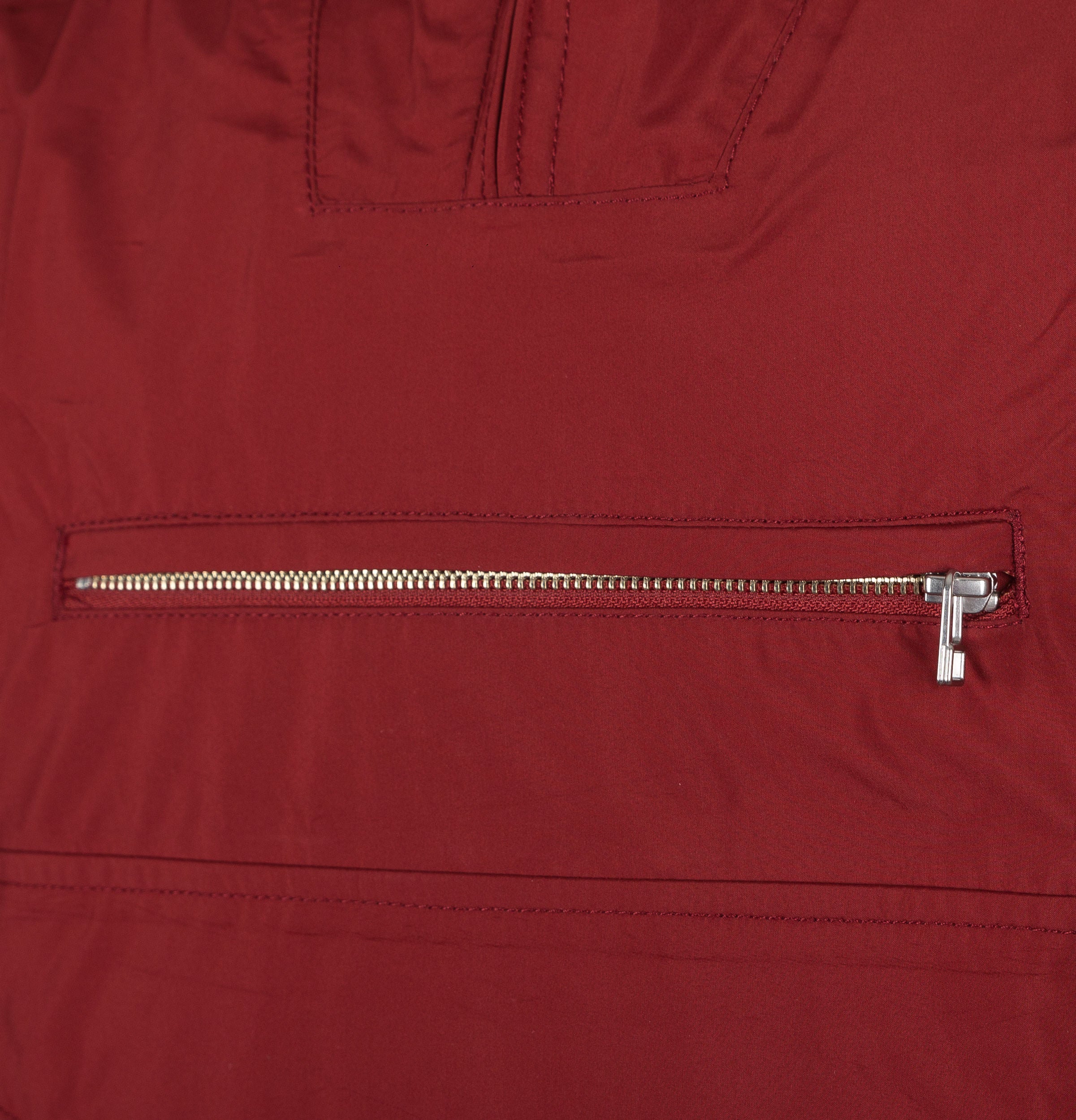 Pretty Green water resistant overhead hooded jacket. Dark Red ultra lightweight polyester fabric. Half zip fastening on the front. Draw cord hood with metal eyelets. Front kangaroo pocket with side zips and pouch closure. Zip fastening front chest pocket. Adjustable draw cord hem. Air vent metal eyelets under the arms. Side zip seams. Functional back vent. Fully seam-sealed. Adjustable press stud sleeve cuffs. Embroidered Pretty Green badge on the right sleeve. Vintage paisley tag on the back of the neck. Regular fit. Composition — 100% Polyester. Machine washable.