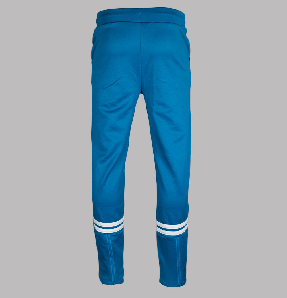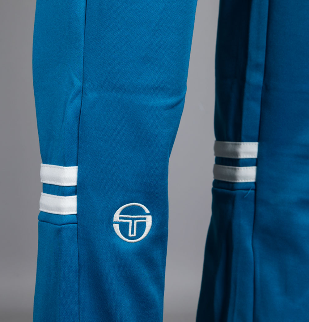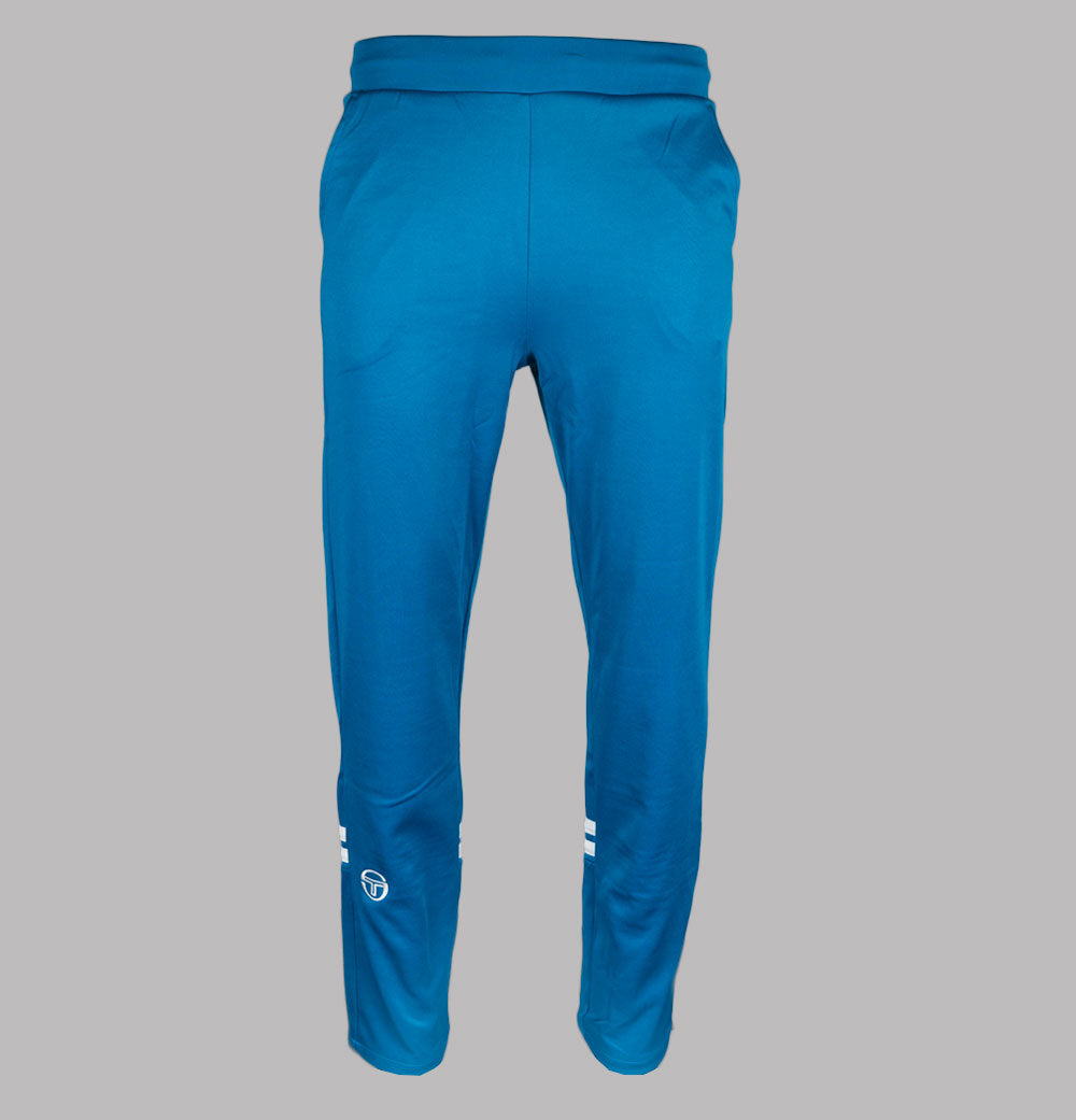 Sergio Tacchini Orion track pants in Mykonos Blue/Gardenia. Polyester/cotton blend fabric. Internal draw cord waistband. Front pockets. Open cuff legs with back zip detail. Twin panel detail and embroidered Sergio Tacchini logo. Regular fit waist and legs. 60% polyester, 40% cotton.