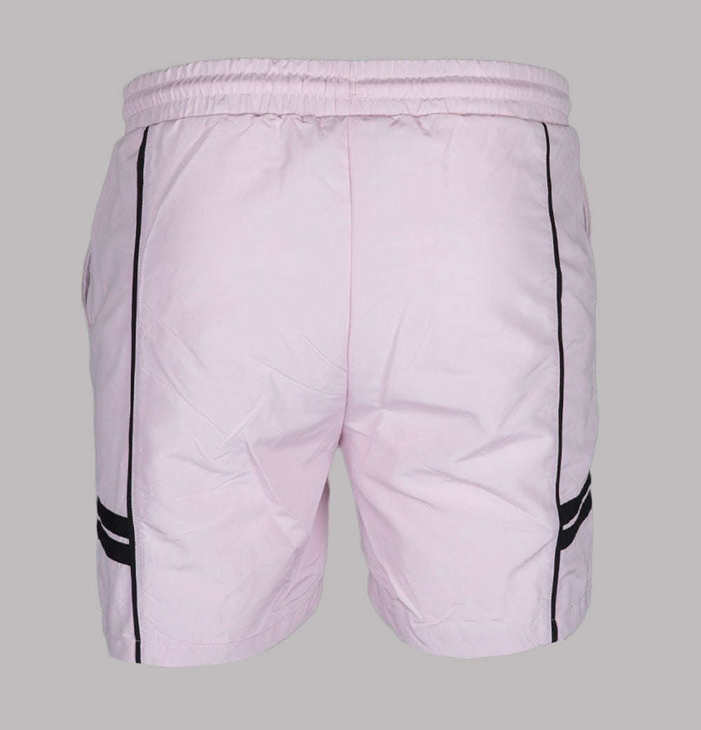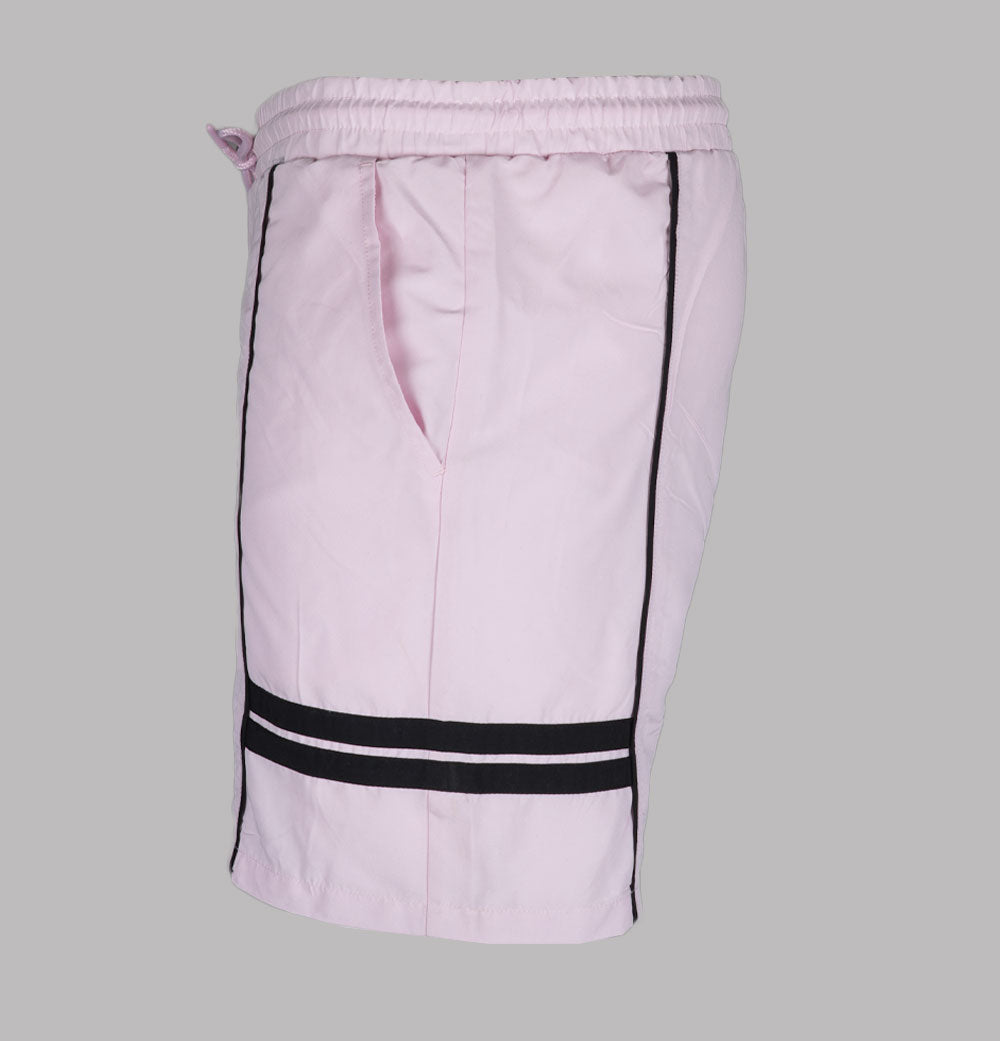 Sergio Tacchini Romolo swim shorts in Light Lilac/Black. Lightweight polyester fabric. Elasticated waistband with adjustable draw cord. Front pockets. Panel detail on the legs. Embroidered Sergio Tacchini logo. Mesh lining. Slim fit. 100% polyester.